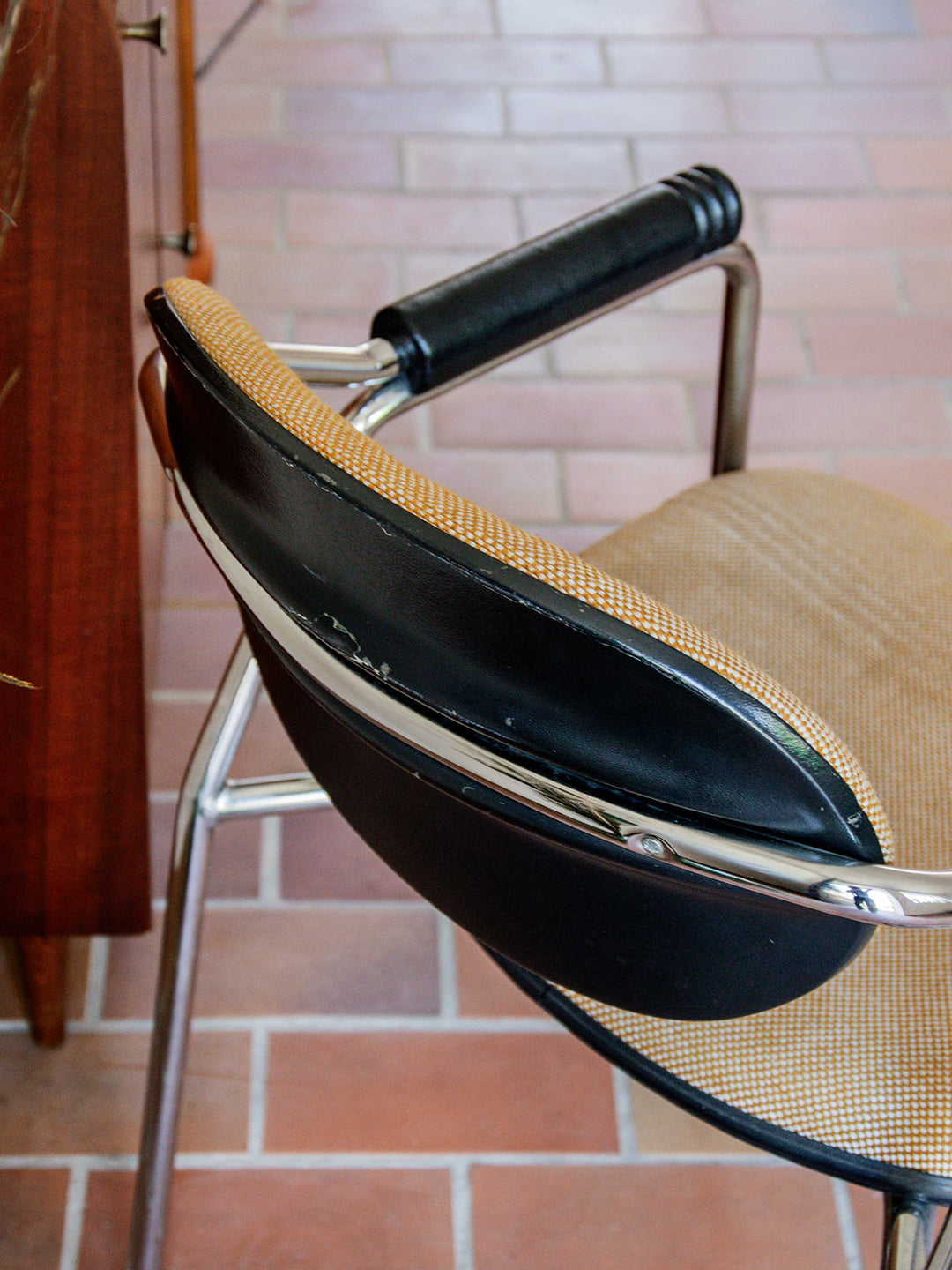 Discover this retro-style armchair, combining comfort and lightness. Its fabric seat and backrest rest on a sturdy yet discreet tubular metal frame. The faux leather armrests add a touch of contrast and finesse. Ideal for a living room or reading nook, it adapts easily to a variety of interiors. An armchair with a simple and warm design, ready to blend into your home.
