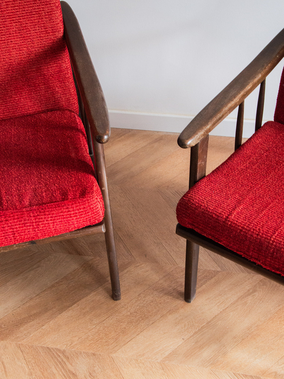 Discover this pair of elegant and comfortable red armchairs with a Scandinavian design. Their dark wood frame adds warmth and contrast, highlighting the refined character of the ensemble. The generous, slightly inclined seats invite relaxation. Their understated, timeless style easily adapts to any interior. These pieces are ideal for combining comfort, aesthetics, and Nordic authenticity.
