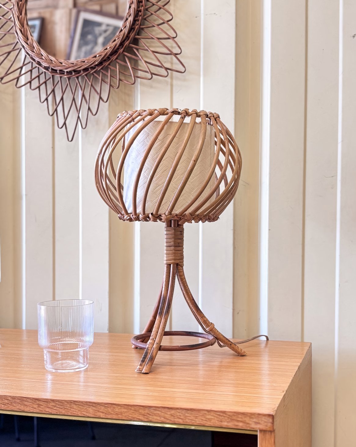Discover the vintage rattan lamp, inspired by the spirit of Louis Sognot, which will bring a warm and nostalgic touch to your home. With its elegant design and soft lines, this unique piece stylishly illuminates your space while evoking the charm of period furniture. Liven up your decor with this handcrafted piece, perfect for creating a cozy and refined ambiance in your home.