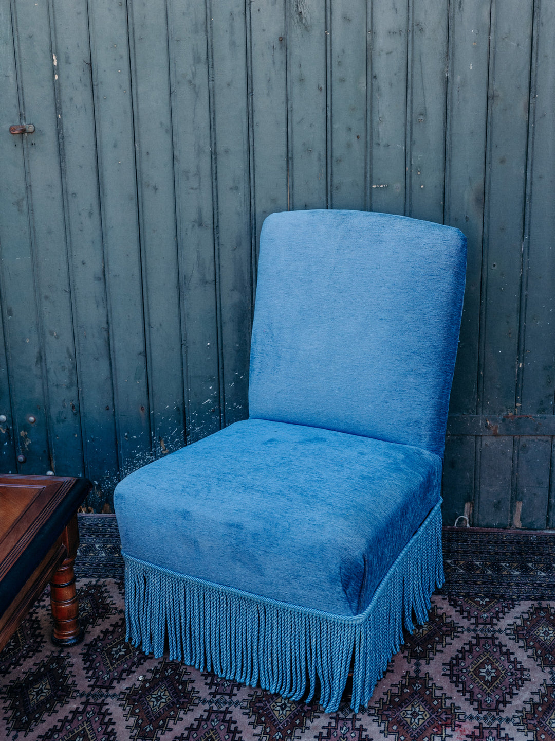 Discover our blue velvet fireside chair, a true asset to any decor. Its decorative fringes add a touch of sophistication, while its armless design gives it great versatility. Its comfort, combined with its vintage character, allows it to bring a unique touch of elegance to your home. Although some signs of age bear witness to its history, this pair remains a must-have to enhance your space. Sold separately, two available.