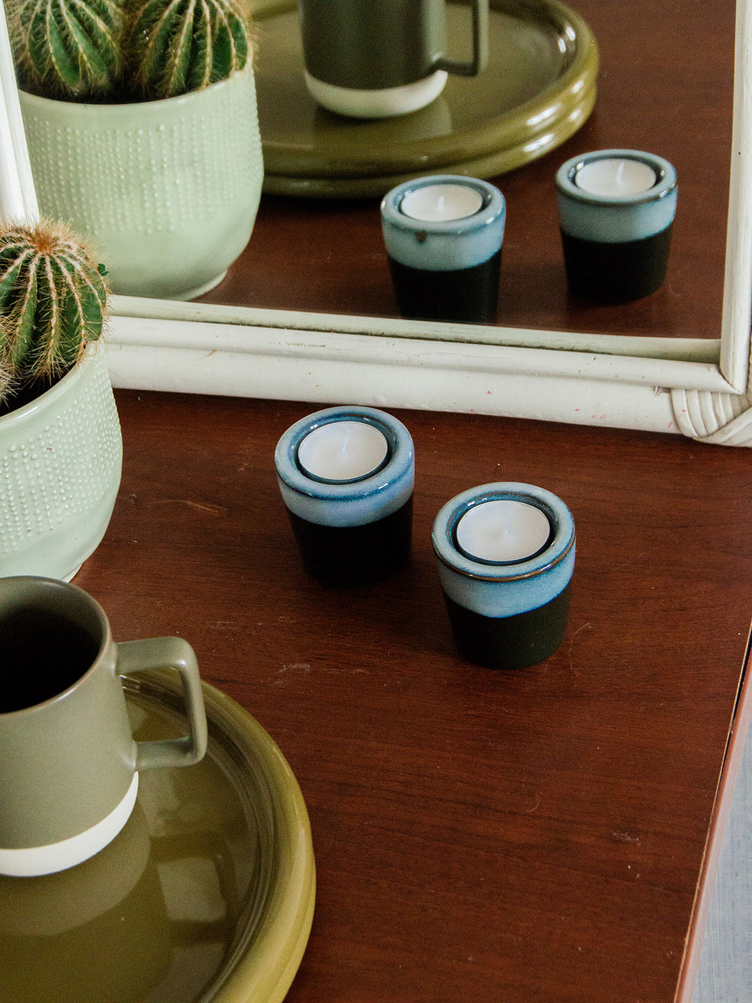 Bring a touch of elegance to your home with this pair of earthenware tealight holders, enhanced by a beautiful black and blue-grey glazed ceramic effect. These refined pieces diffuse a soft, warm light while adding an artistic touch to your decor. Perfect for creating an intimate ambiance, they pair beautifully with other decorative objects to create a harmonious and characterful atmosphere.