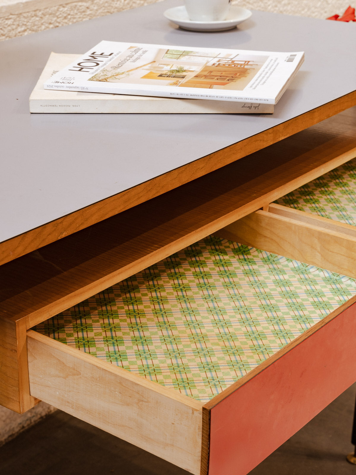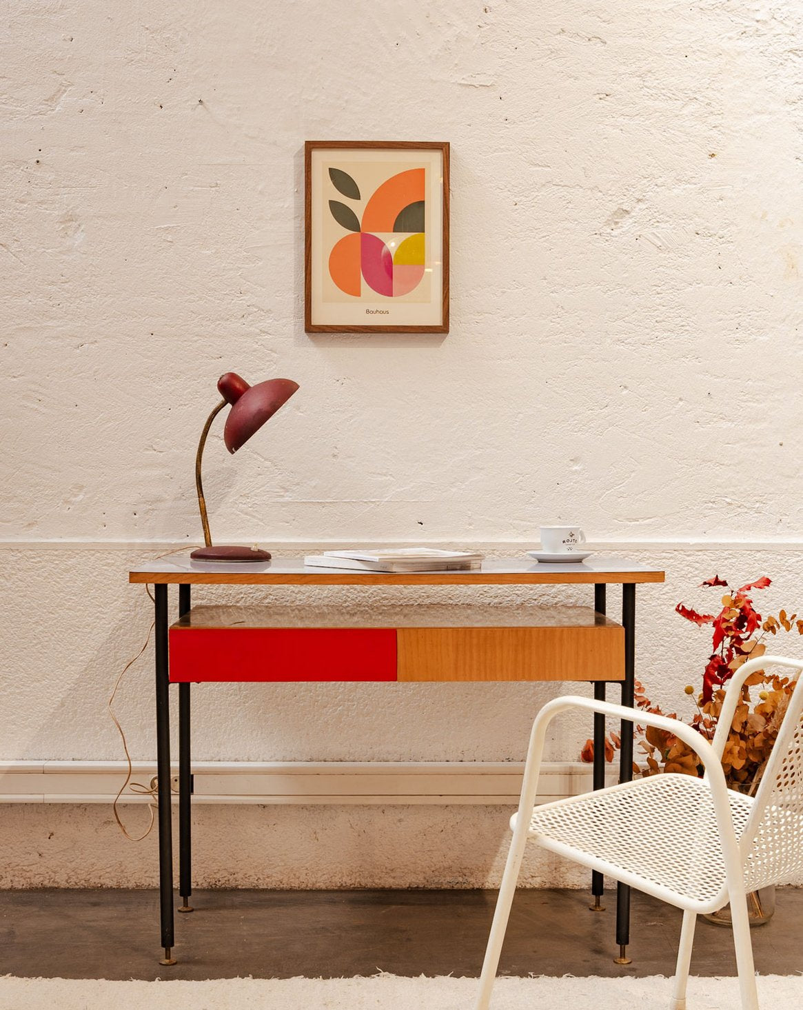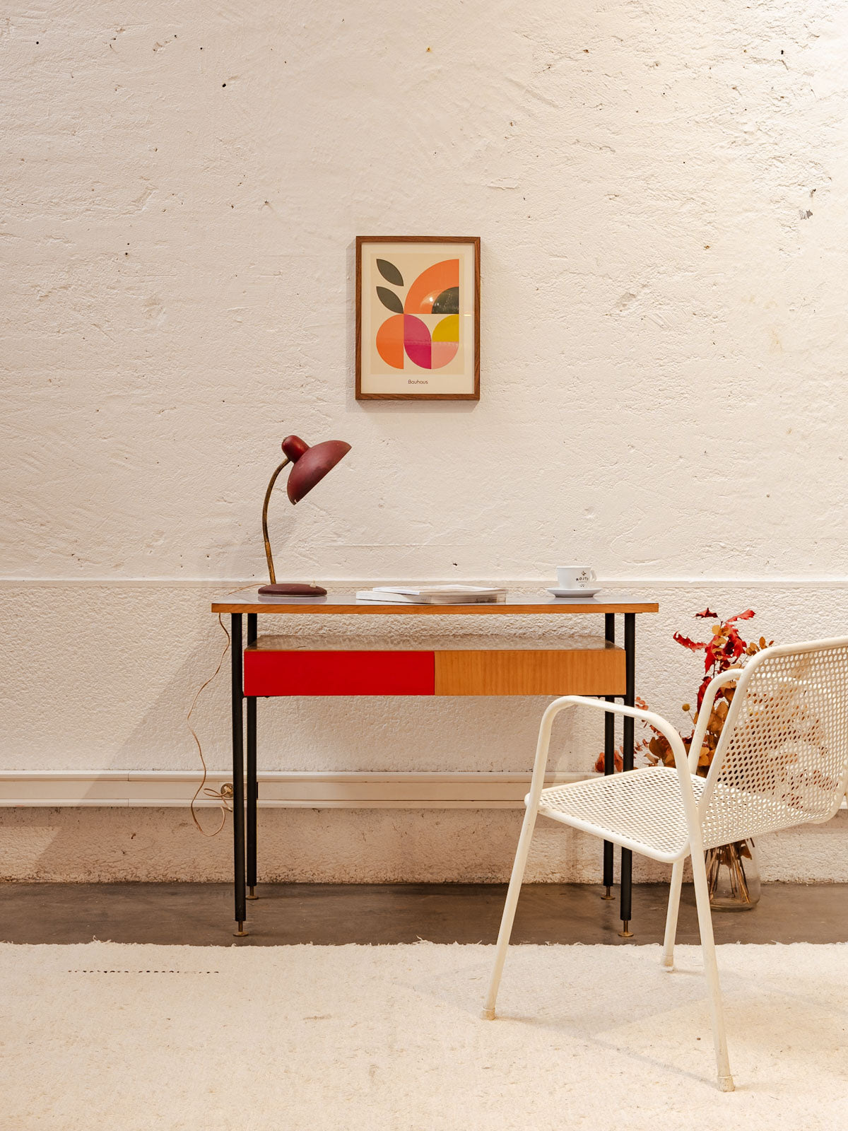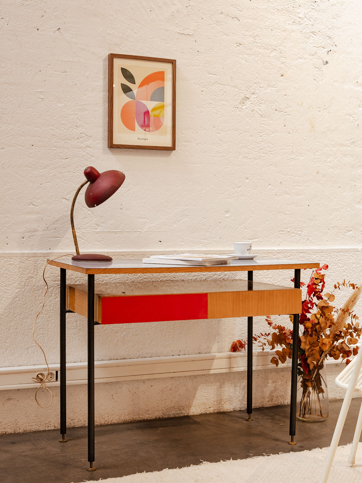 Transform your workspace with this boldly designed two-tone desk. Its lacquered wood top in shades of red, brown, and blue adds a pop of color, while its black metal frame and brass-finished legs add a touch of contemporary elegance. Practical and functional, it features a drawer for storing your essentials, combining style and practicality in a piece that's both aesthetically pleasing and modern.