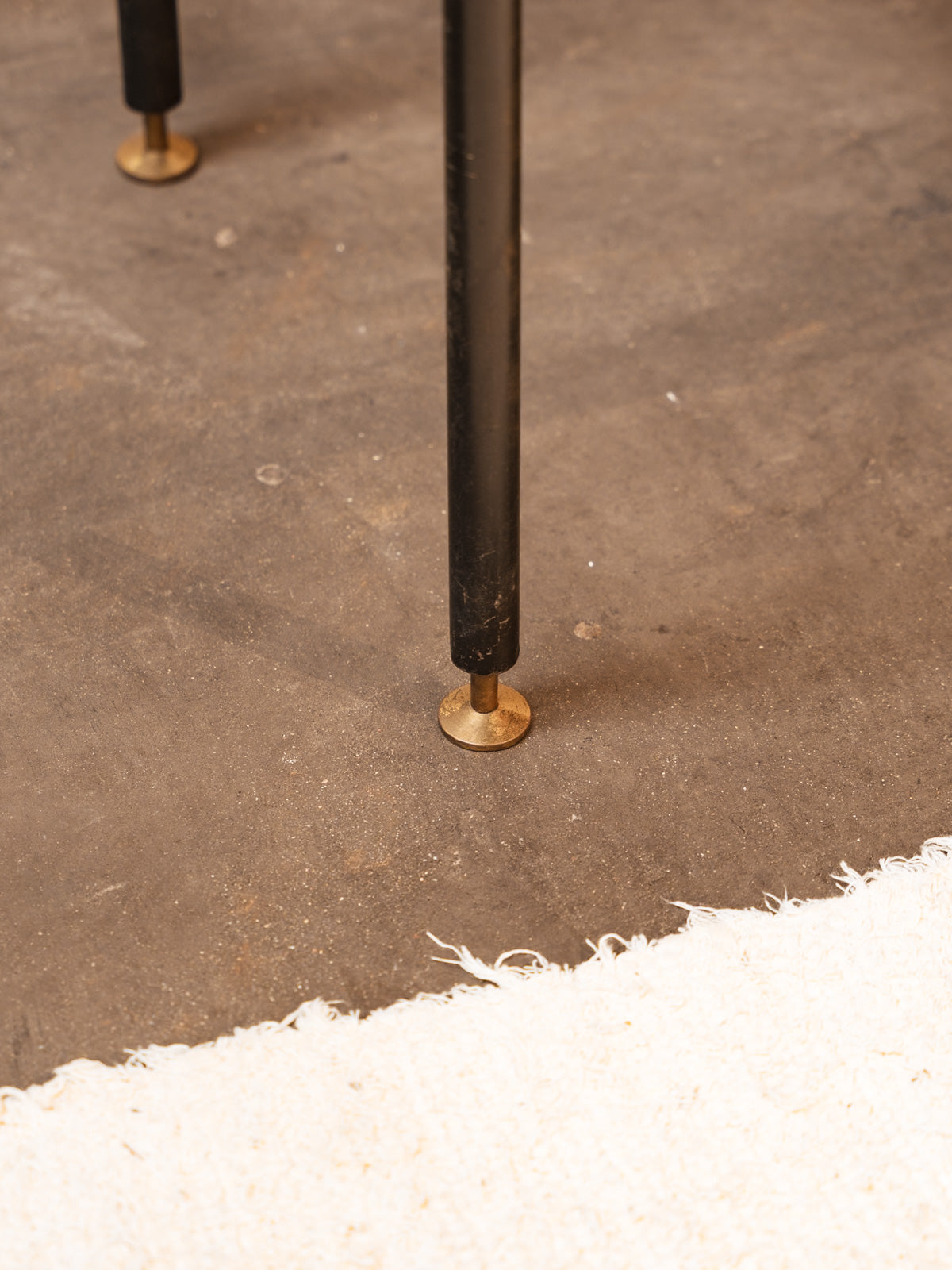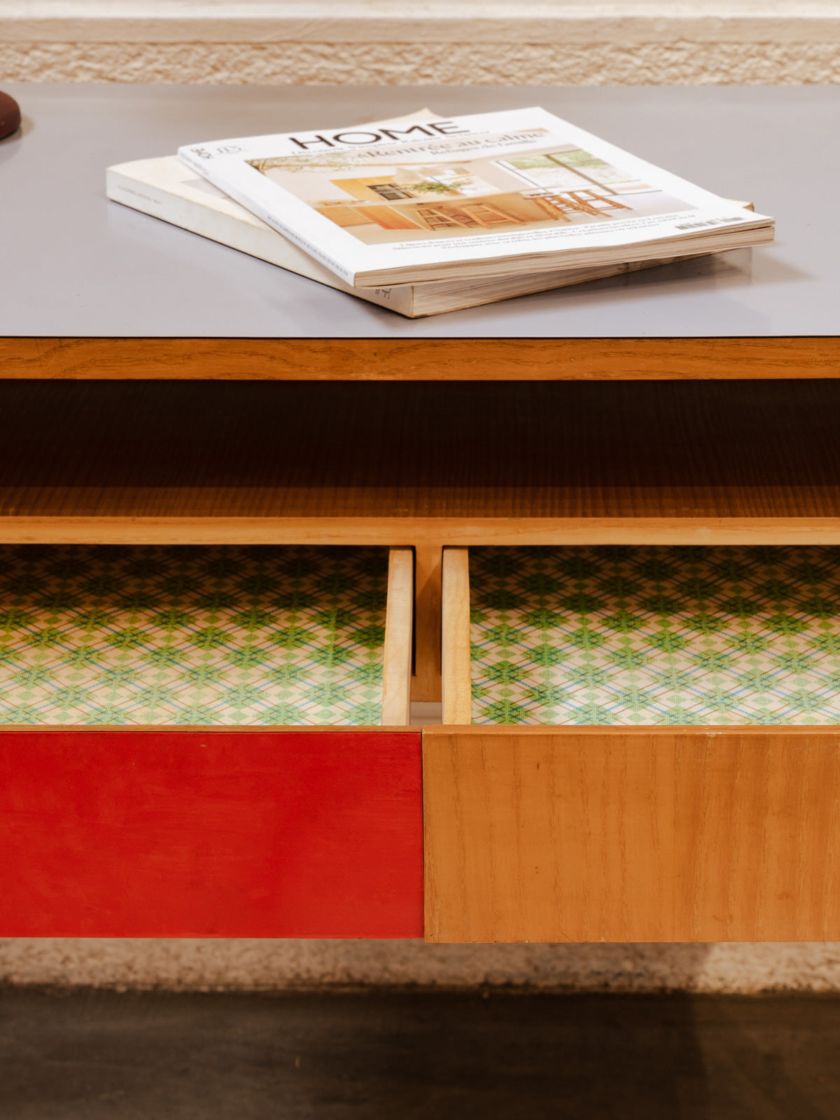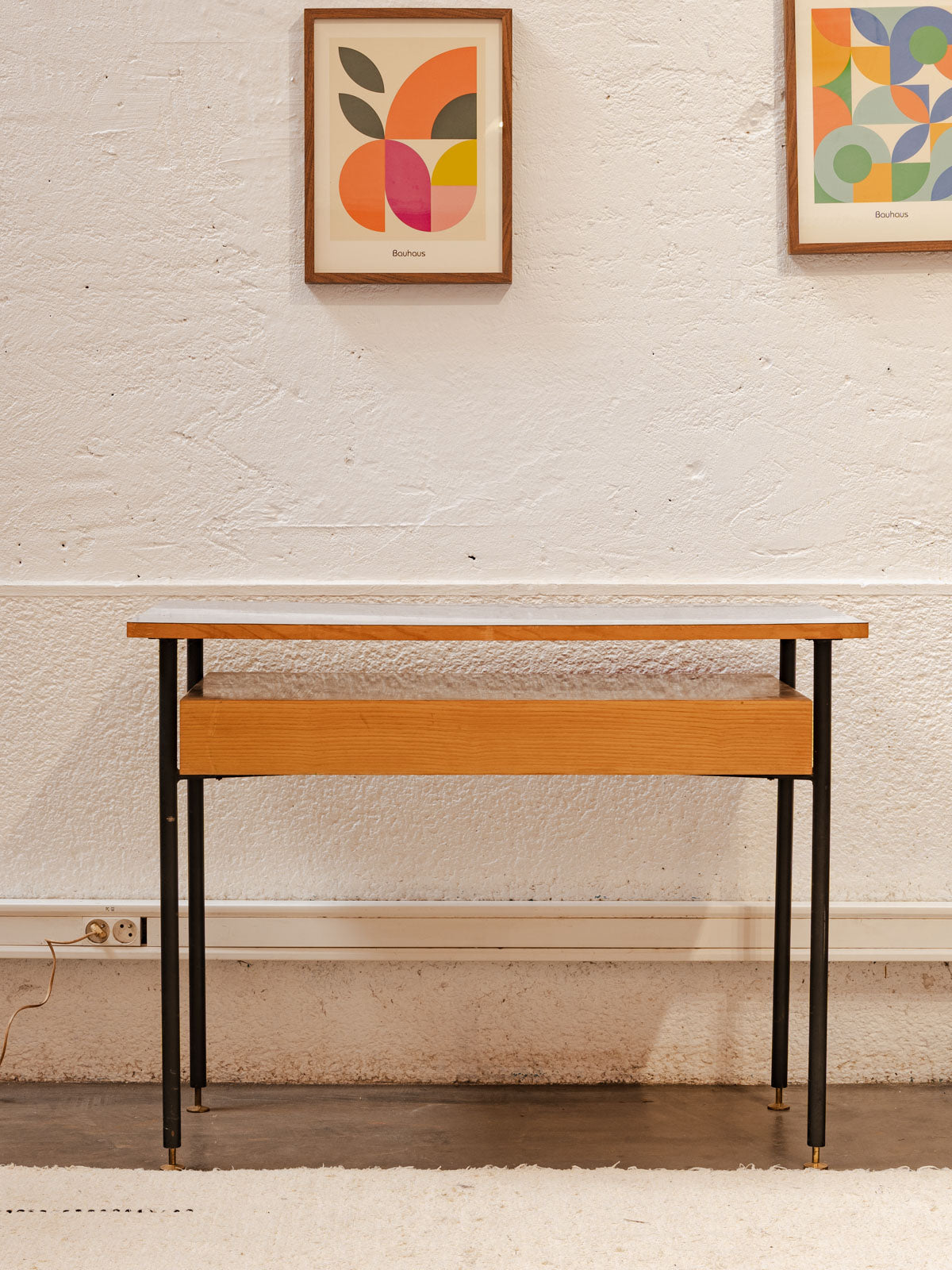 Transform your workspace with this boldly designed two-tone desk. Its lacquered wood top in shades of red, brown, and blue adds a pop of color, while its black metal frame and brass-finished legs add a touch of contemporary elegance. Practical and functional, it features a drawer for storing your essentials, combining style and practicality in a piece that's both aesthetically pleasing and modern.