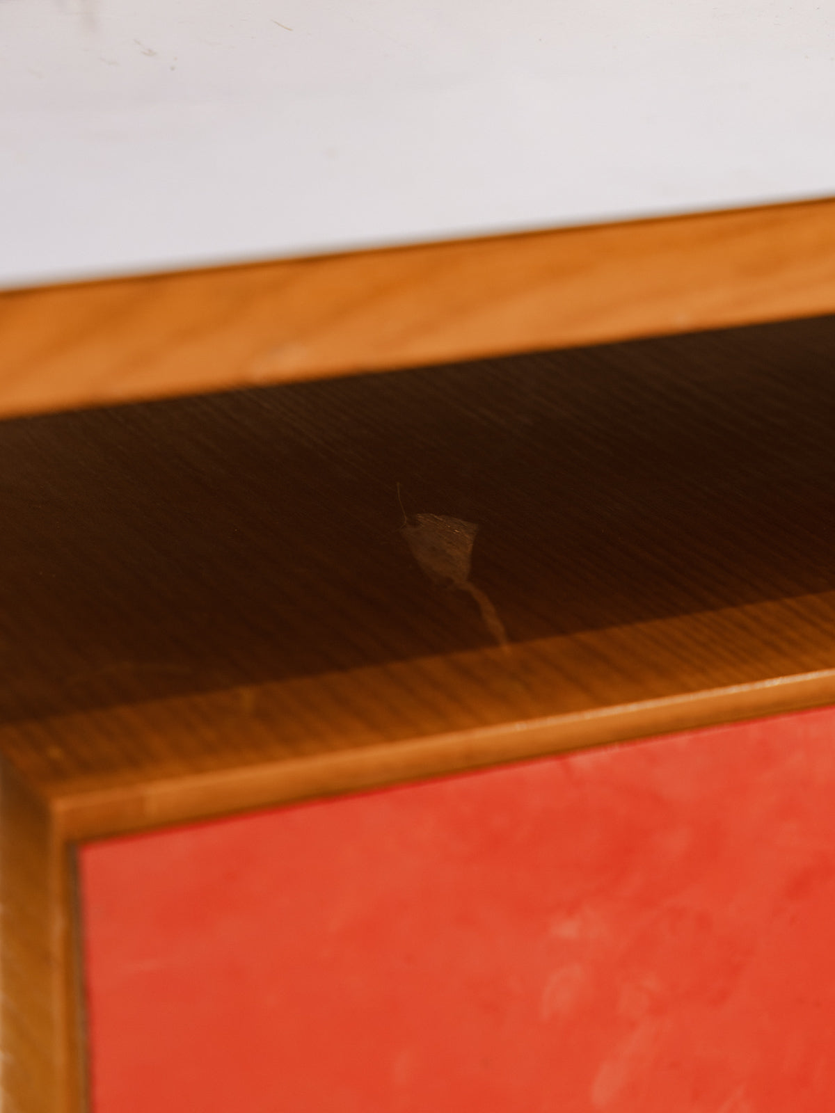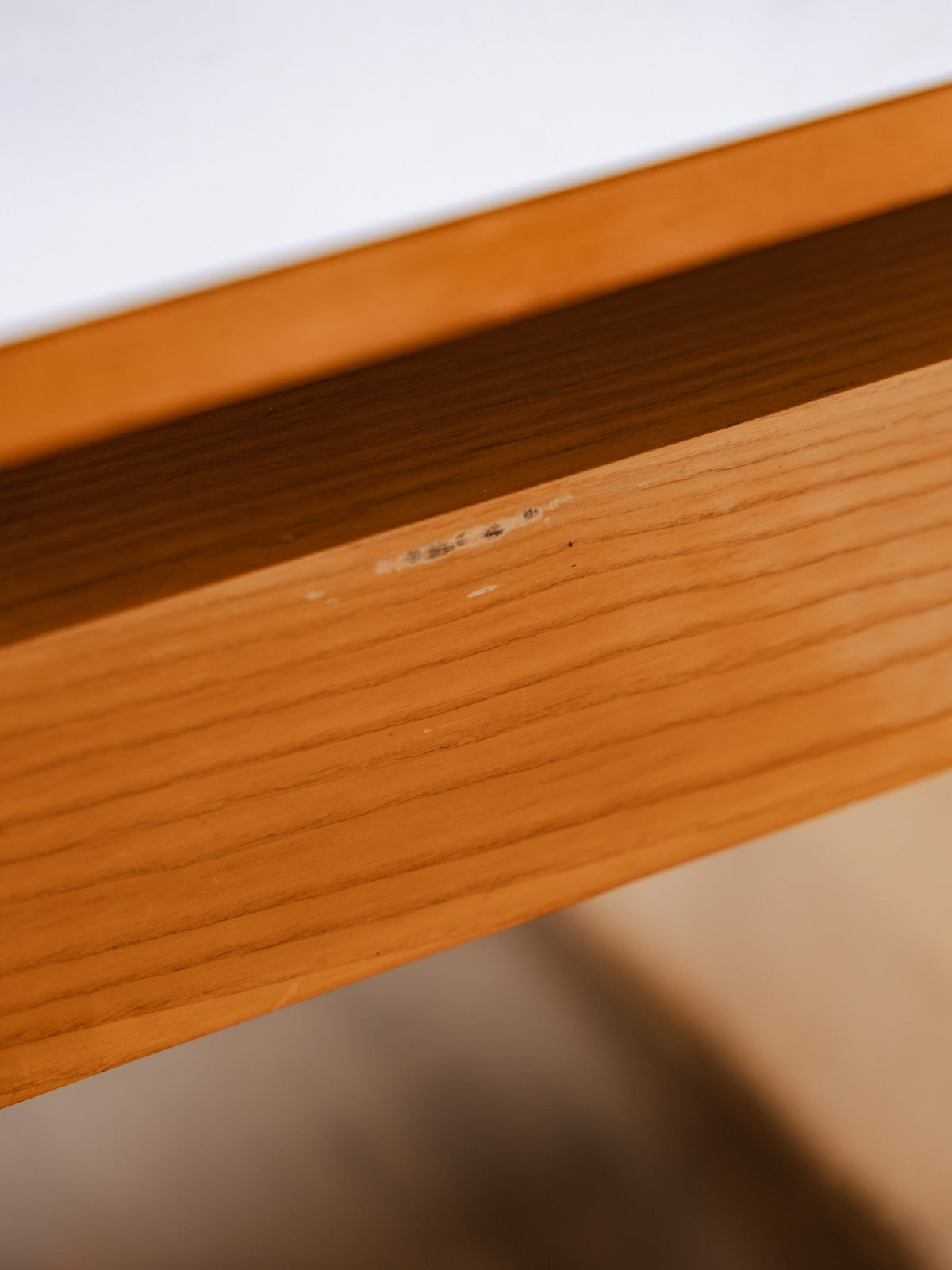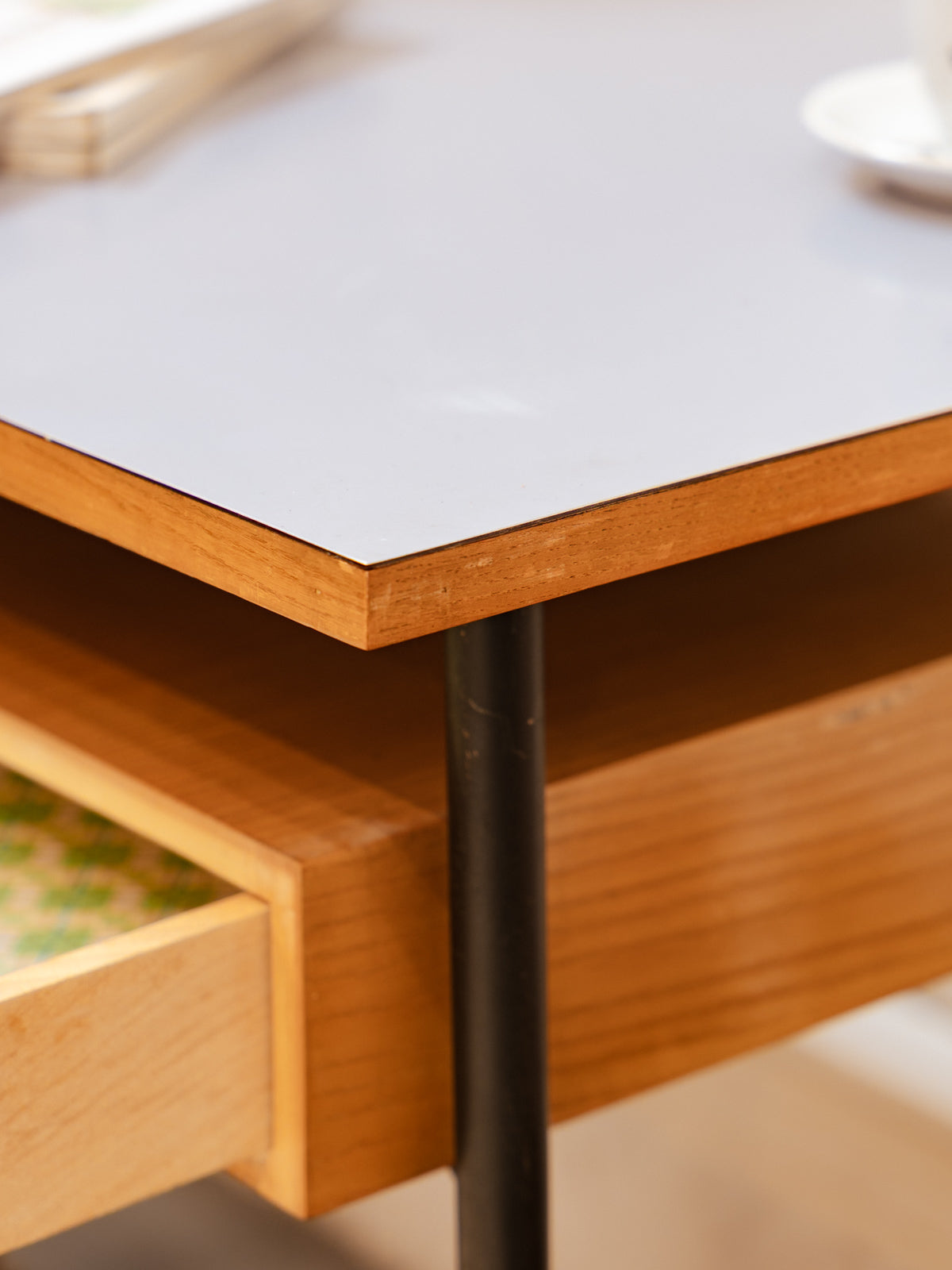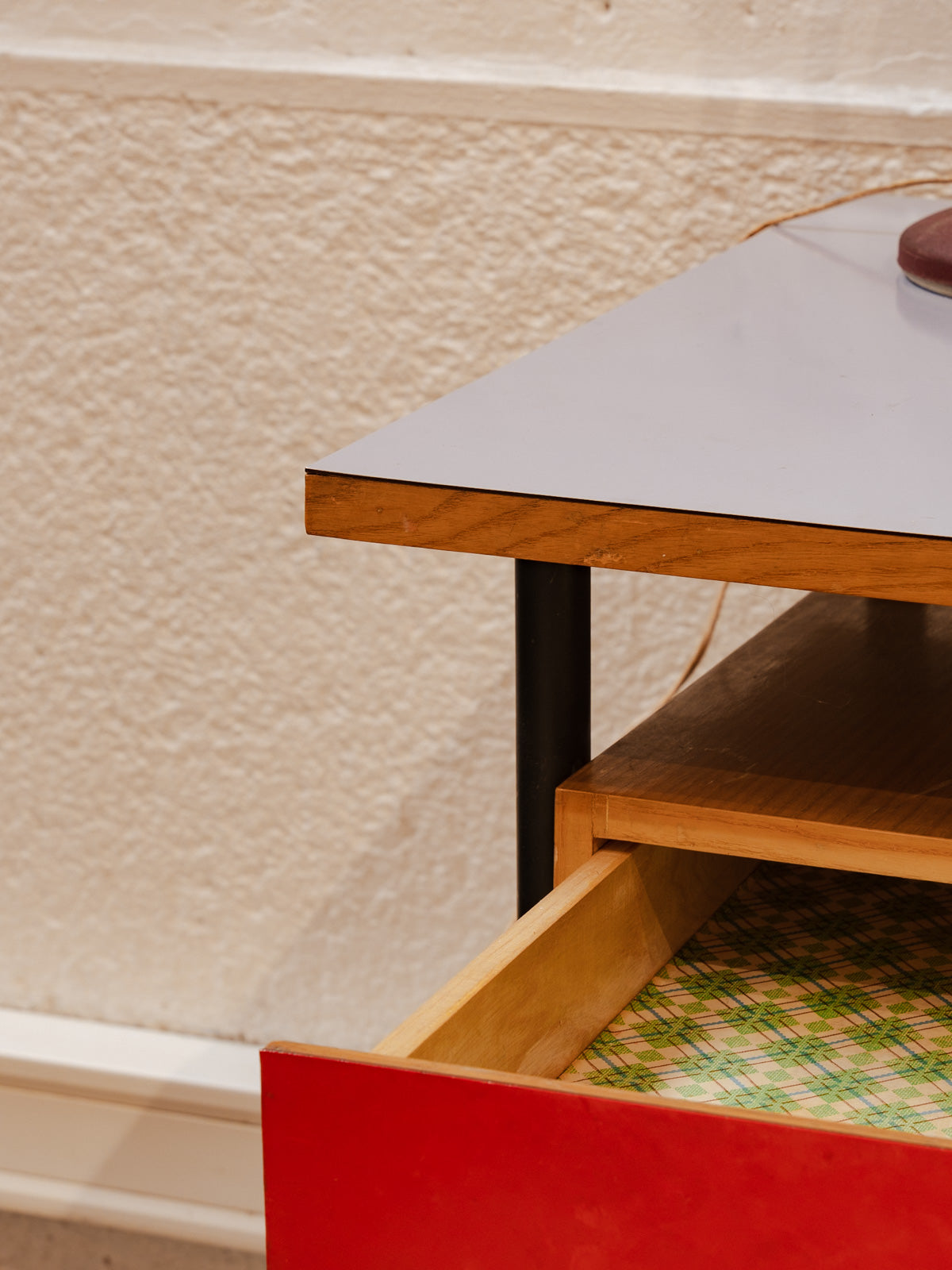 Transform your workspace with this boldly designed two-tone desk. Its lacquered wood top in shades of red, brown, and blue adds a pop of color, while its black metal frame and brass-finished legs add a touch of contemporary elegance. Practical and functional, it features a drawer for storing your essentials, combining style and practicality in a piece that's both aesthetically pleasing and modern.