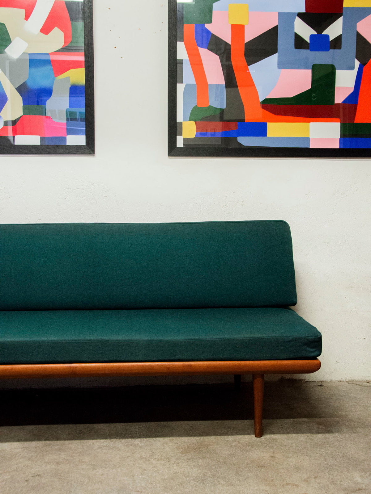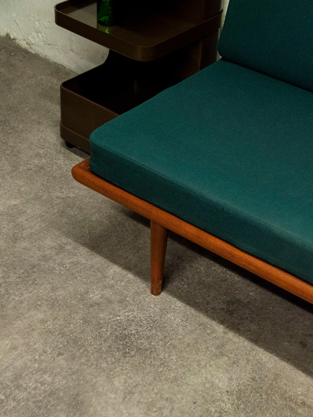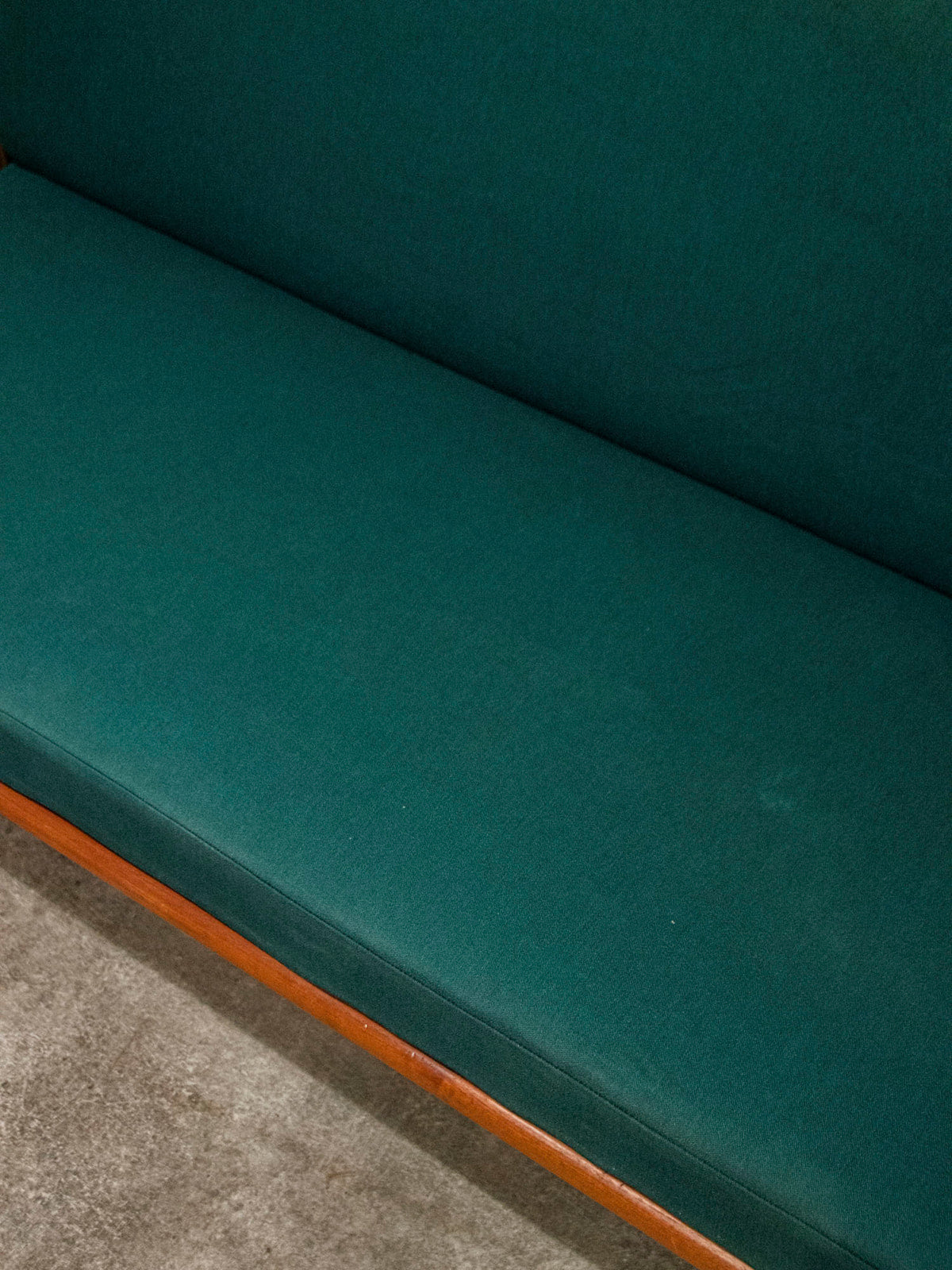 Discover the "Minerva" daybed, designed by Peter Hvidt and Olga Molgaard Nielsen for France and Son, an iconic piece from the 1960s. Carefully crafted in Denmark, its teak frame combines robustness and elegance. This three-seater bench, in very good overall condition despite some slight signs of age, features fully removable cushions upholstered in the original emerald green fabric. Practical and aesthetic, this model also comes with its manufacturer's plaque and serial number, a guarantee of authenticity.