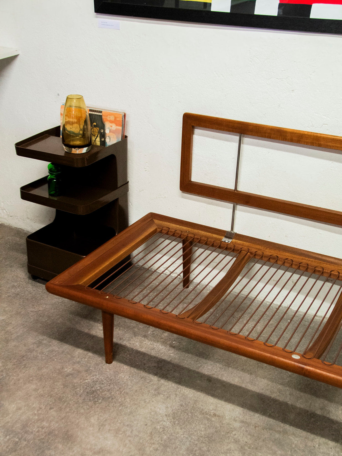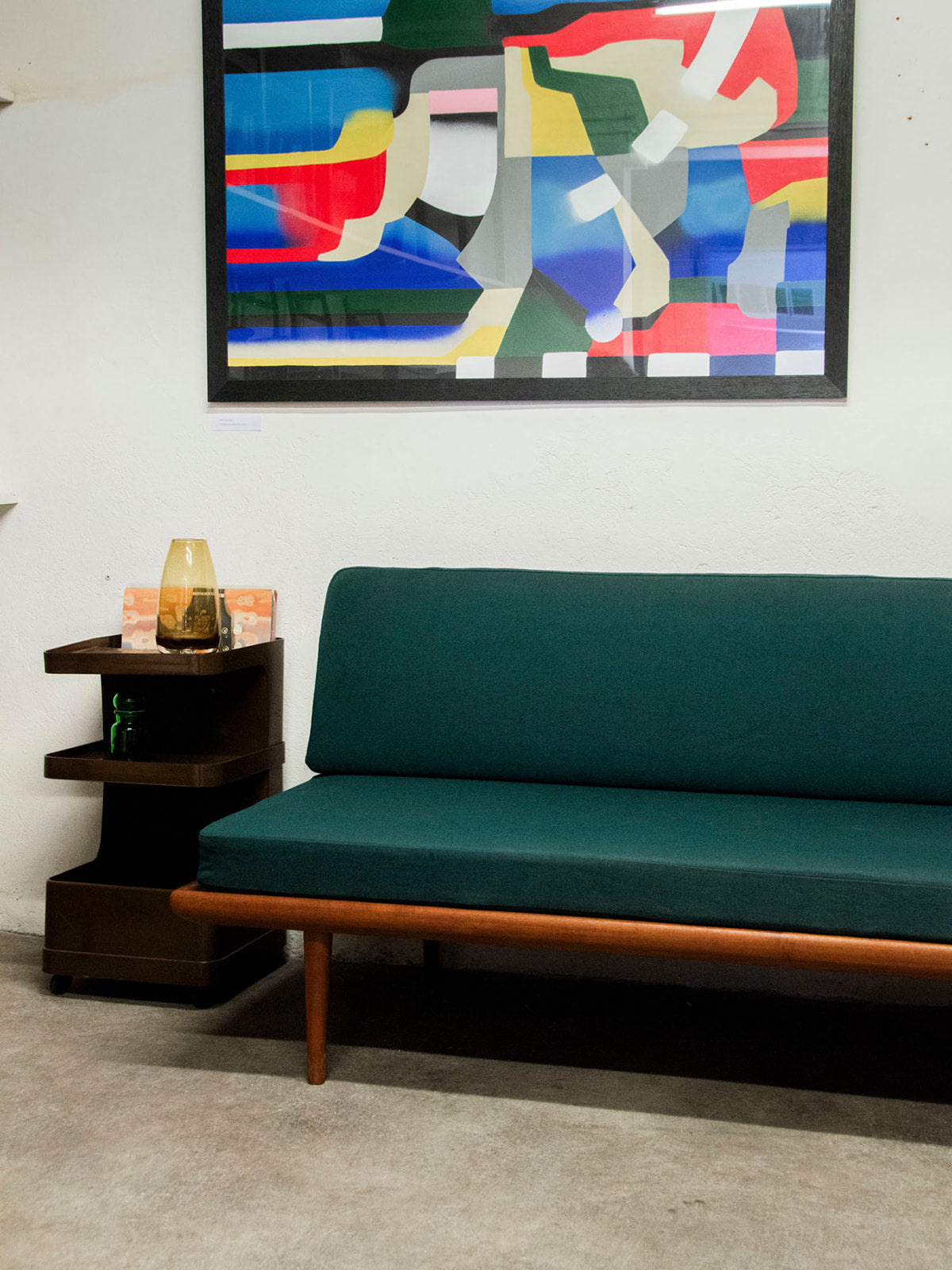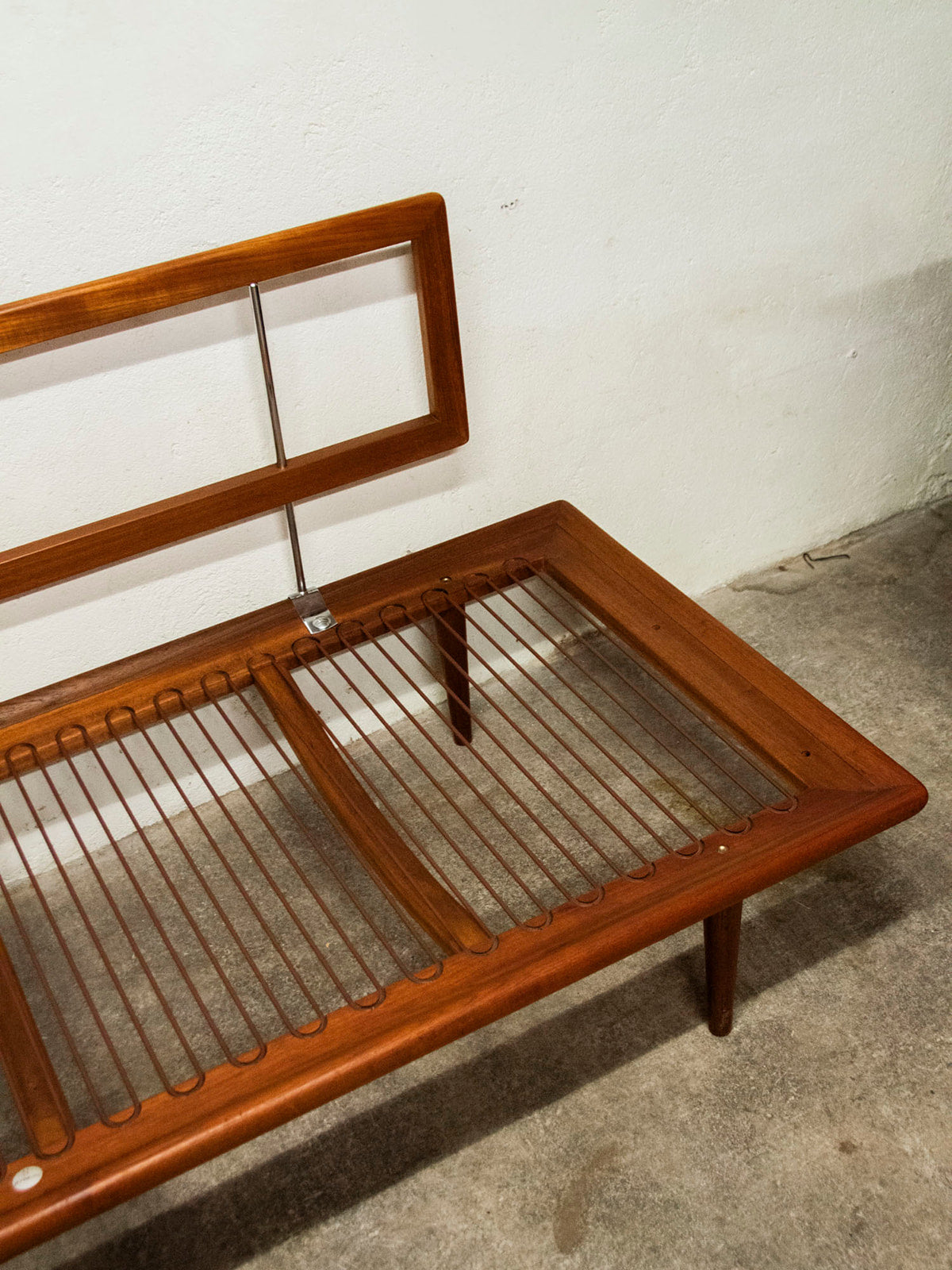 Discover the "Minerva" daybed, designed by Peter Hvidt and Olga Molgaard Nielsen for France and Son, an iconic piece from the 1960s. Carefully crafted in Denmark, its teak frame combines robustness and elegance. This three-seater bench, in very good overall condition despite some slight signs of age, features fully removable cushions upholstered in the original emerald green fabric. Practical and aesthetic, this model also comes with its manufacturer's plaque and serial number, a guarantee of authenticity.