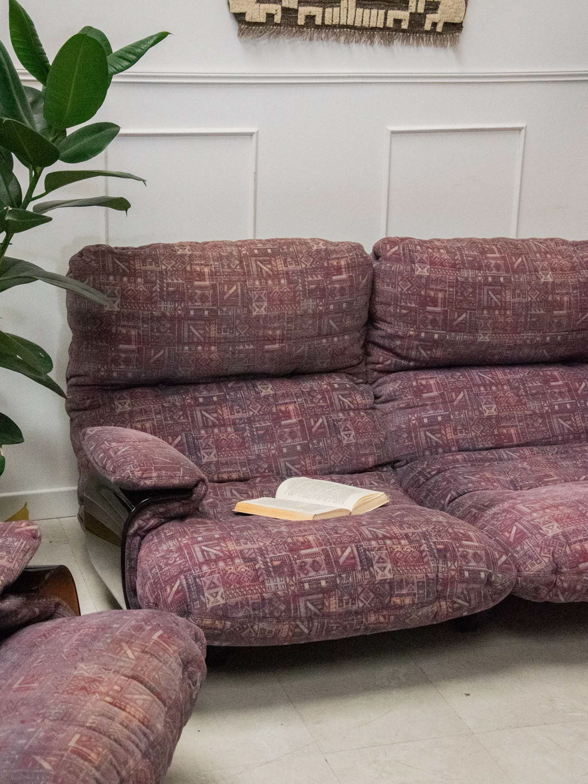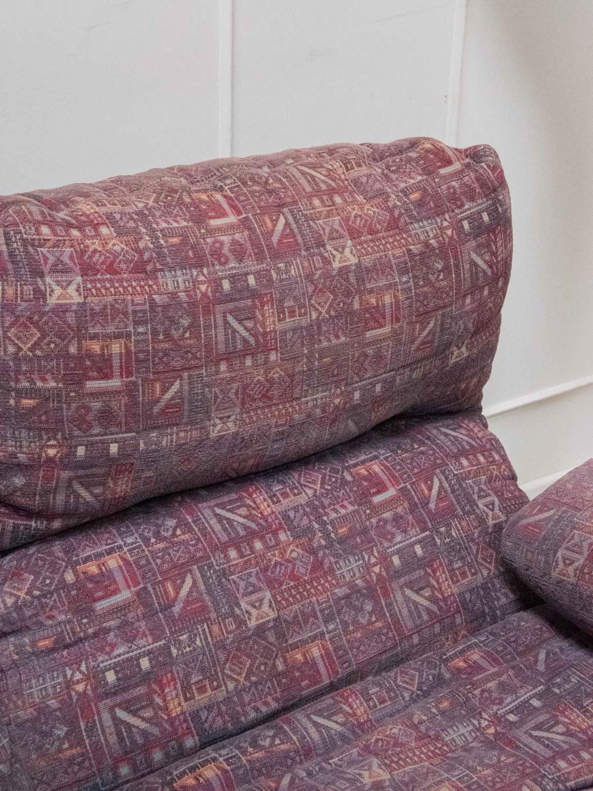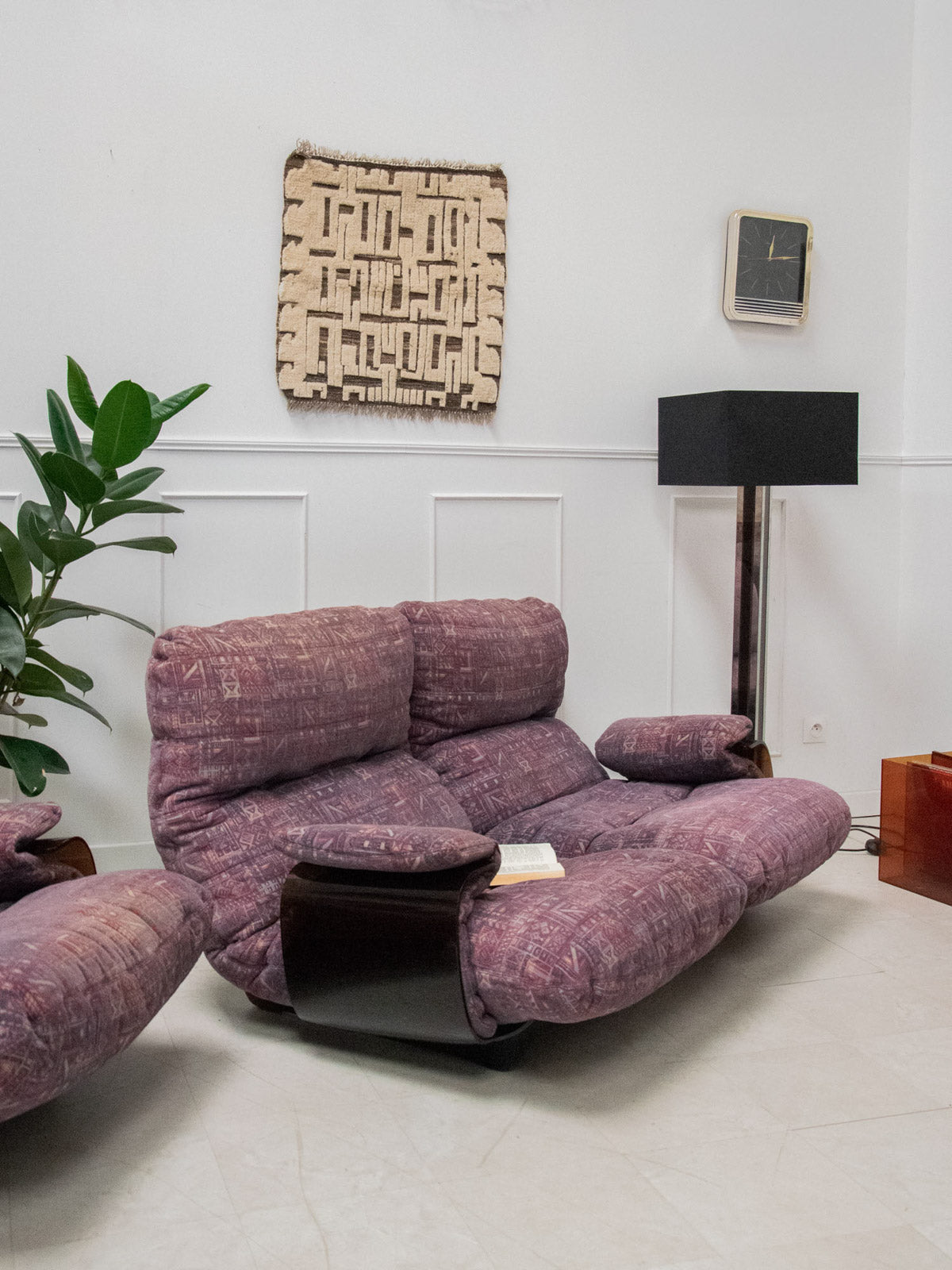 Discover this vintage Marsala 2-seater sofa, designed by Michel Ducaroy for Ligne Roset in the early 1970s. Its thermoformed brown smoked plexiglass frame brings a touch of originality and modernity to your interior. Upholstered in a plum-toned patterned fabric, this sofa shows some signs of wear, testifying to its history. With its comfortable seat, it combines retro style and ergonomics for unforgettable moments of relaxation.