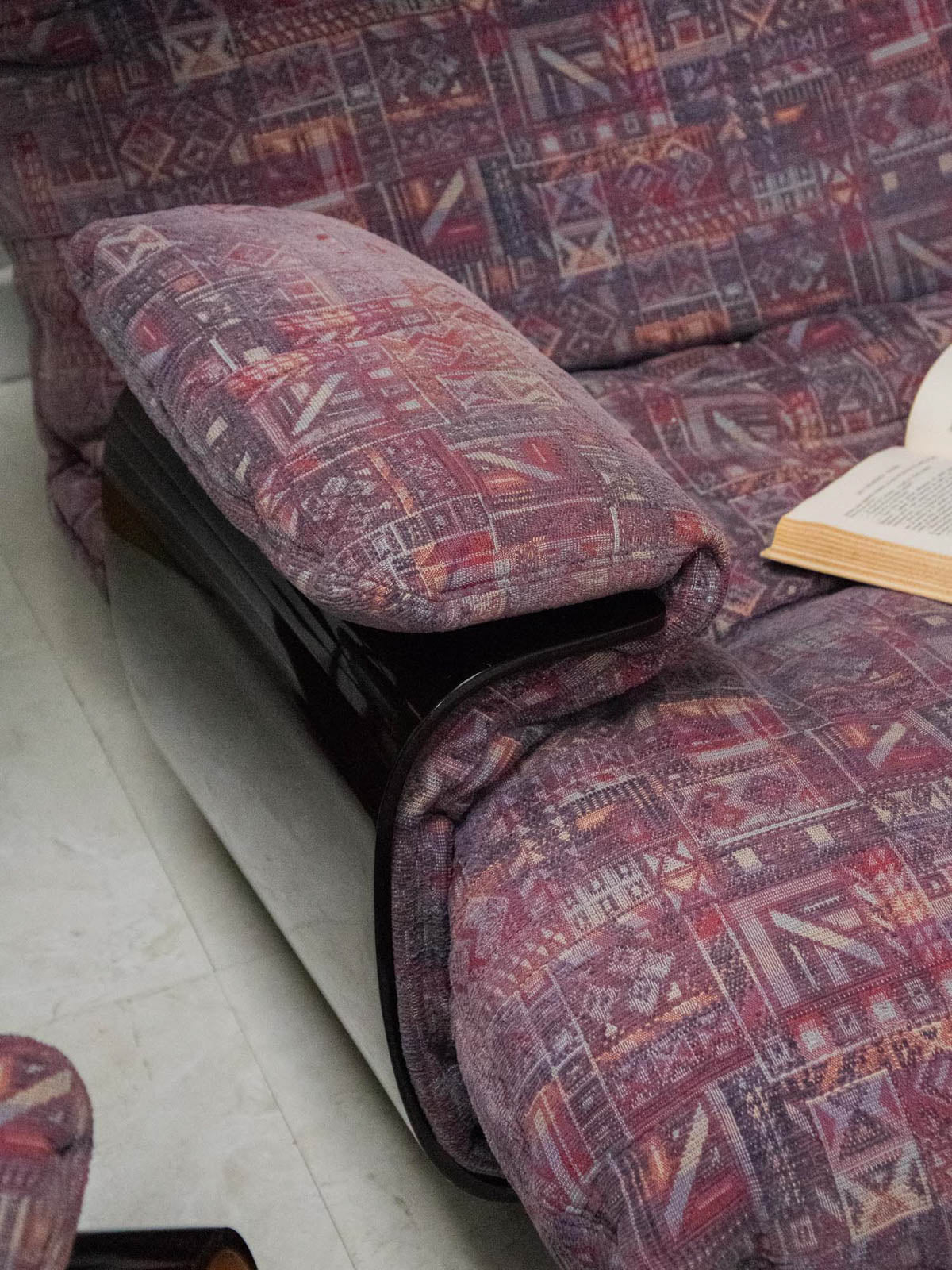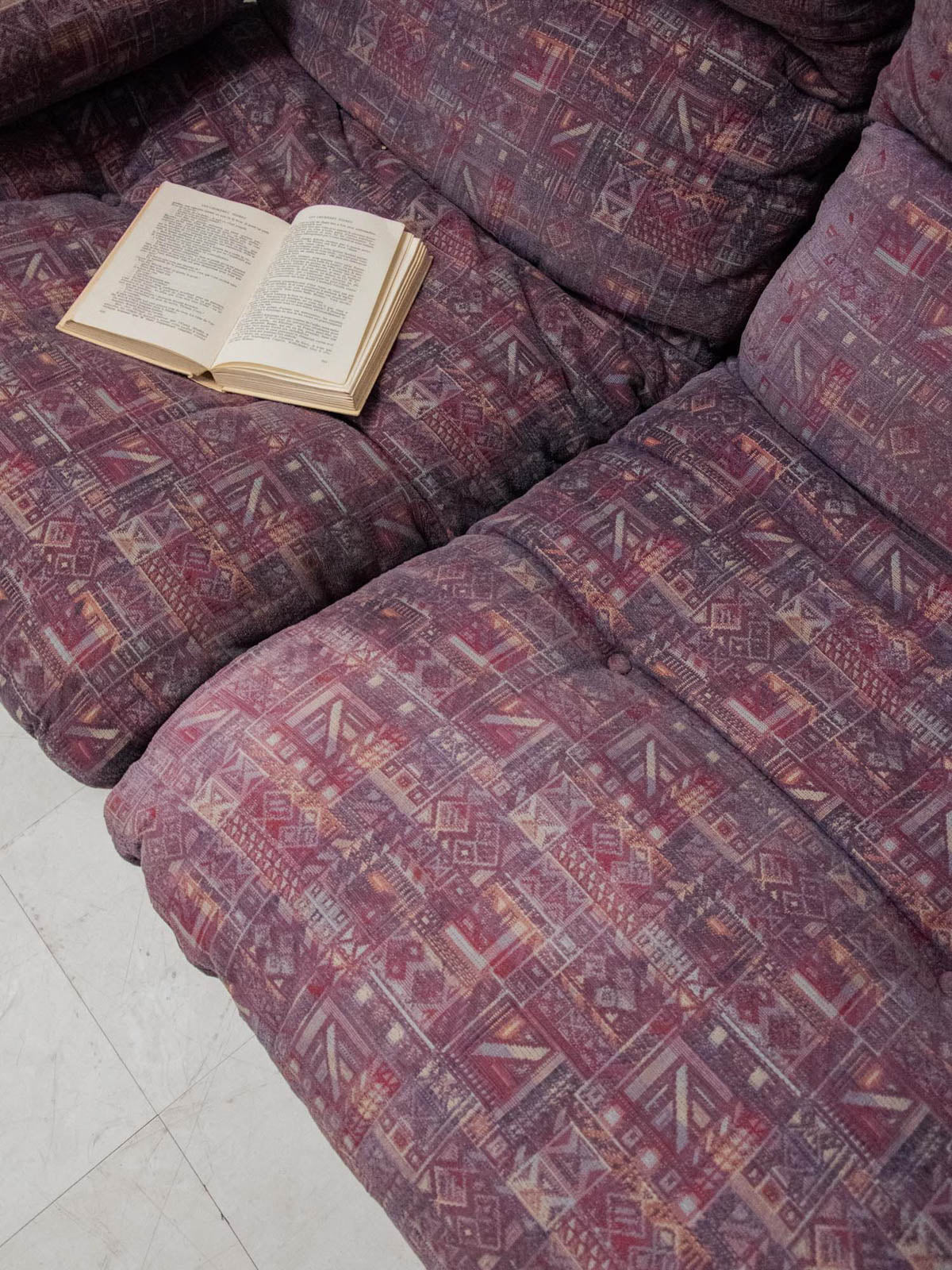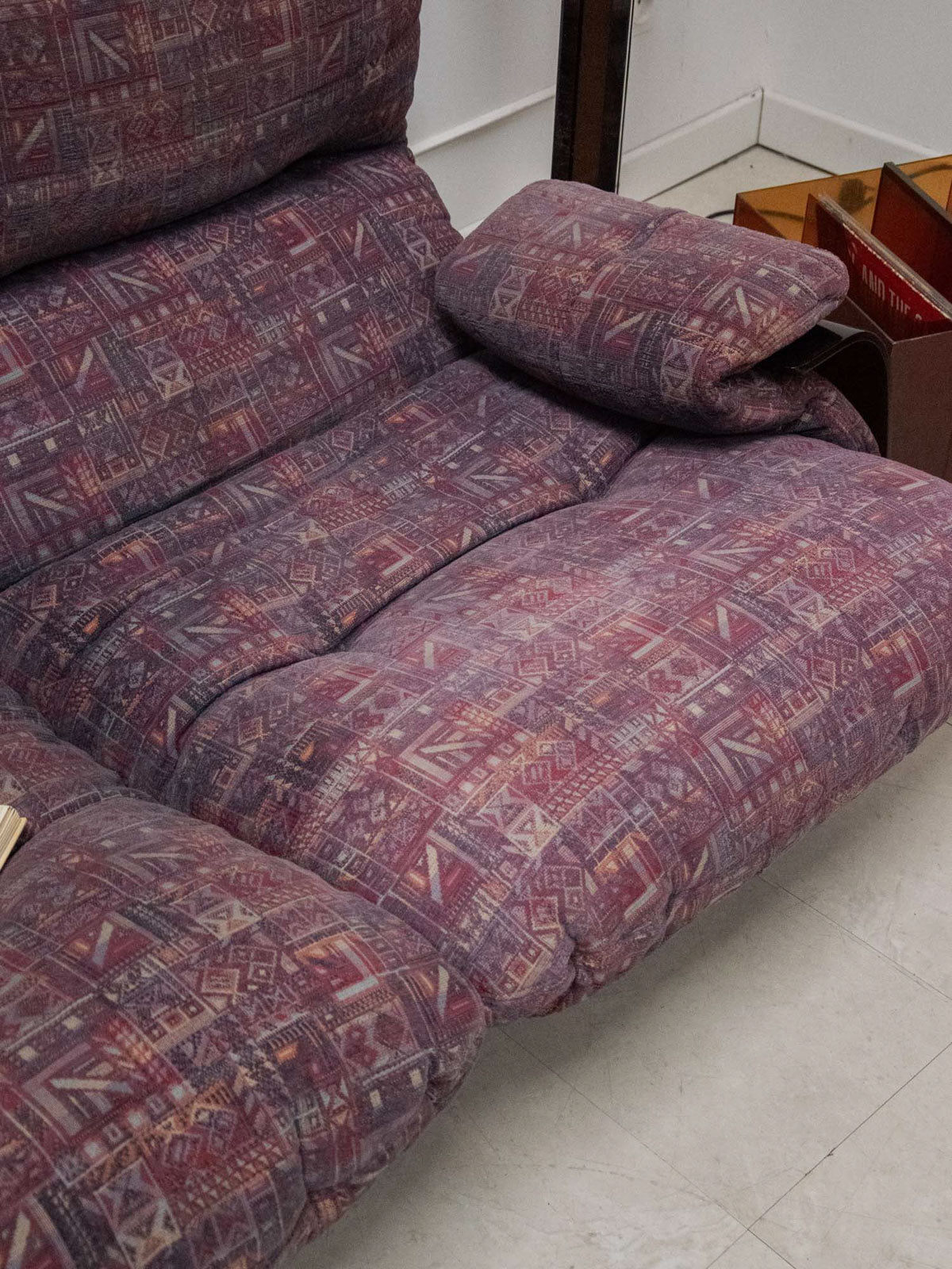 Discover this vintage Marsala 2-seater sofa, designed by Michel Ducaroy for Ligne Roset in the early 1970s. Its thermoformed brown smoked plexiglass frame brings a touch of originality and modernity to your interior. Upholstered in a plum-toned patterned fabric, this sofa shows some signs of wear, testifying to its history. With its comfortable seat, it combines retro style and ergonomics for unforgettable moments of relaxation.