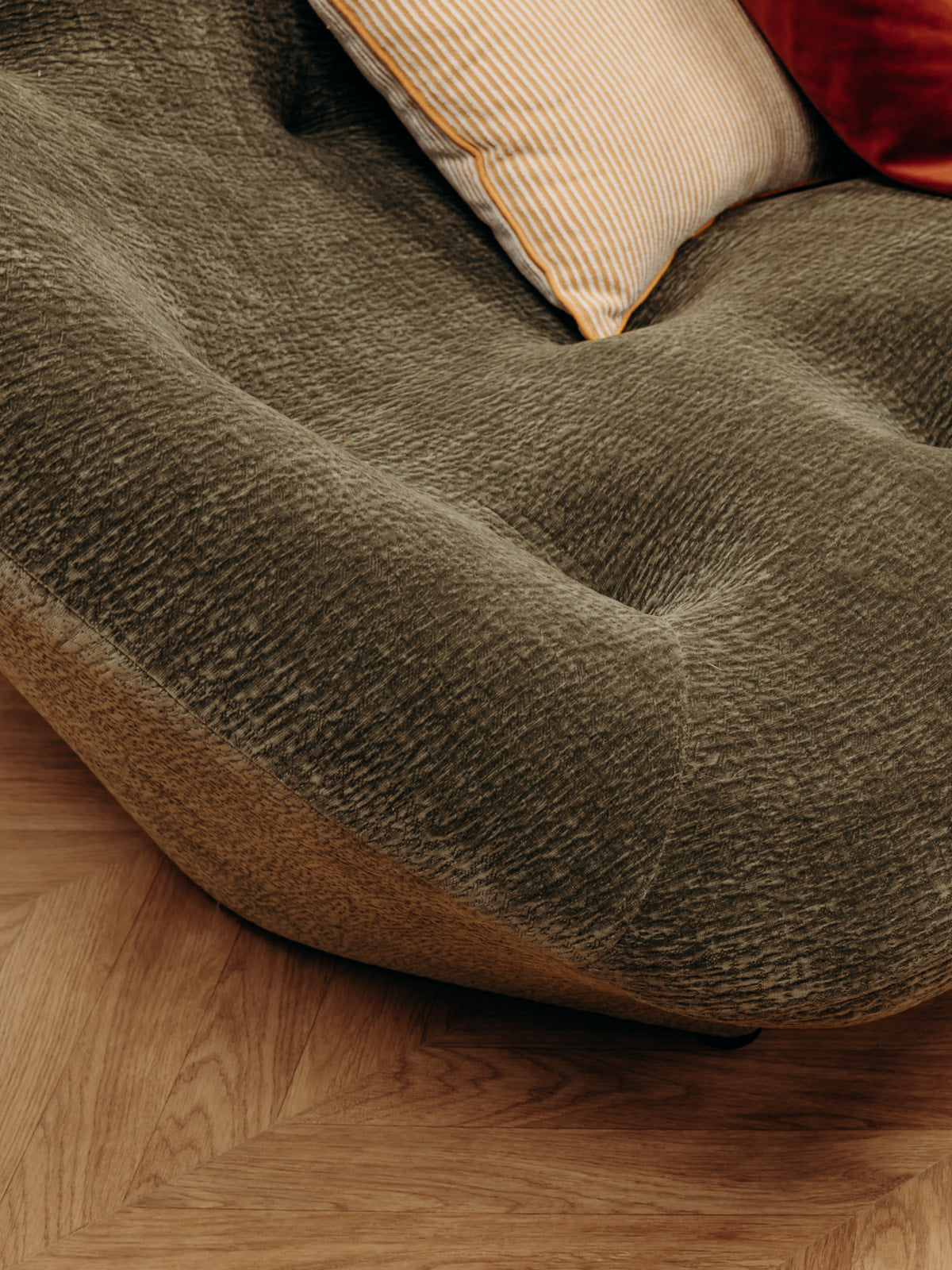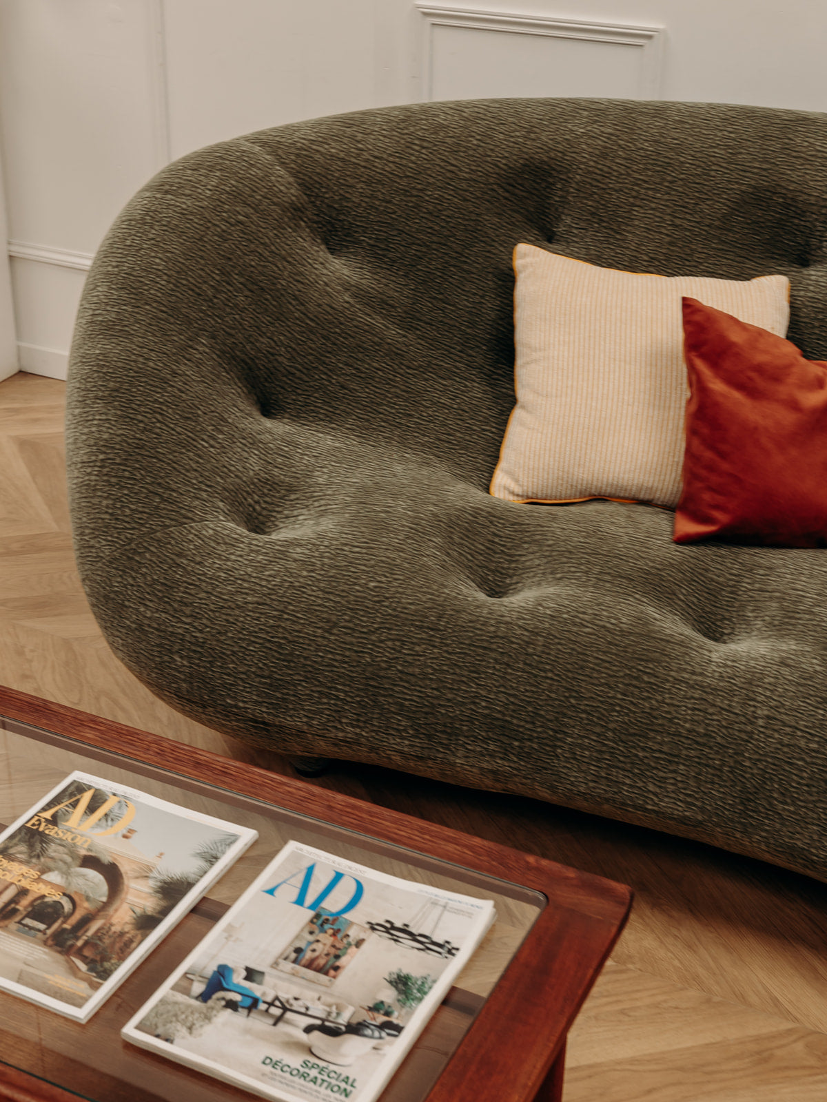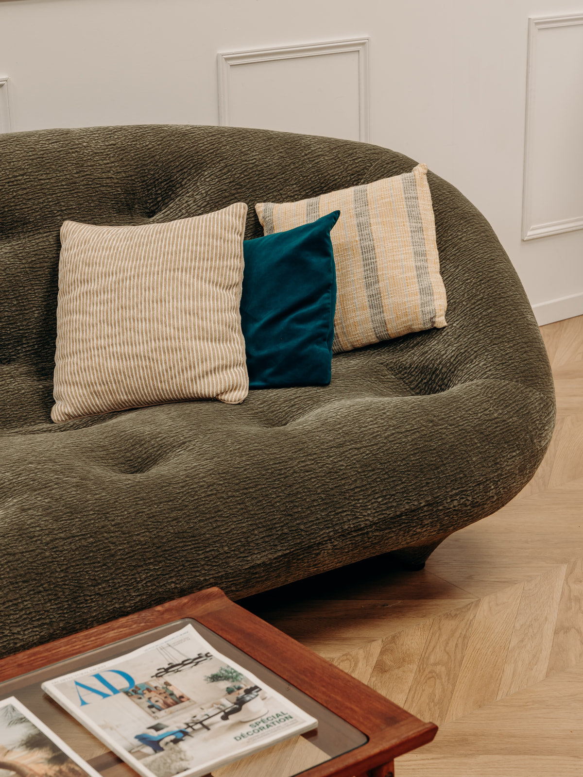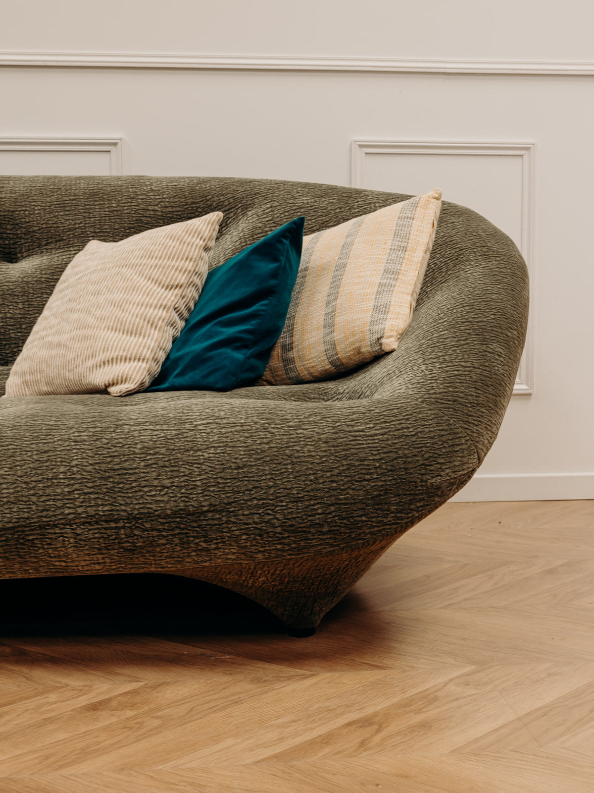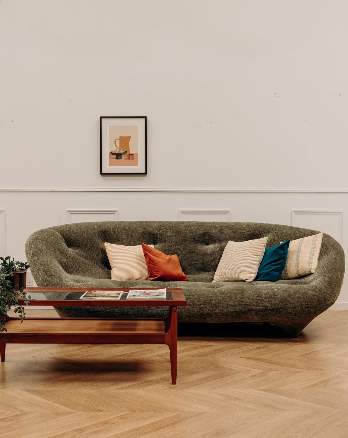 Discover the Ploum sofa, an iconic creation by designers R. & E. Bouroullec, produced by Ligne Roset. Originally from France, this model stands out for its contemporary design and vibrant green hue. Made from foam, it guarantees optimal comfort for your moments of relaxation. Recently reupholstered by passionate craftsmen, it combines modern elegance with traditional craftsmanship, blending perfectly into an interior seeking a piece that is both functional and aesthetically pleasing.