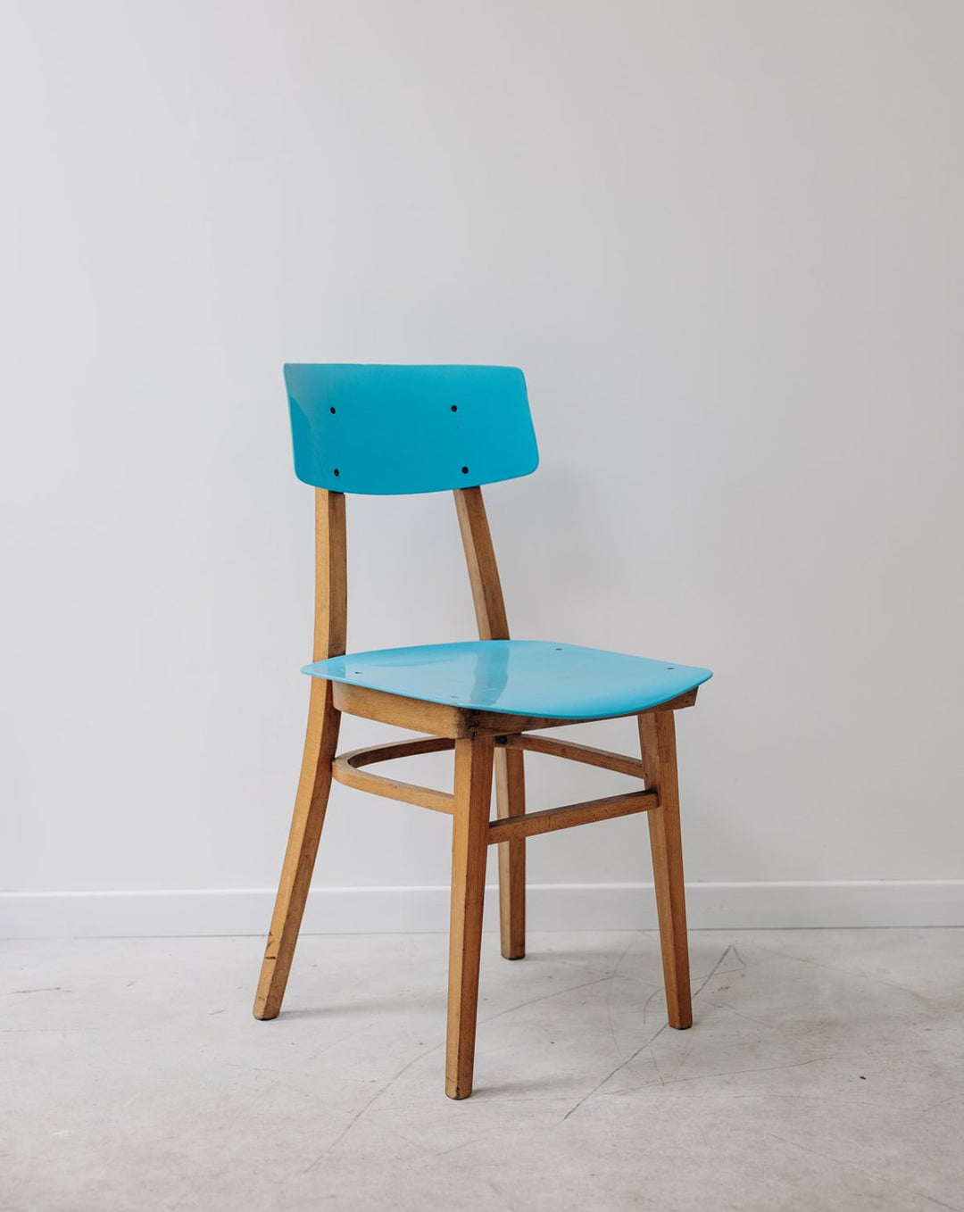 Bring a lovely vintage touch to your decor with this iconic chair from Ton Bystrice Thonet. Its unique design combines a bright cyan blue plastic seat with wooden compass legs, creating a perfect balance between retro and contemporary. Although it has some light micro-scratches visible in the photos, its timeless style and practicality make it an ideal choice for a dining room, office or creative space.