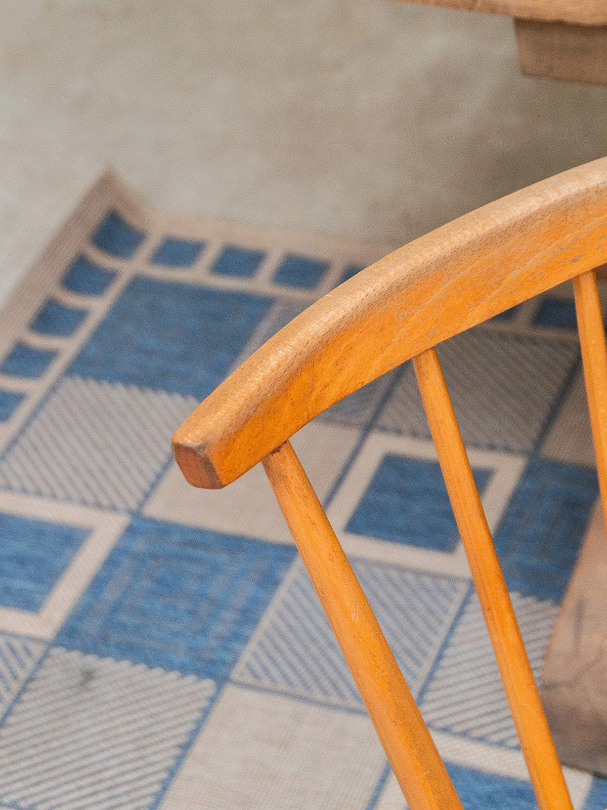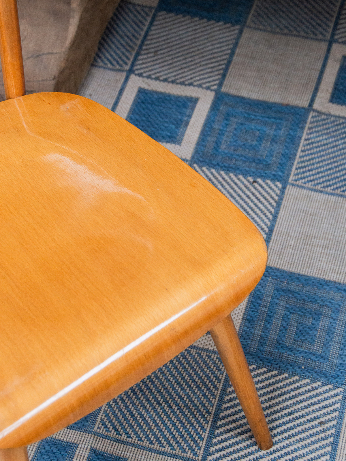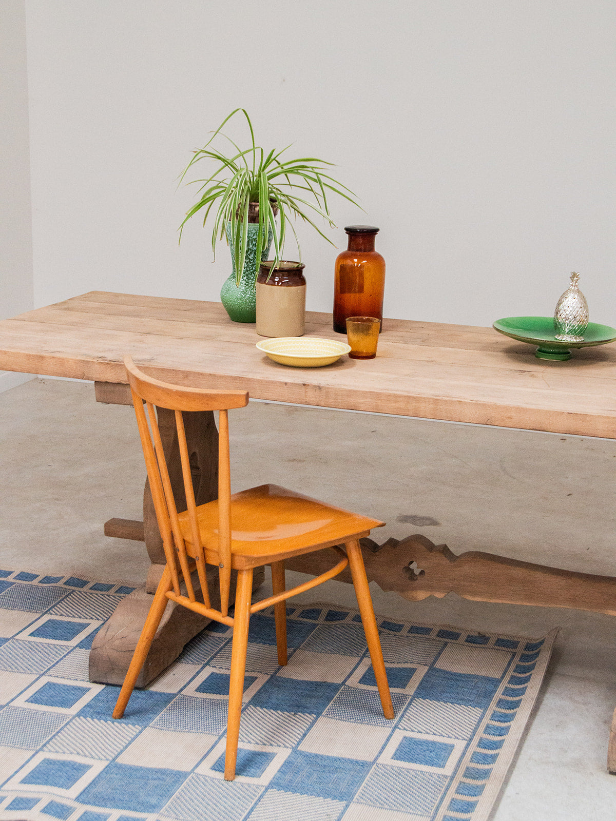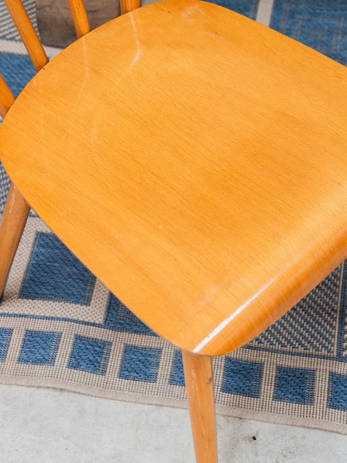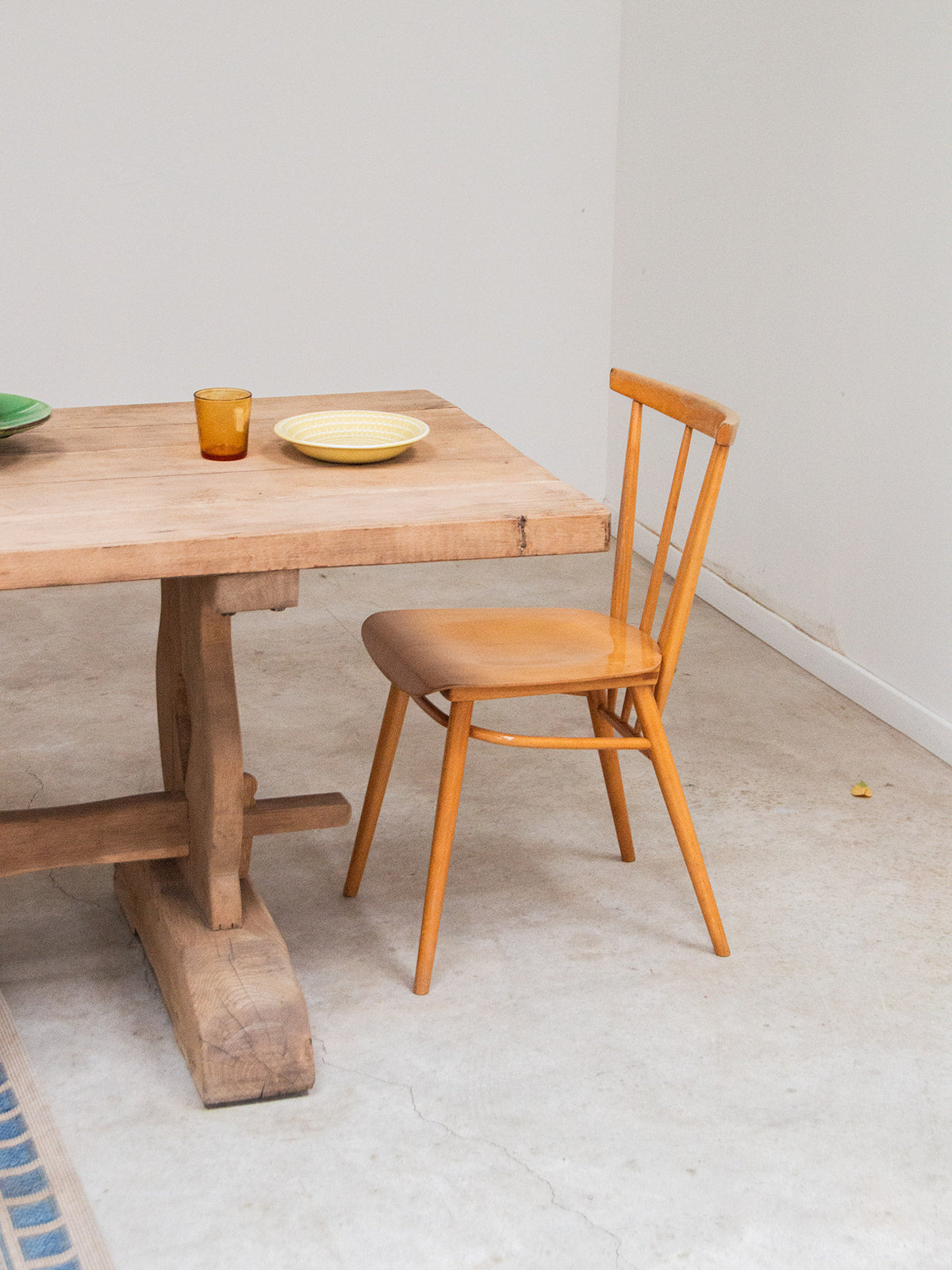 Bring a Scandinavian touch to your home with this yellow wooden chair. Its curved four-bar backrest and compass legs give it an elegant and light feel. A stylish yet functional piece, perfect for your dining room or a bright office area. Signs of wear vary depending on the piece! Sold individually, 4 quantities are available.