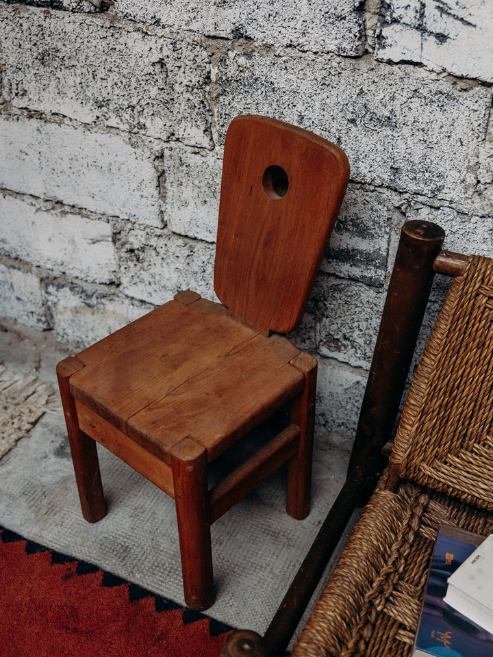 Discover this solid elm chair in a brutalist style, characterized by its clean lines and solidity. Its high backrest pierced with a round hole gives it a sculptural and graphic touch. The square seat, straight legs, and subtly rounded wood at the back reinforce its unique look. Both understated and imposing, it will find its place in a minimalist or wabi-sabi interior. A rare piece with a strong character.