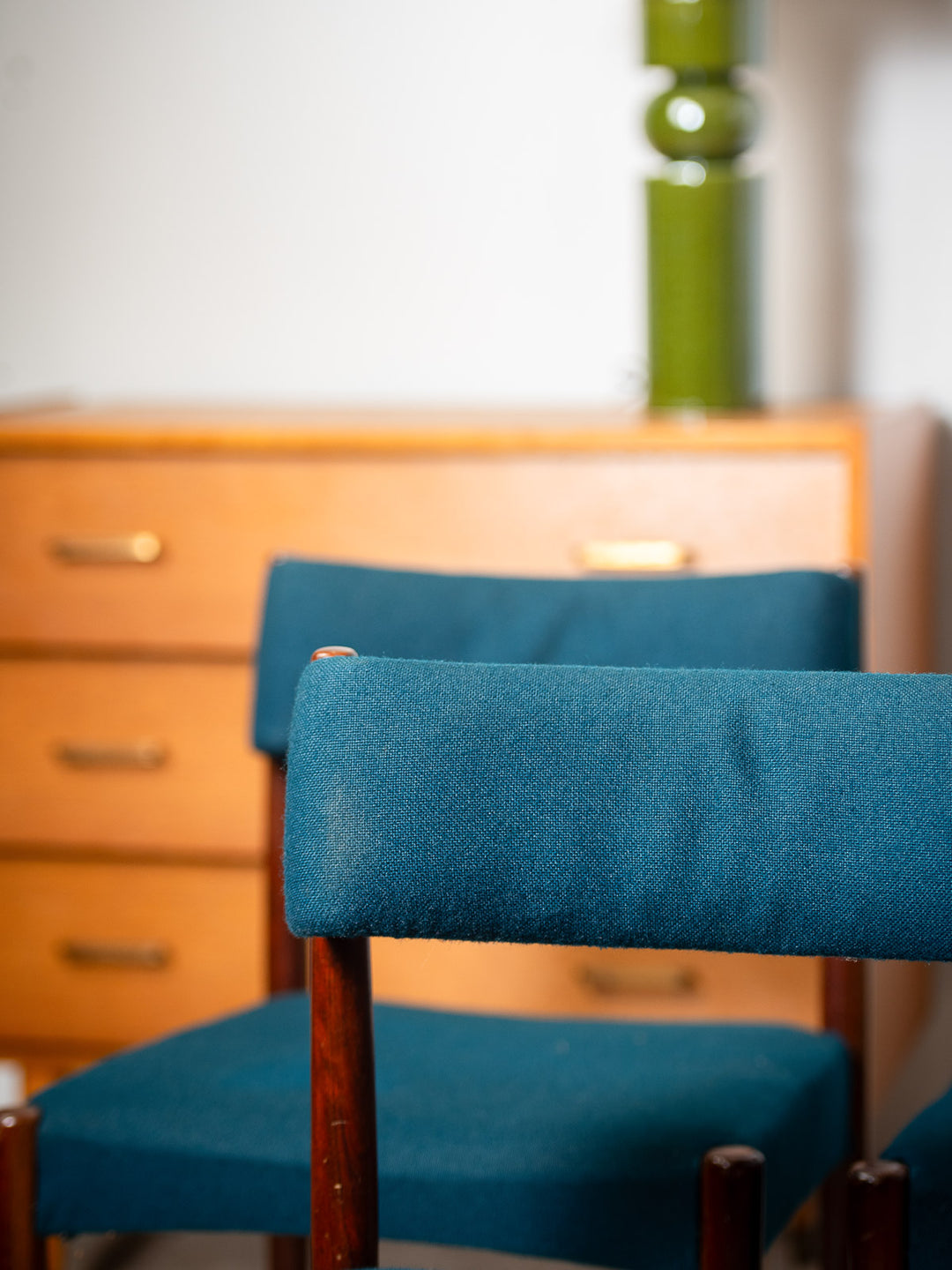 Discover this Scandinavian rosewood chair, which brings a retro and warm touch to your interior! With its vintage duck blue fabric seat, it stands out for its elegance and 60s style. Perfect for your dining room, it combines comfort and aesthetics. Note that it has some marks from its past, visible in the photos, adding character to this unique piece. Sold individually, available in 5 copies.