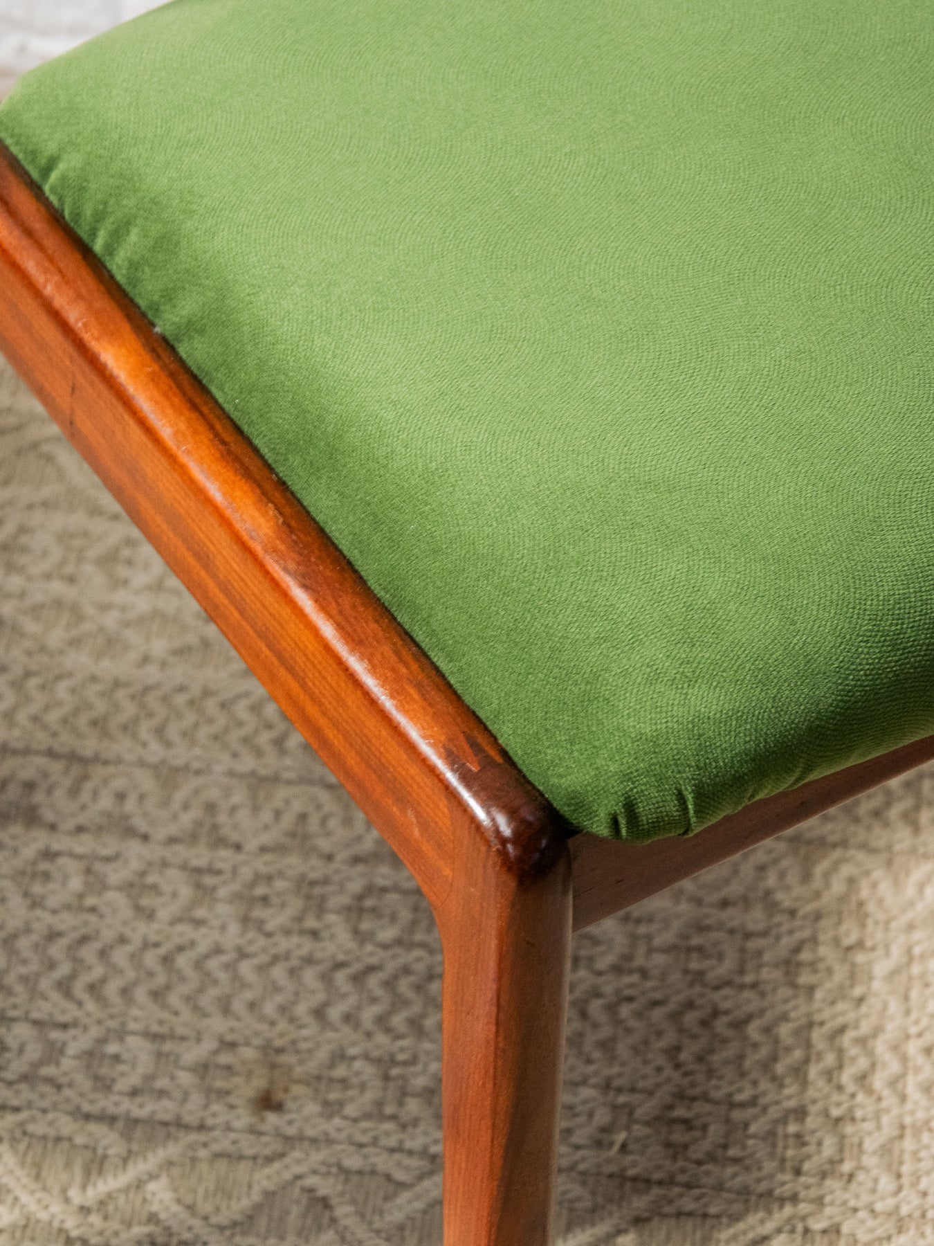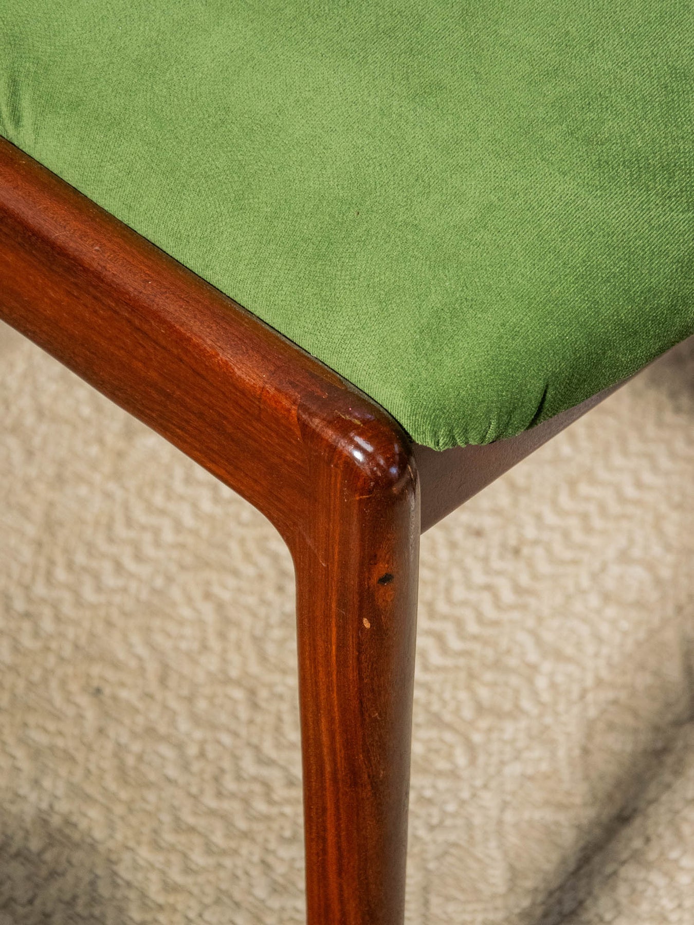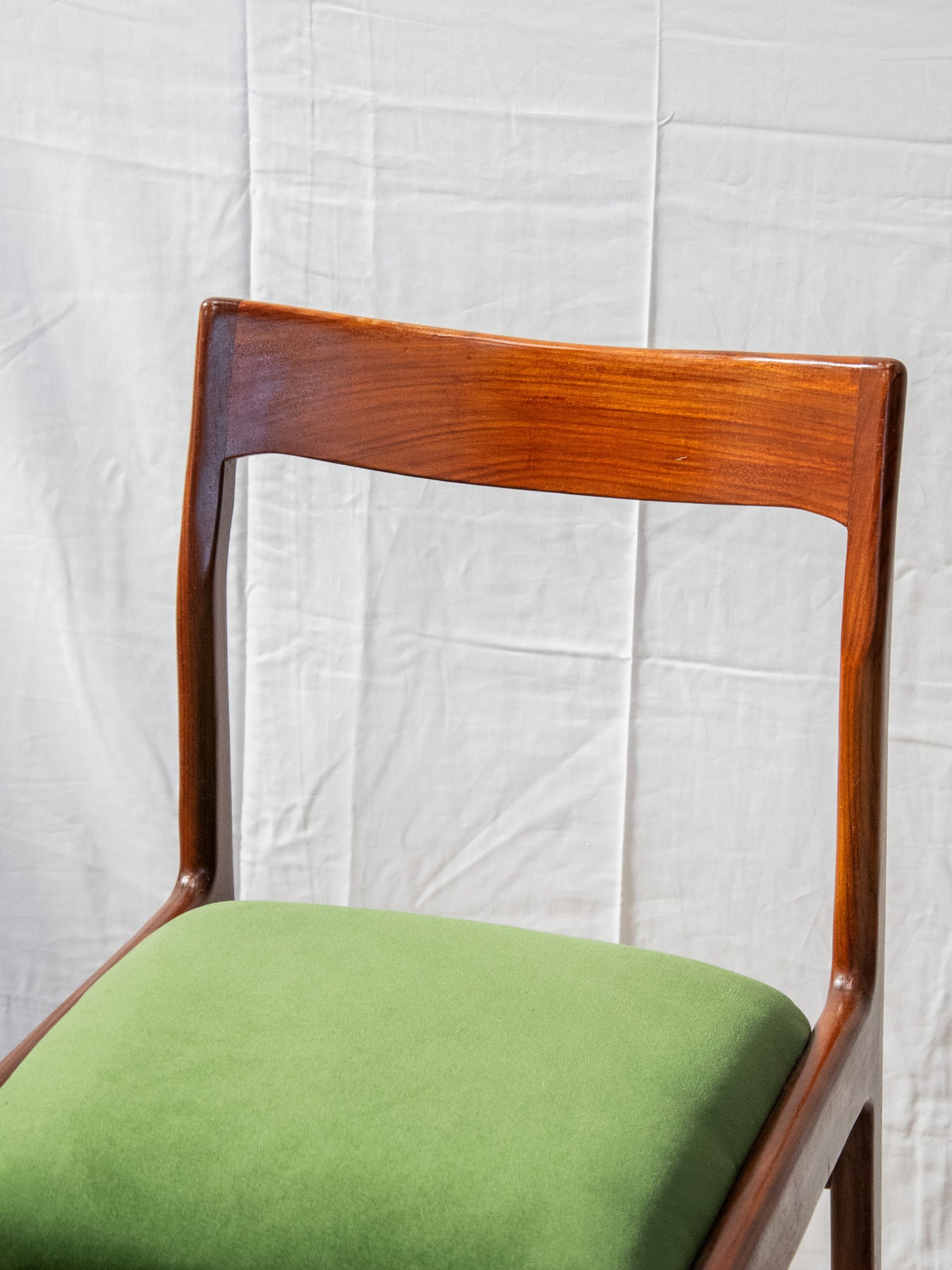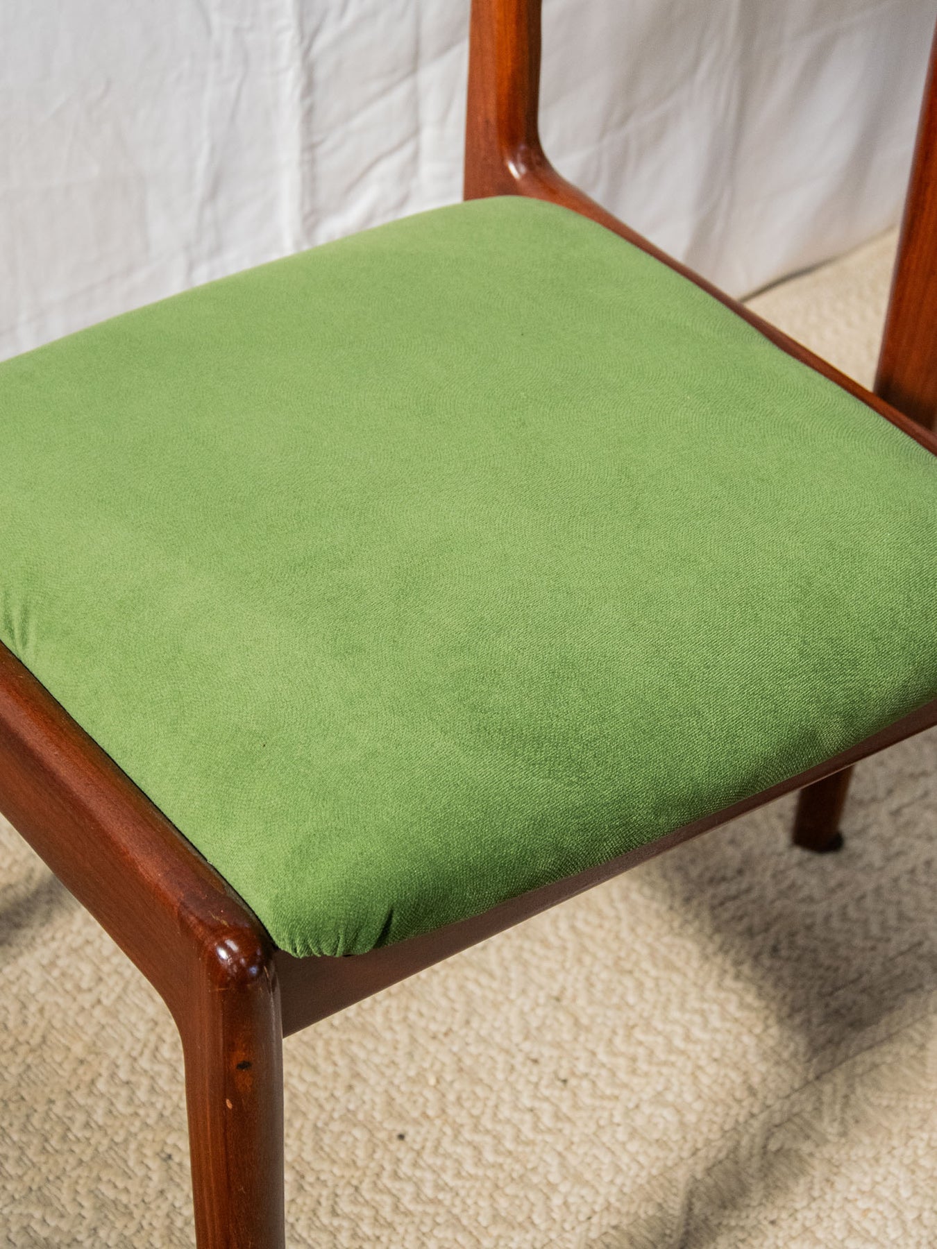 Discover this elegant, glossy dark wood chair in red teak that brings a Scandinavian touch to your home. Its green fabric seat offers optimal comfort, while the varying signs of wear add a unique charm to each piece. Ideal for a decor that's both modern and authentic, this chair fits perfectly into any living space. Add a warm touch to your furniture with this beautiful model's timeless design. Sold individually, two quantities are available.