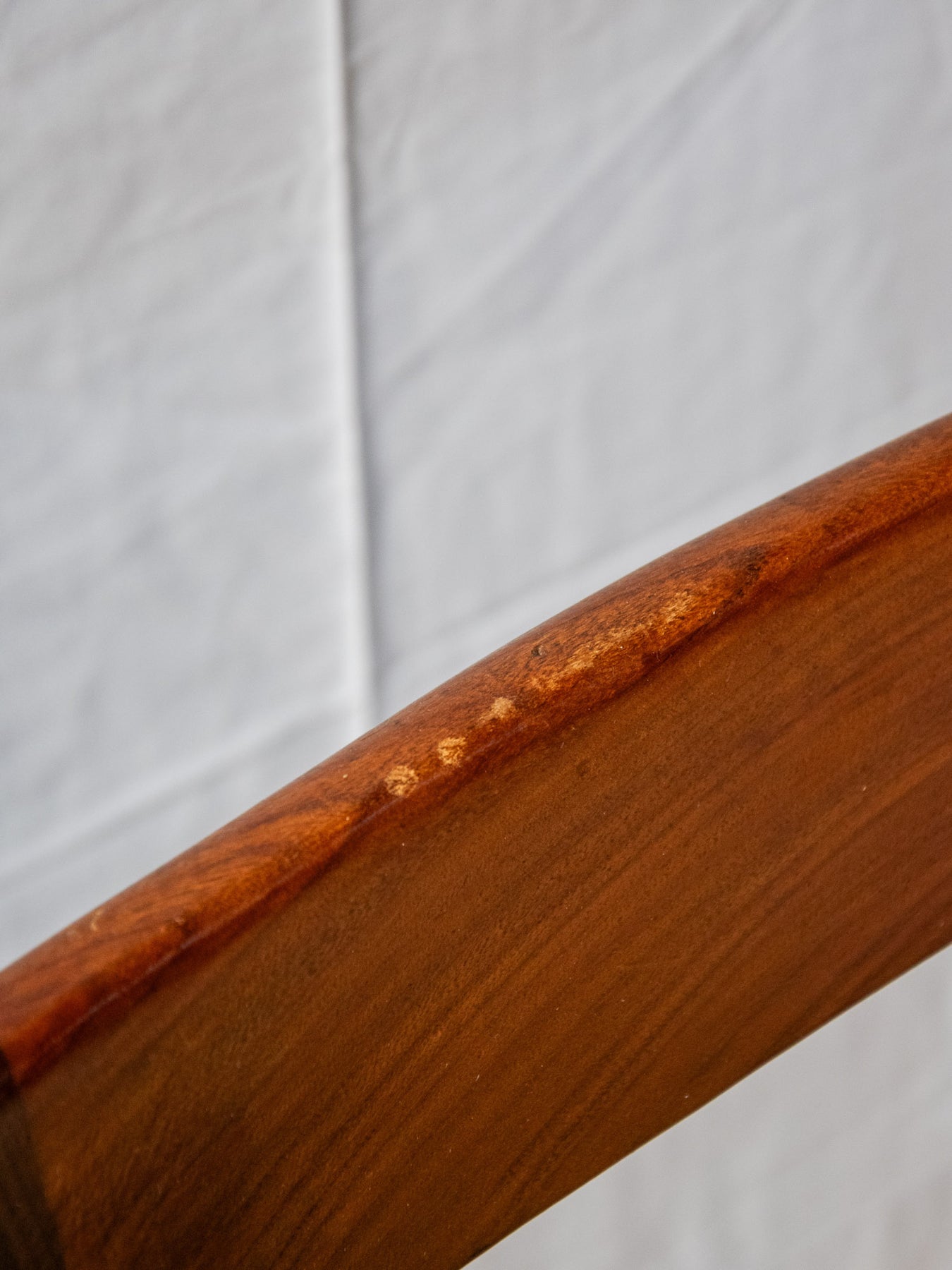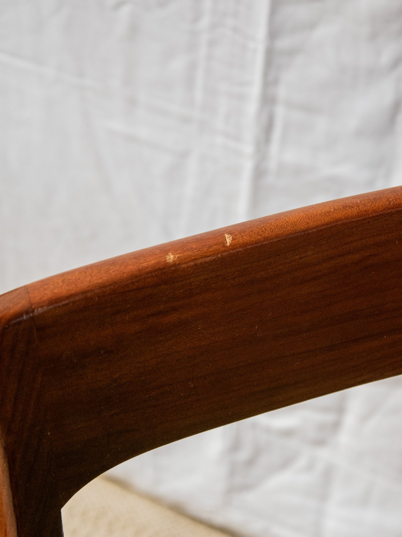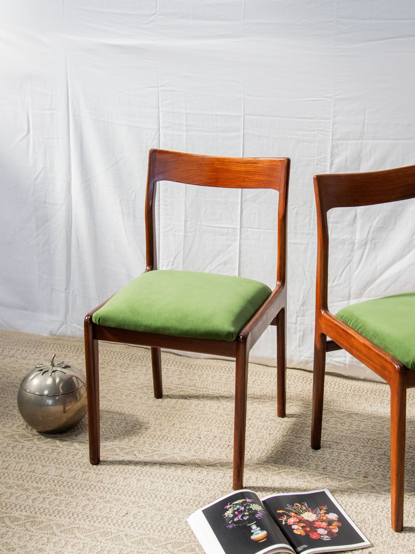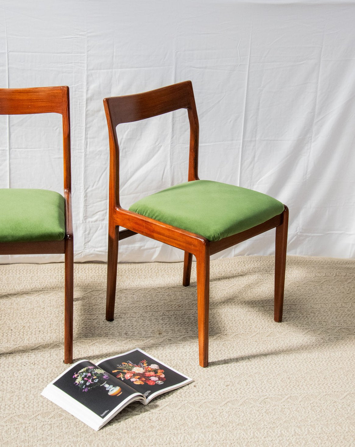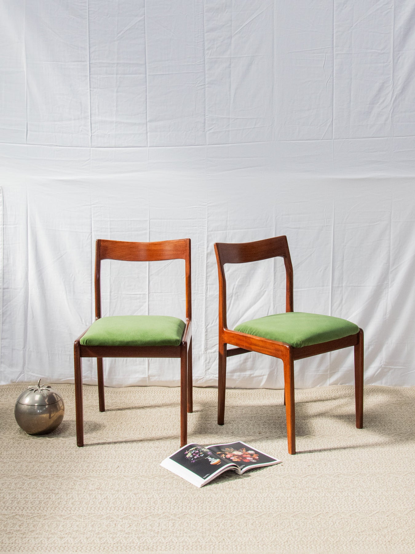 Discover this elegant, glossy dark wood chair in red teak that brings a Scandinavian touch to your home. Its green fabric seat offers optimal comfort, while the varying signs of wear add a unique charm to each piece. Ideal for a decor that's both modern and authentic, this chair fits perfectly into any living space. Add a warm touch to your furniture with this beautiful model's timeless design. Sold individually, two quantities are available.