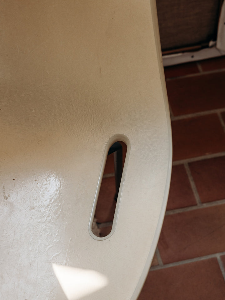 Discover this set of 4 fiberglass shell chairs, with an elegant and timeless design, with an ivory white seat featuring a beautiful cracked effect due to time. Made in Italy, it is distinguished by its two holes in the seat, facilitating its practical handling. The metal legs add an industrial touch, while the marks of time on the seat and legs testify to its history and authenticity. Perfect for a vintage or modern interior, it combines comfort and style. A piece of furniture that is both functional and aesthetic to enhance your space.