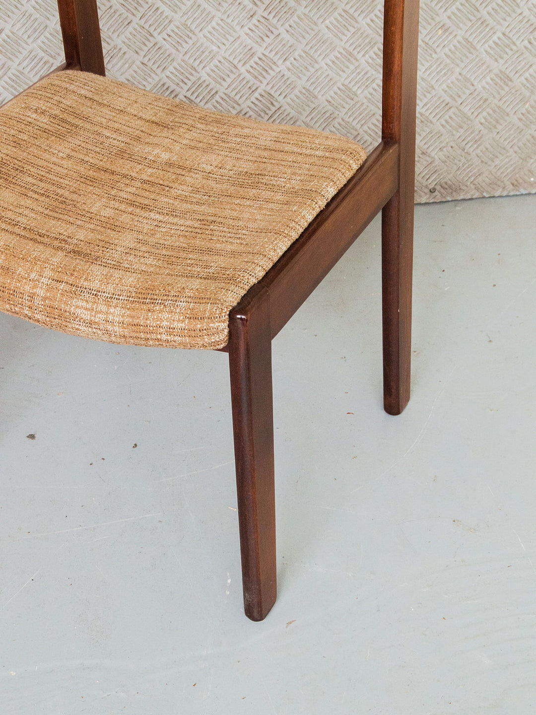 Discover this set of six Scandinavian chairs with a warm and authentic design, perfect for a dining room full of character. Their dark wood frame adds a beautiful presence, while the seat and backrest are upholstered in a blend of green, brown, and white fabric. The simple, elegant lines blend easily into a variety of interior styles. Some signs of wear are visible, but they don't detract from their charm. A harmonious and comfortable set for a welcoming space.
