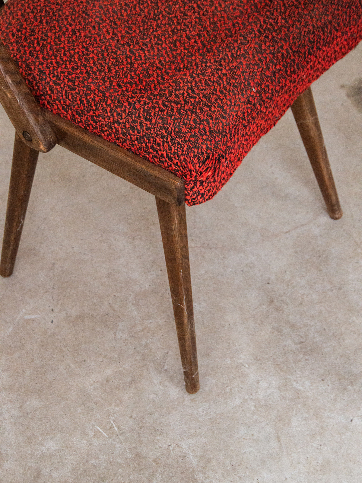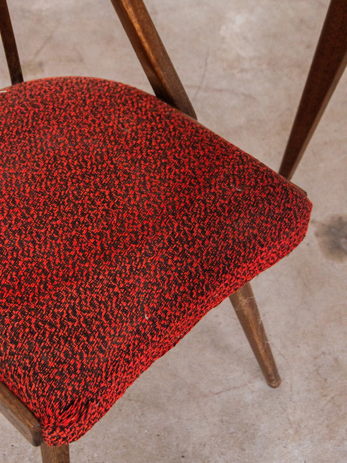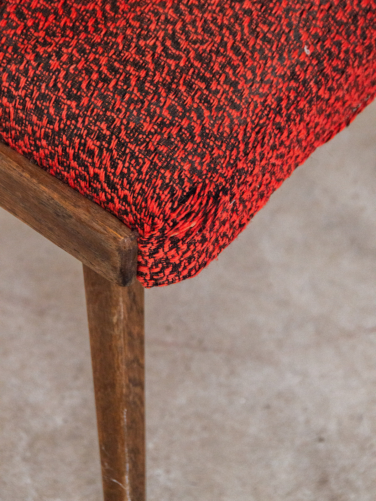 Bring a warm touch to your home with this dark wood chair featuring a backrest made up of six elegant bars. Its red/orange fabric seat, subtly shaded with black accents, combines comfort and character. A simple yet charming piece, ideal for complementing your dining room or cozy dining area. Sold individually, 3 pieces are available.