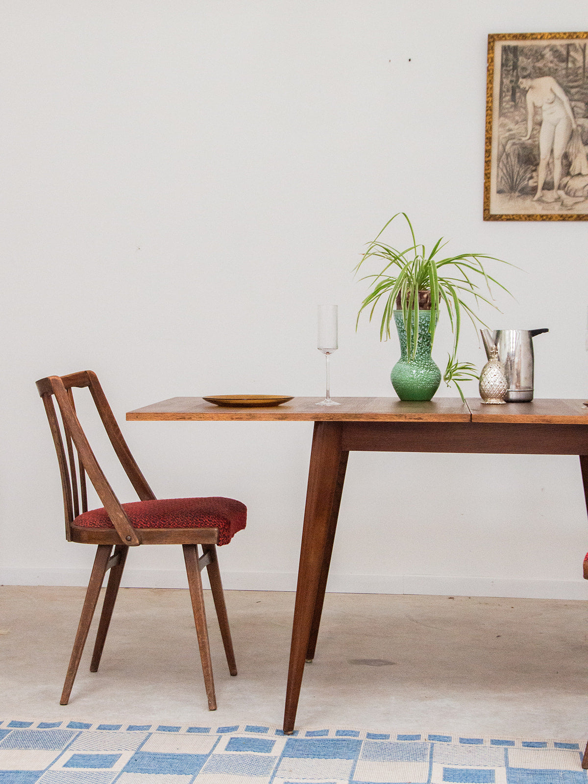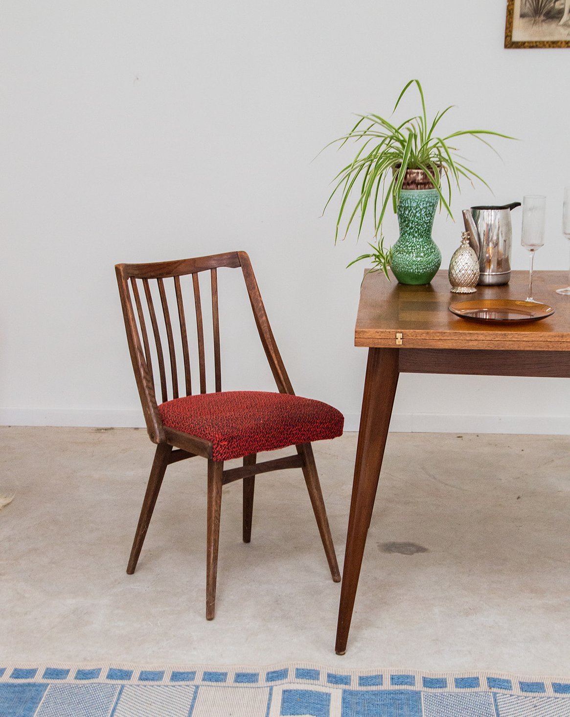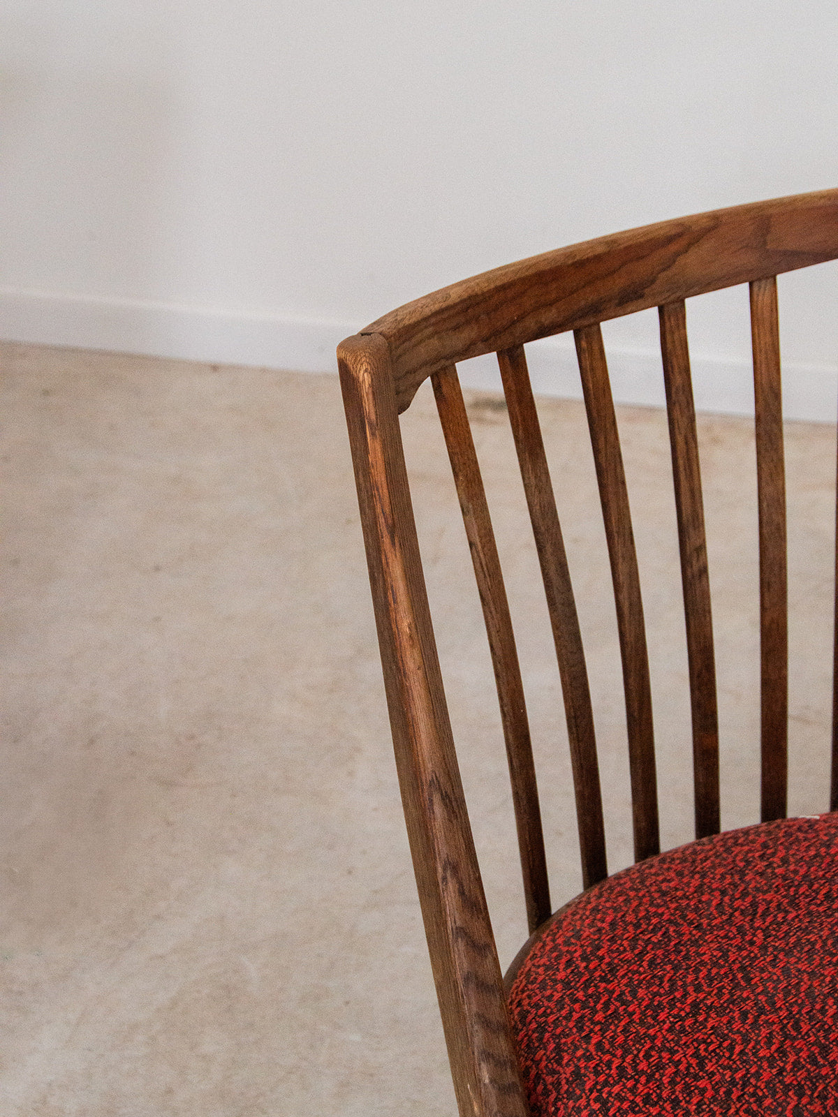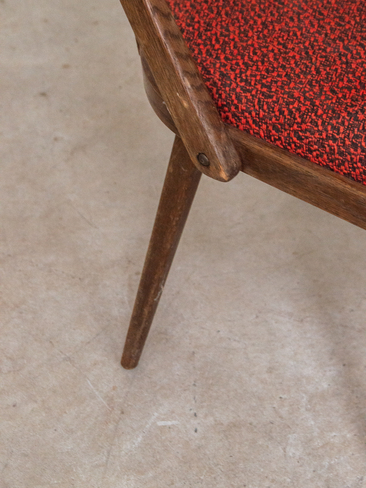 Bring a warm touch to your home with this dark wood chair featuring a backrest made up of six elegant bars. Its red/orange fabric seat, subtly shaded with black accents, combines comfort and character. A simple yet charming piece, ideal for complementing your dining room or cozy dining area. Sold individually, 3 pieces are available.