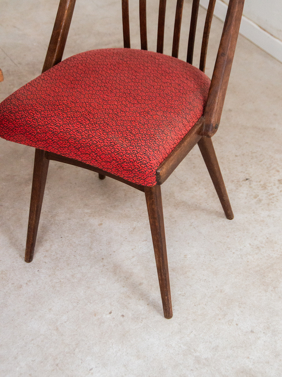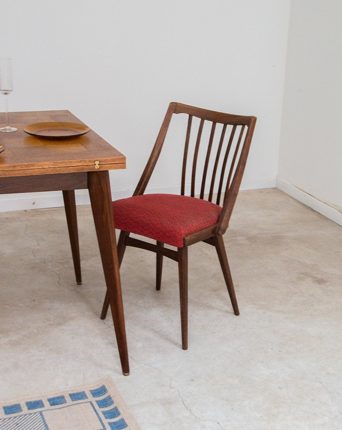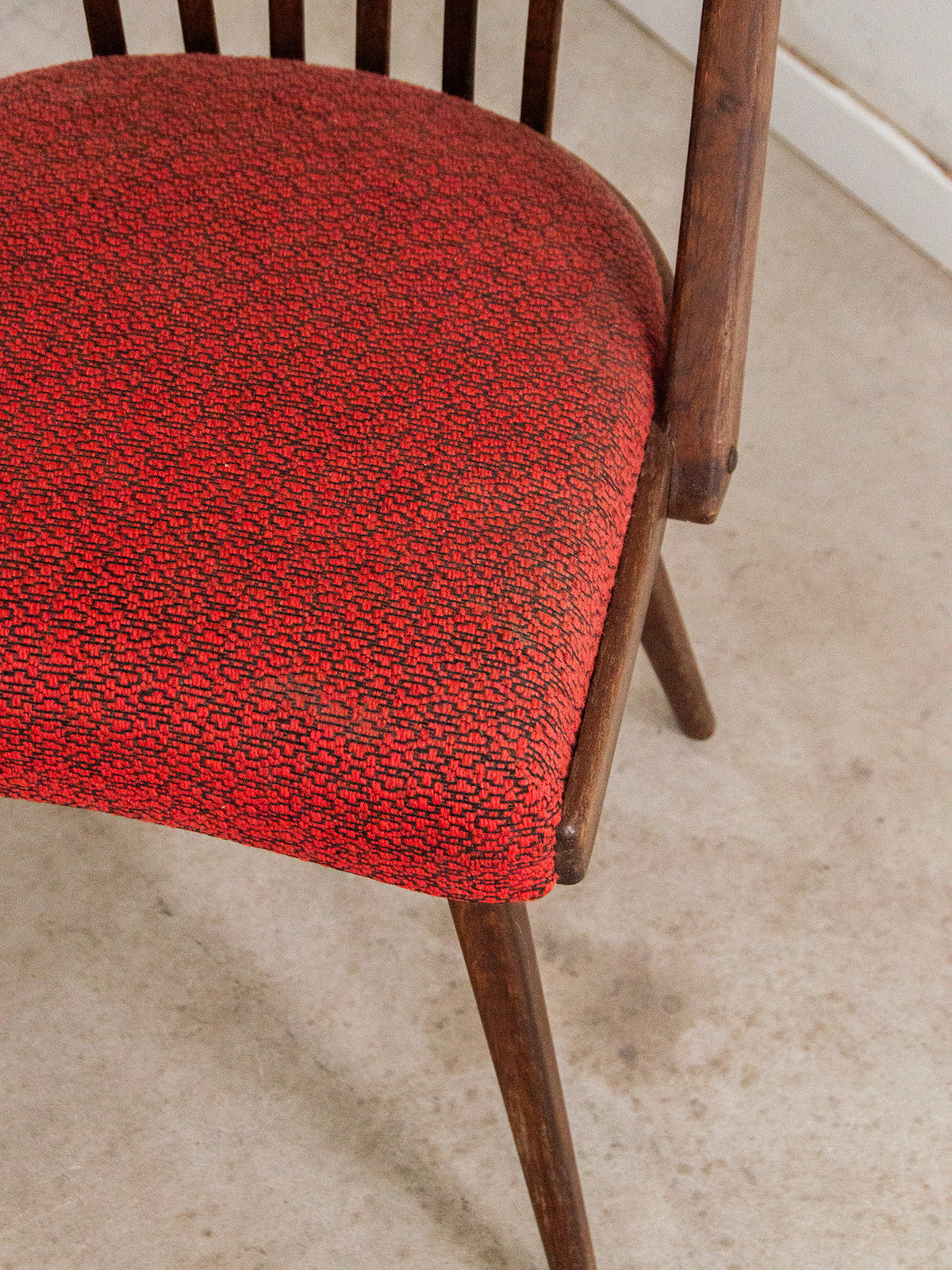Bring warmth and style to your home with this dark wood chair with a six-bar backrest. Its orange-red fabric seat offers comfort and elegance. A simple and charming piece, perfect for complementing your dining room or cozy breakfast nook.