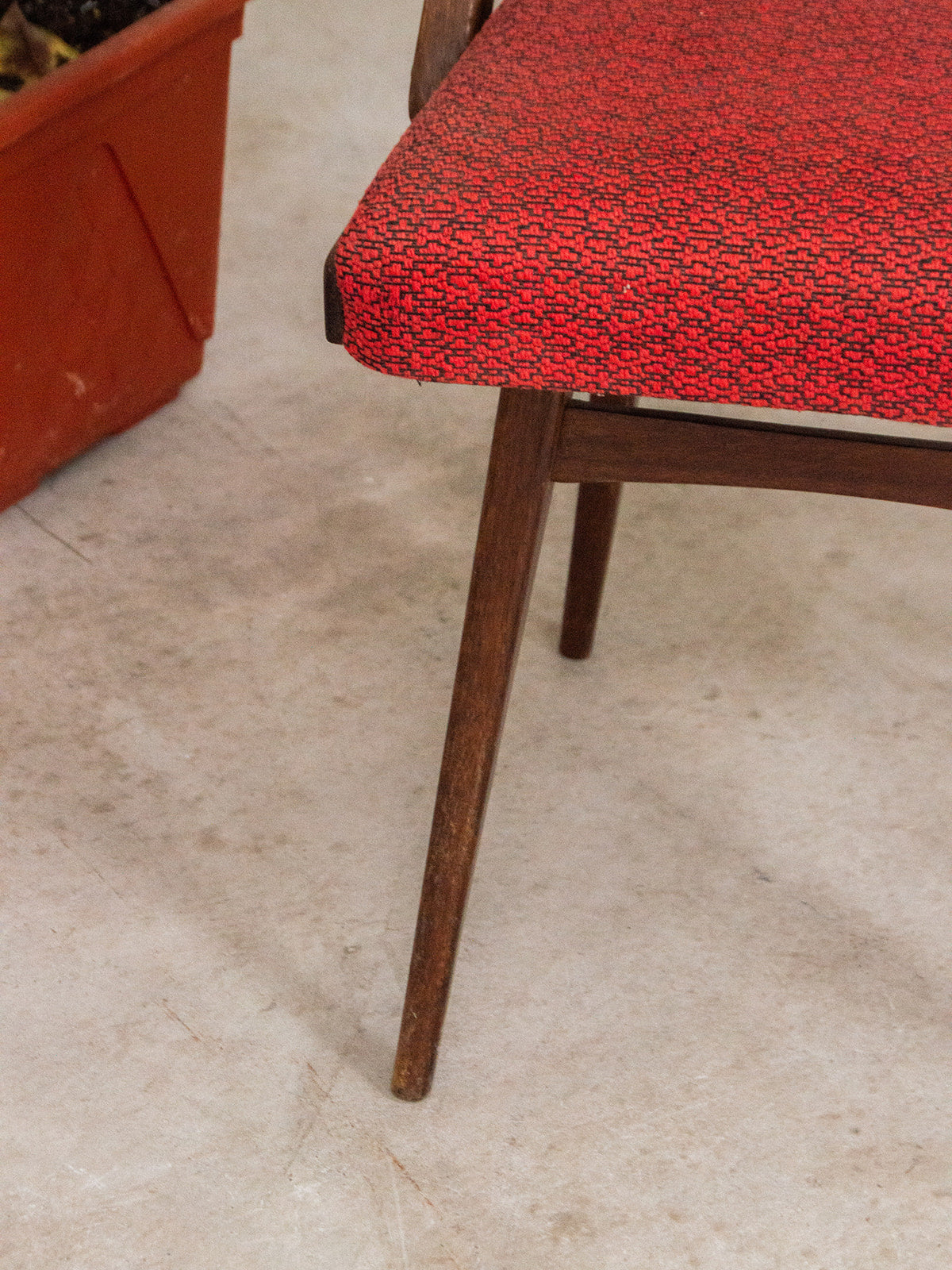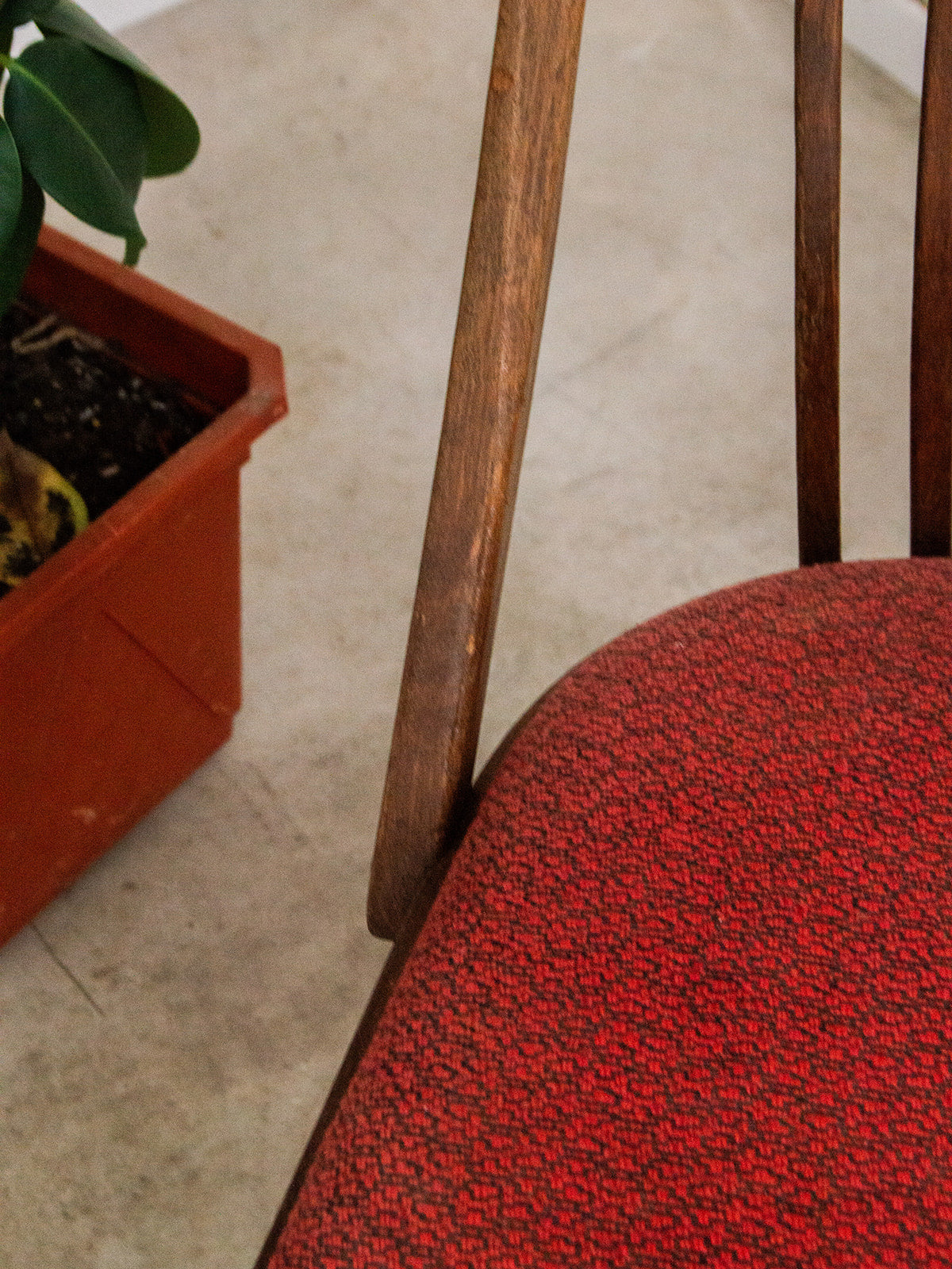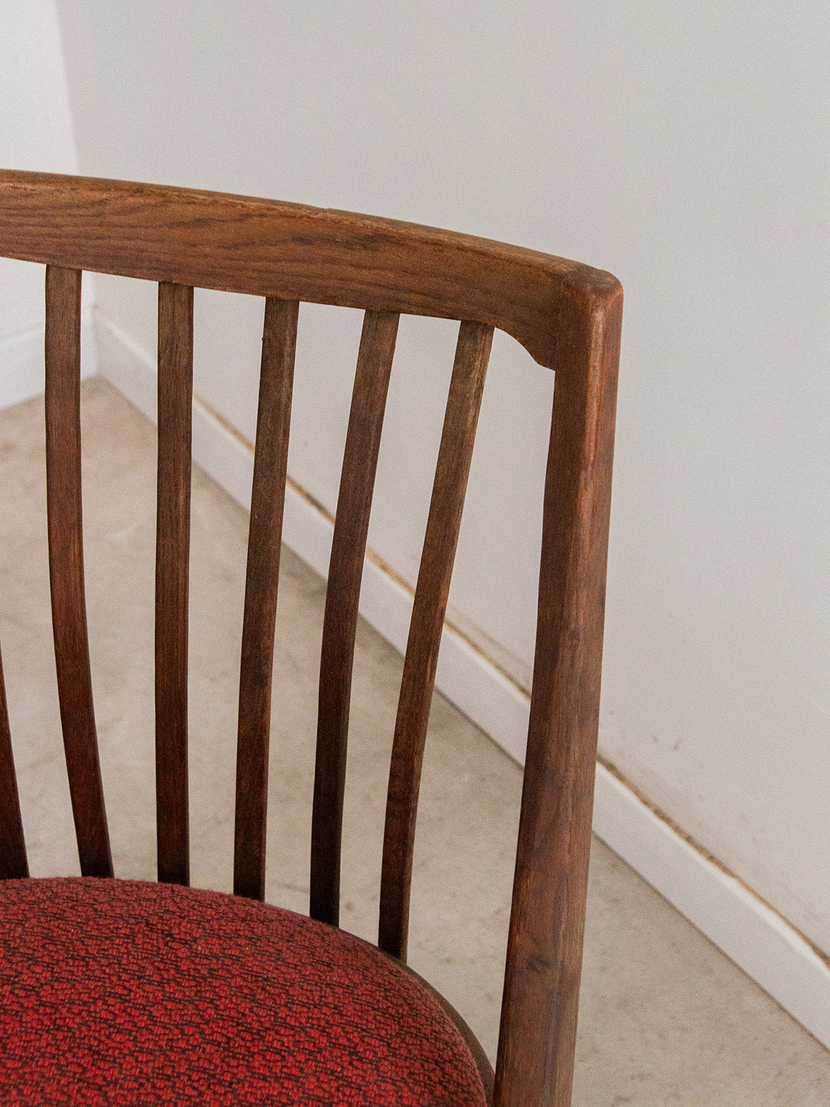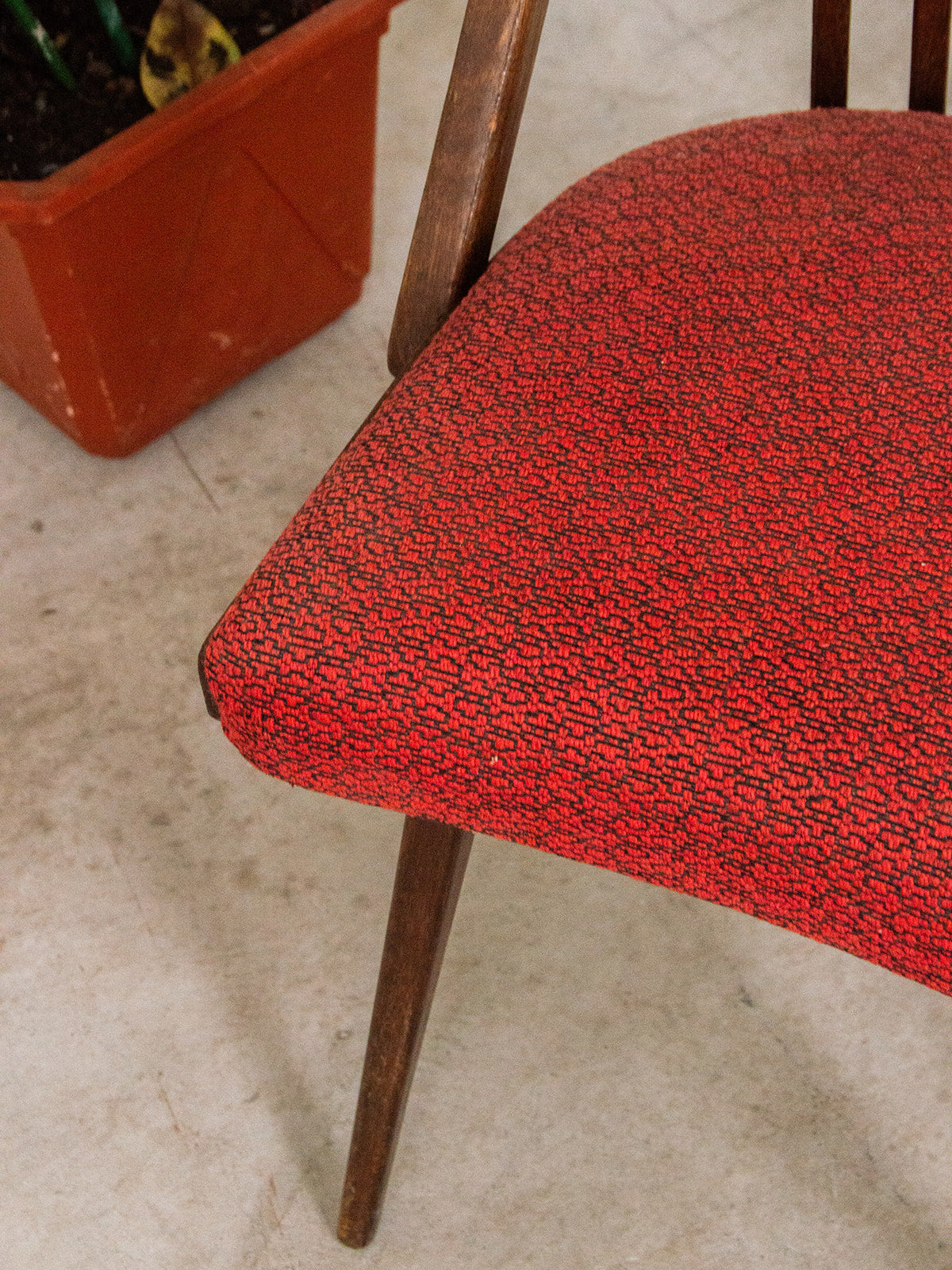 Bring warmth and style to your home with this dark wood chair with a six-bar backrest. Its orange-red fabric seat offers comfort and elegance. A simple and charming piece, perfect for complementing your dining room or cozy breakfast nook.