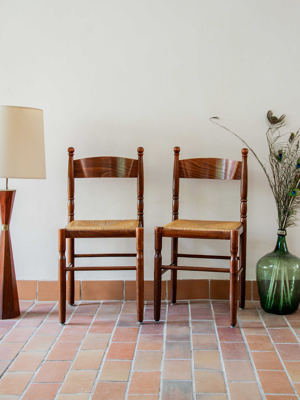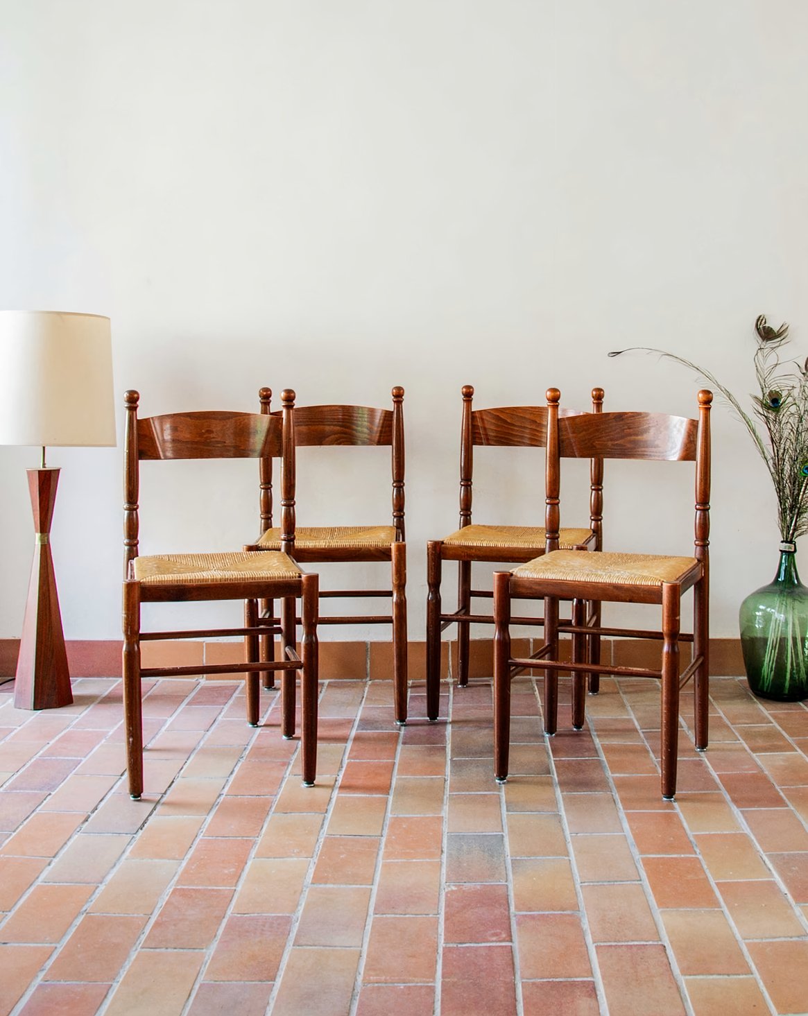 Discover this set of four vintage farmhouse chairs with authentic charm. Their beautiful woodwork, combined with straw seats and a warm hue, makes this a set full of character. Perfect for a rustic dining room or a more modern interior looking for authenticity. Sturdy and comfortable, they offer a beautiful presence. Some signs of wear should be noted.