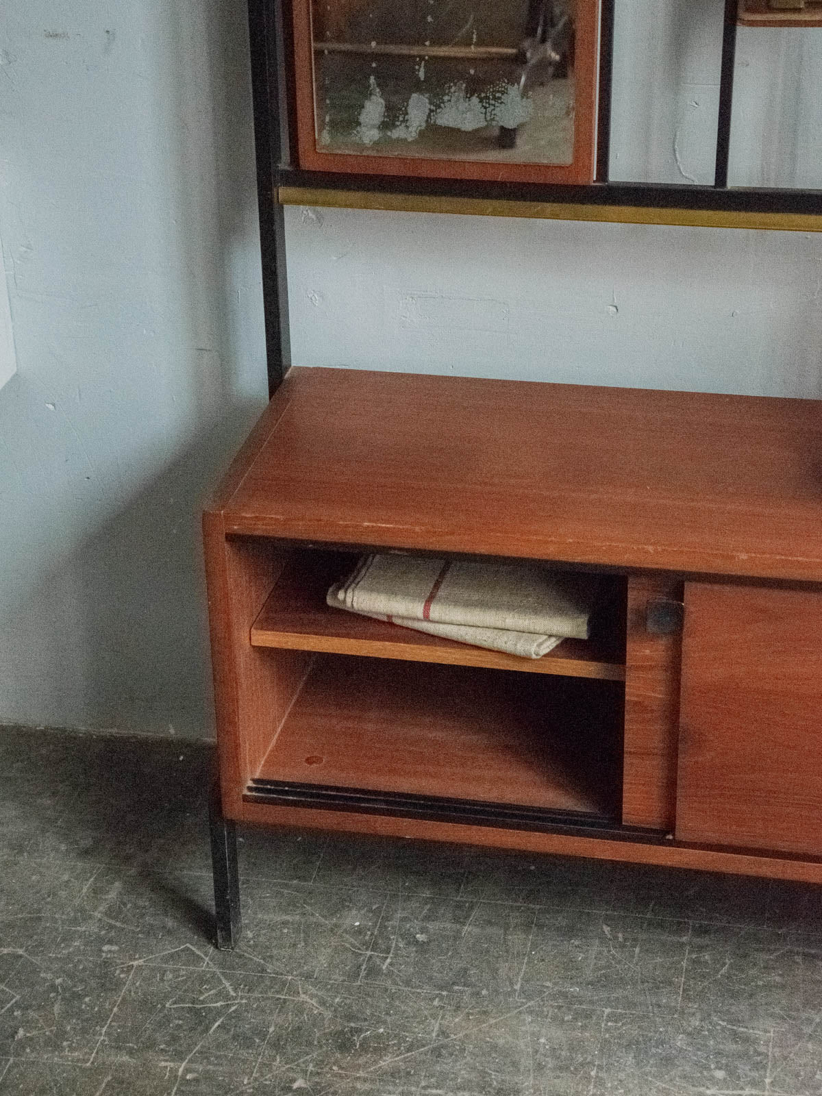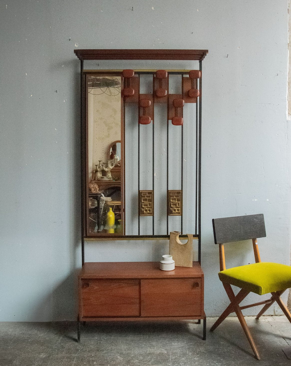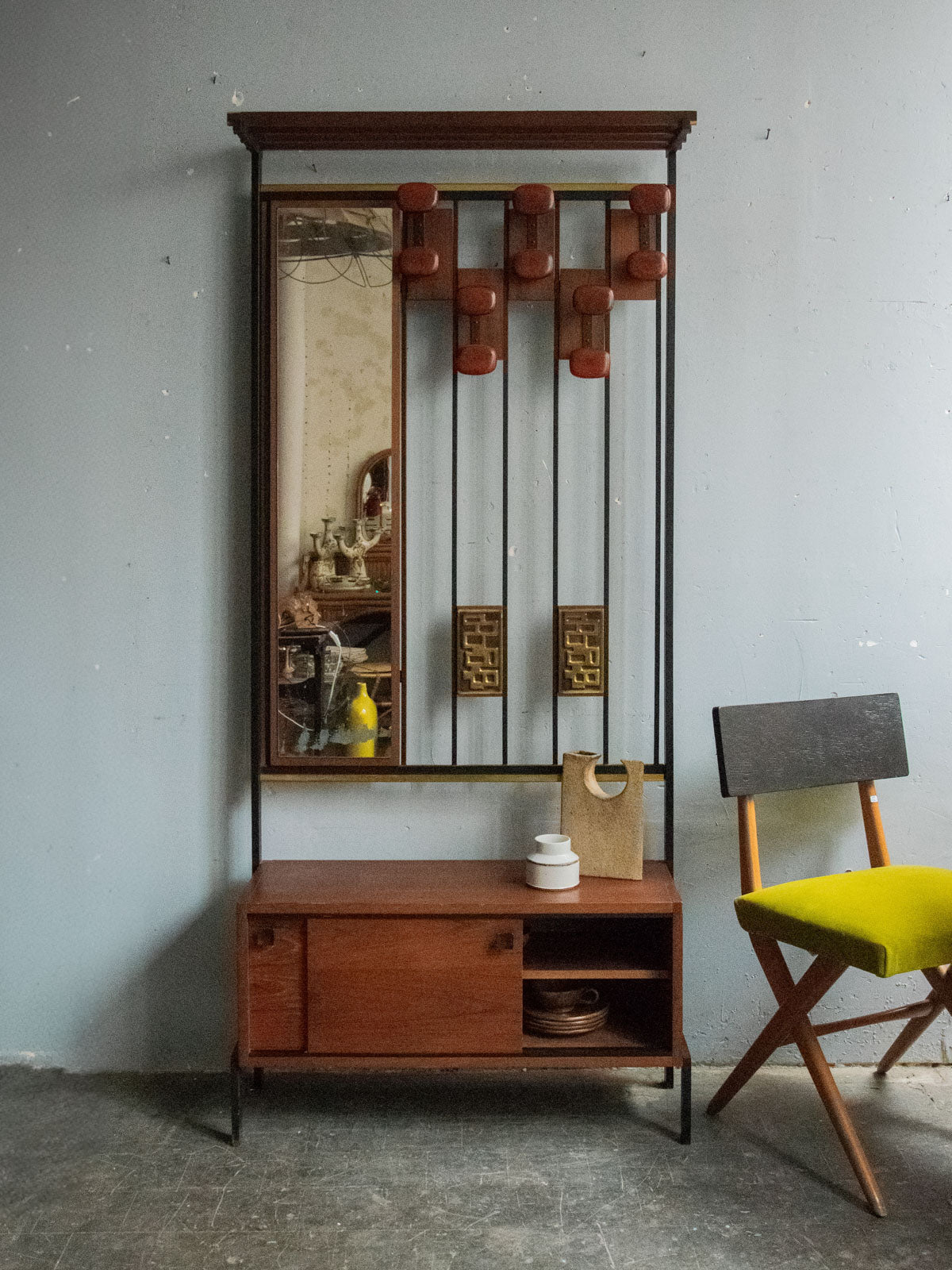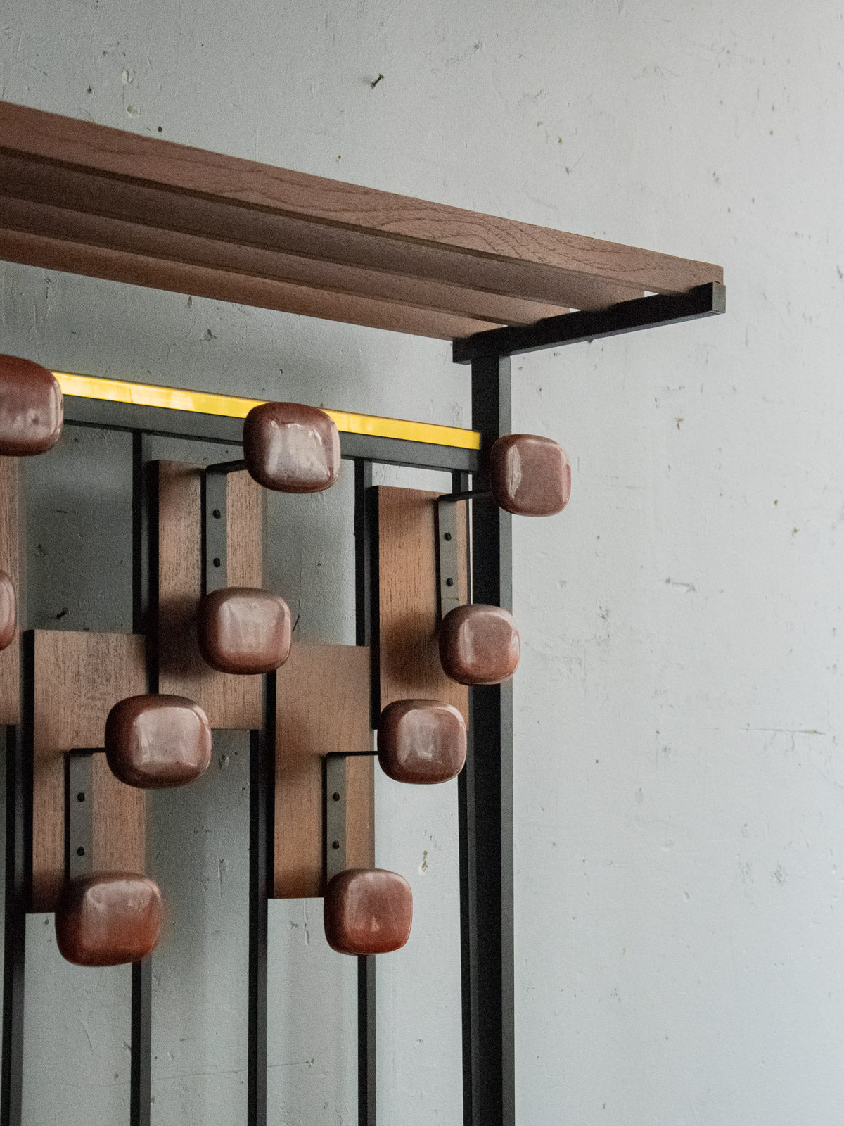 Bring a touch of elegance to your entryway with this large, refined coat rack. Featuring 10 hooks to hold all your clothes, it comes complete with a small, low metal cabinet, perfect for storing accessories and shoes. Its dark wood accentuates a timeless style, while the small handles add a delicate touch. To complete the look, a rectangular, quilted mirror lets you take a last look before heading out. A practical and aesthetic piece of furniture that will transform your entryway!