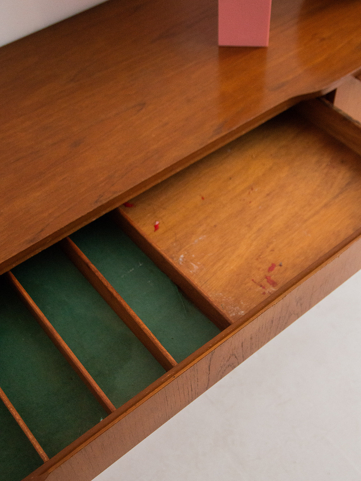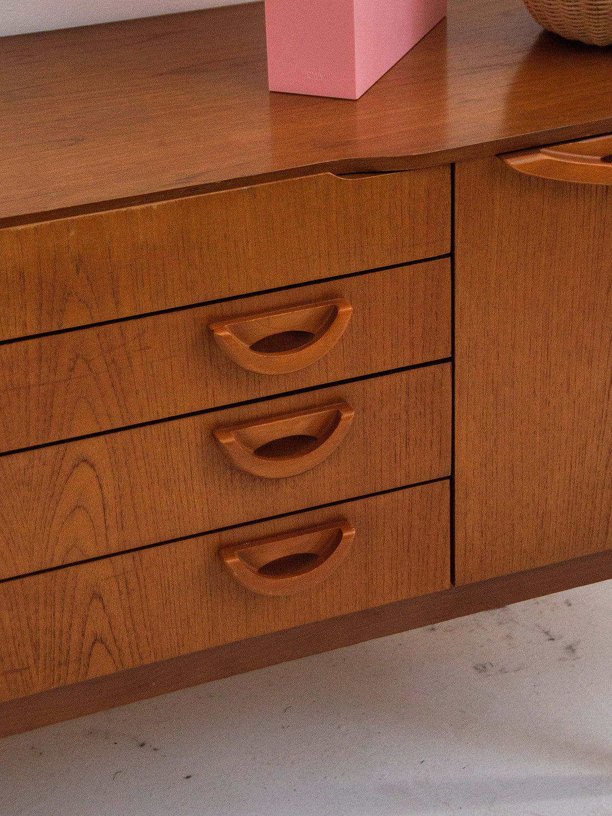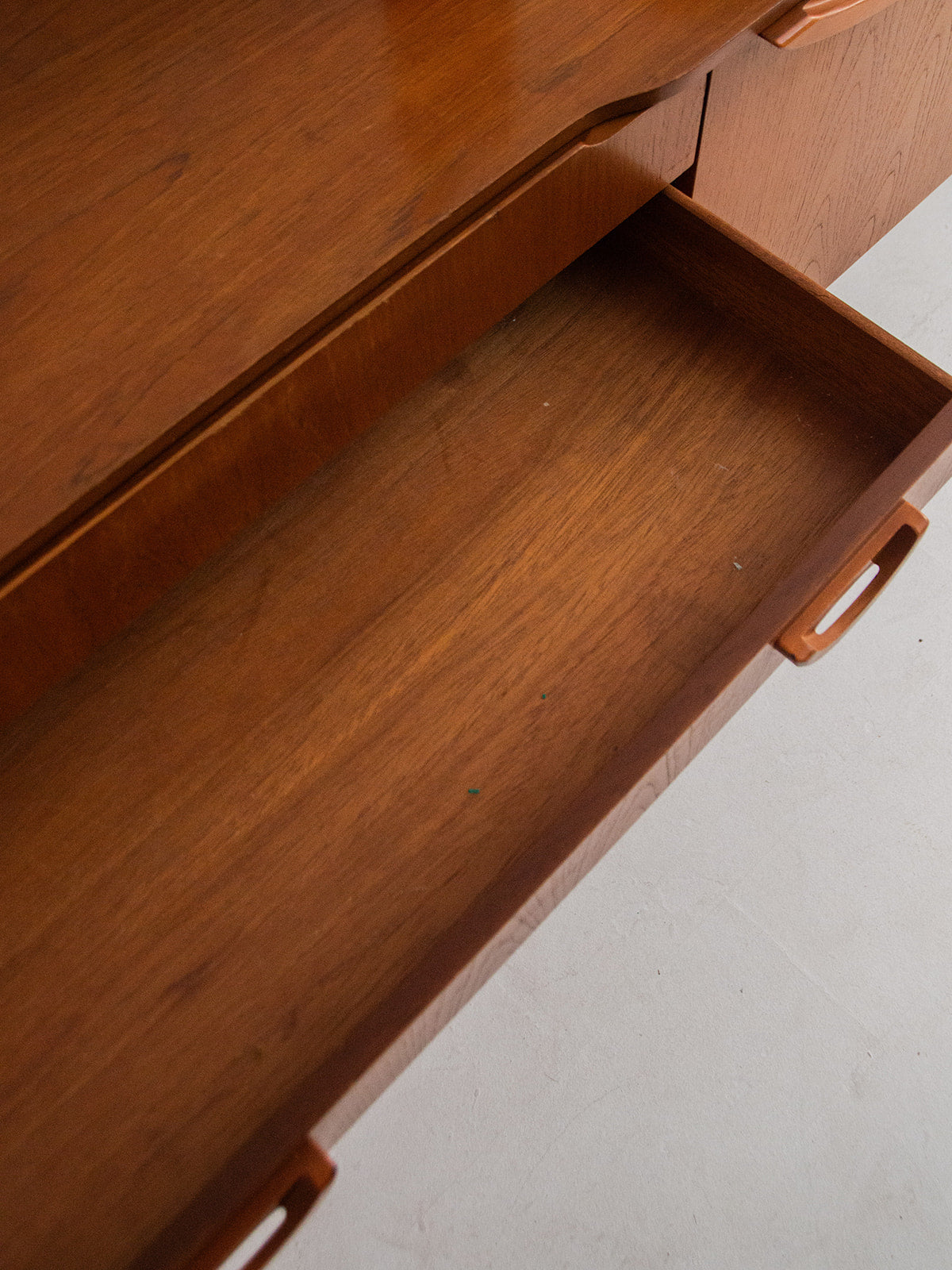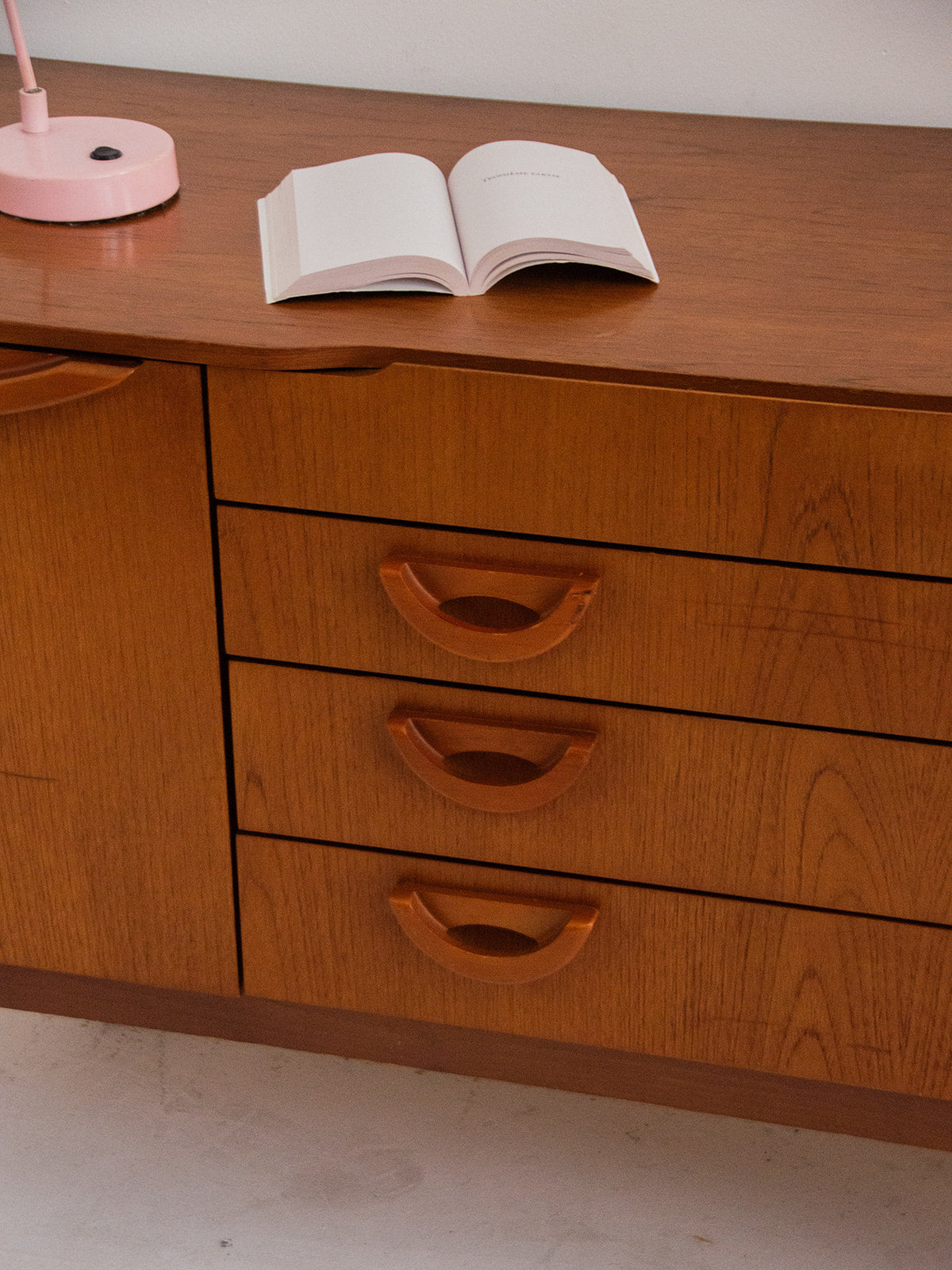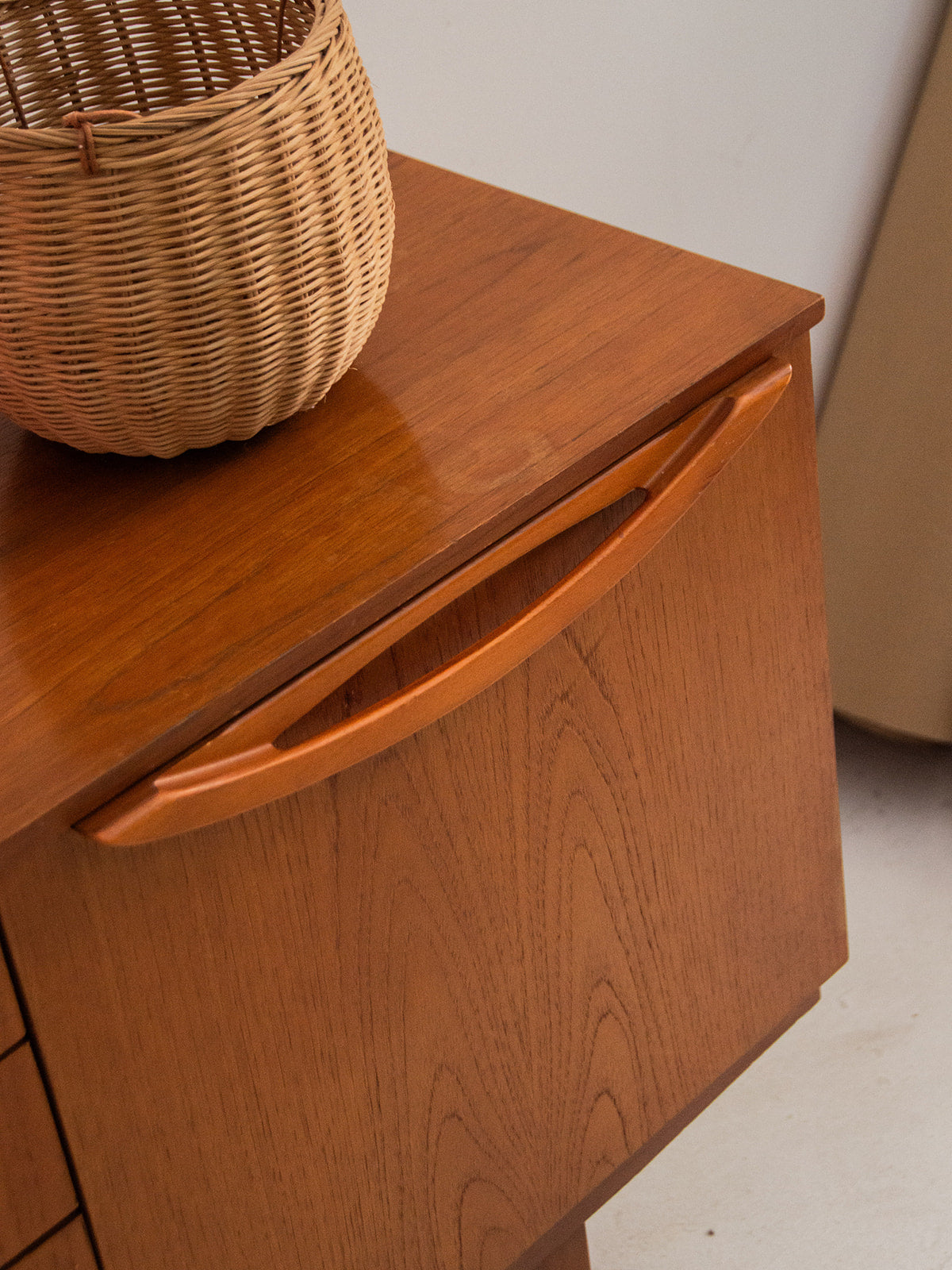 Discover this medium-sized vintage teak sideboard, a piece of furniture with a Scandinavian design from the 1960s. Featuring two doors and four drawers, it offers practical storage space while adding a touch of elegance to your home. Its meticulous finish and impeccable condition are a testament to its strength and timeless charm. Opt for an eco-responsible choice with this unique piece that will enhance your decor.