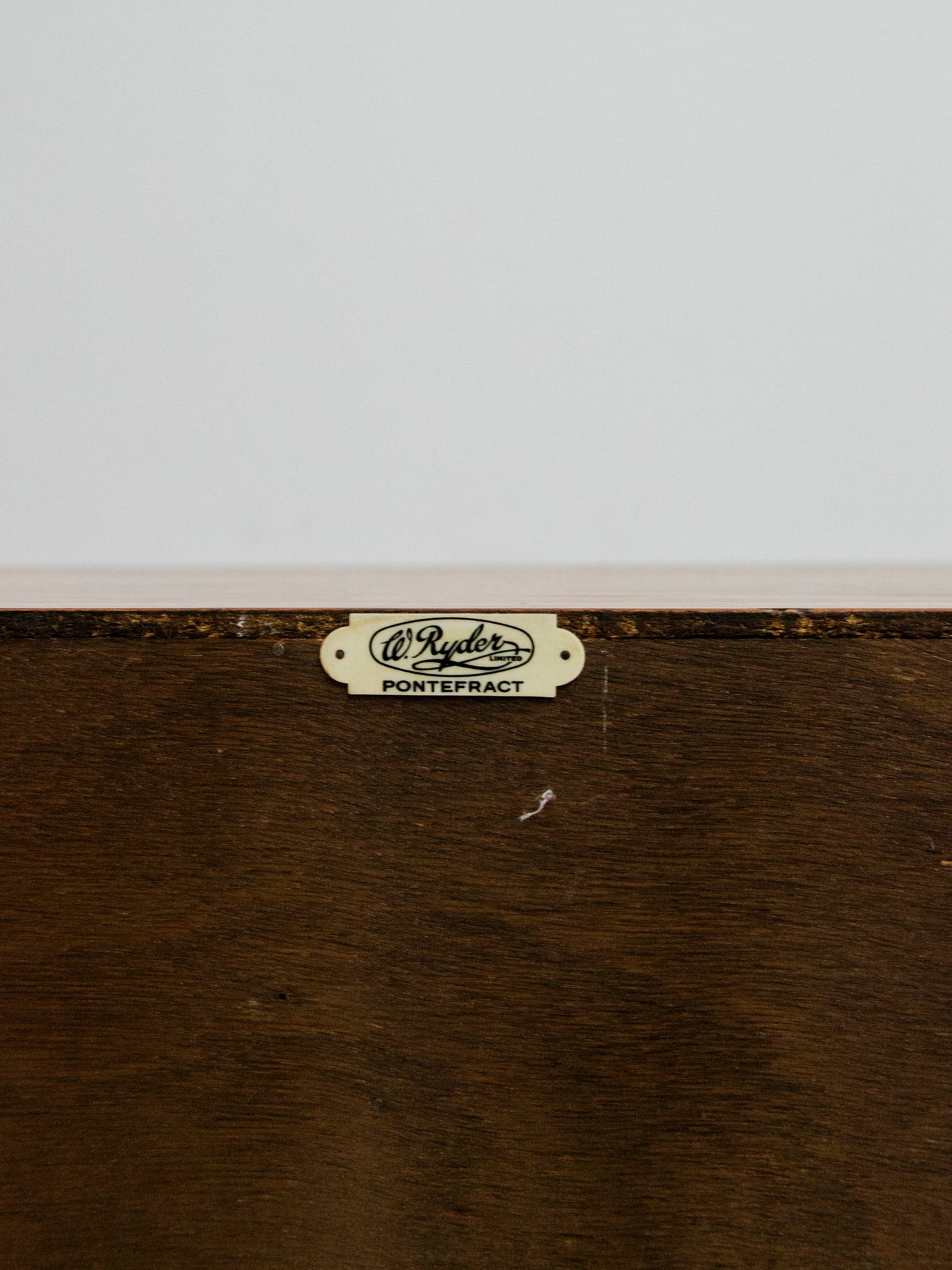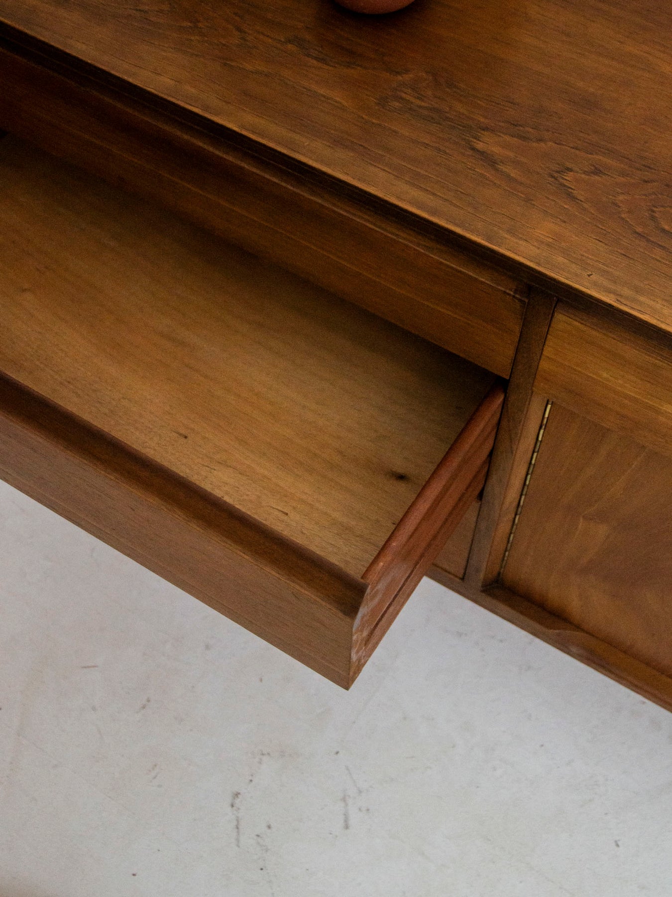 Grande enfilade en teck au bois foncé, incarnation discrète du style scandinave des années 1960. Elle offre un bel espace de rangement avec deux portes et cinq tiroirs (trois latéraux et deux au-dessus des placards), idéale pour organiser vaisselle, linge ou objets du quotidien. Les pieds fuseaux fins et les lignes épurées lui donnent une silhouette légère, parfaite pour une atmosphère vintage et contemporaine à la fois. Meuble solide et en très bon état, le teck confère une patine chaleureuse. Légères traces du temps qui participent à son charme. Légère tâche sur le plateau visible sur les photos.