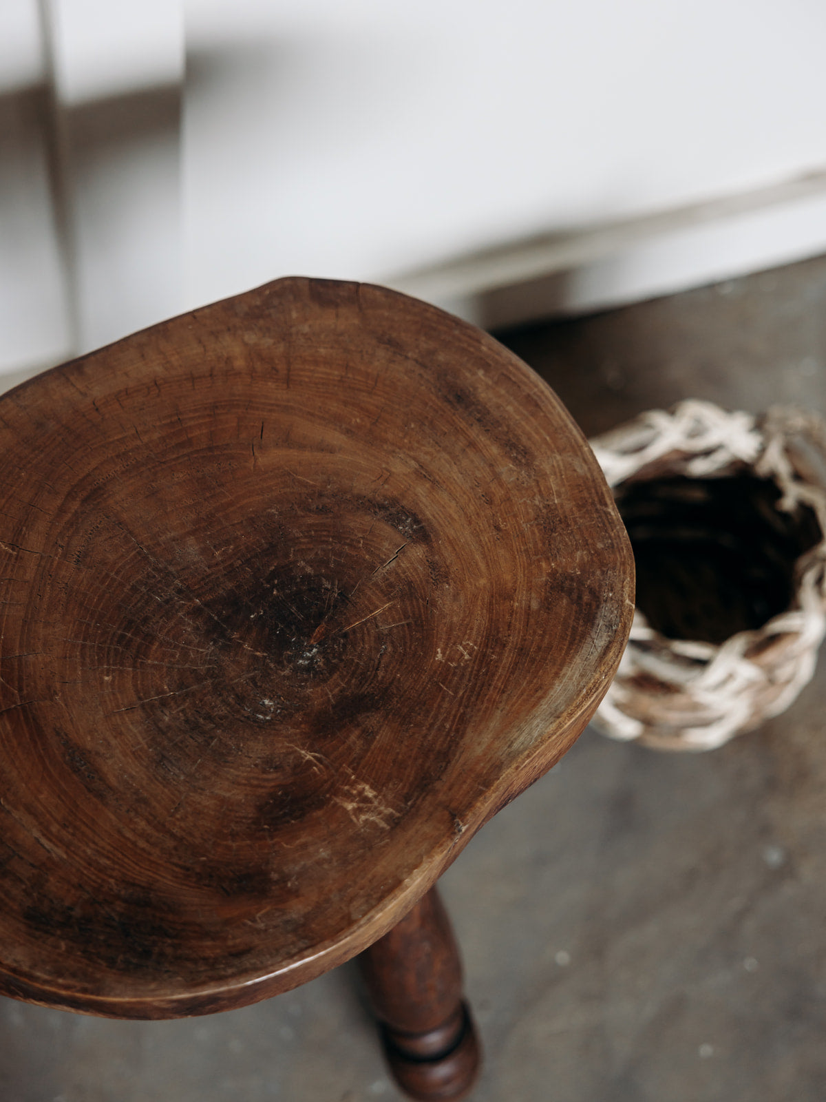 This brutalist wooden stool in a country style is distinguished by its organically shaped seat and its pretty details inspired by the wood stump, bringing a natural and authentic touch. The three engraved legs add an extra charm to this unique piece. Ideal as an occasional seat or decorative element, it creates a warm, country atmosphere in any interior.