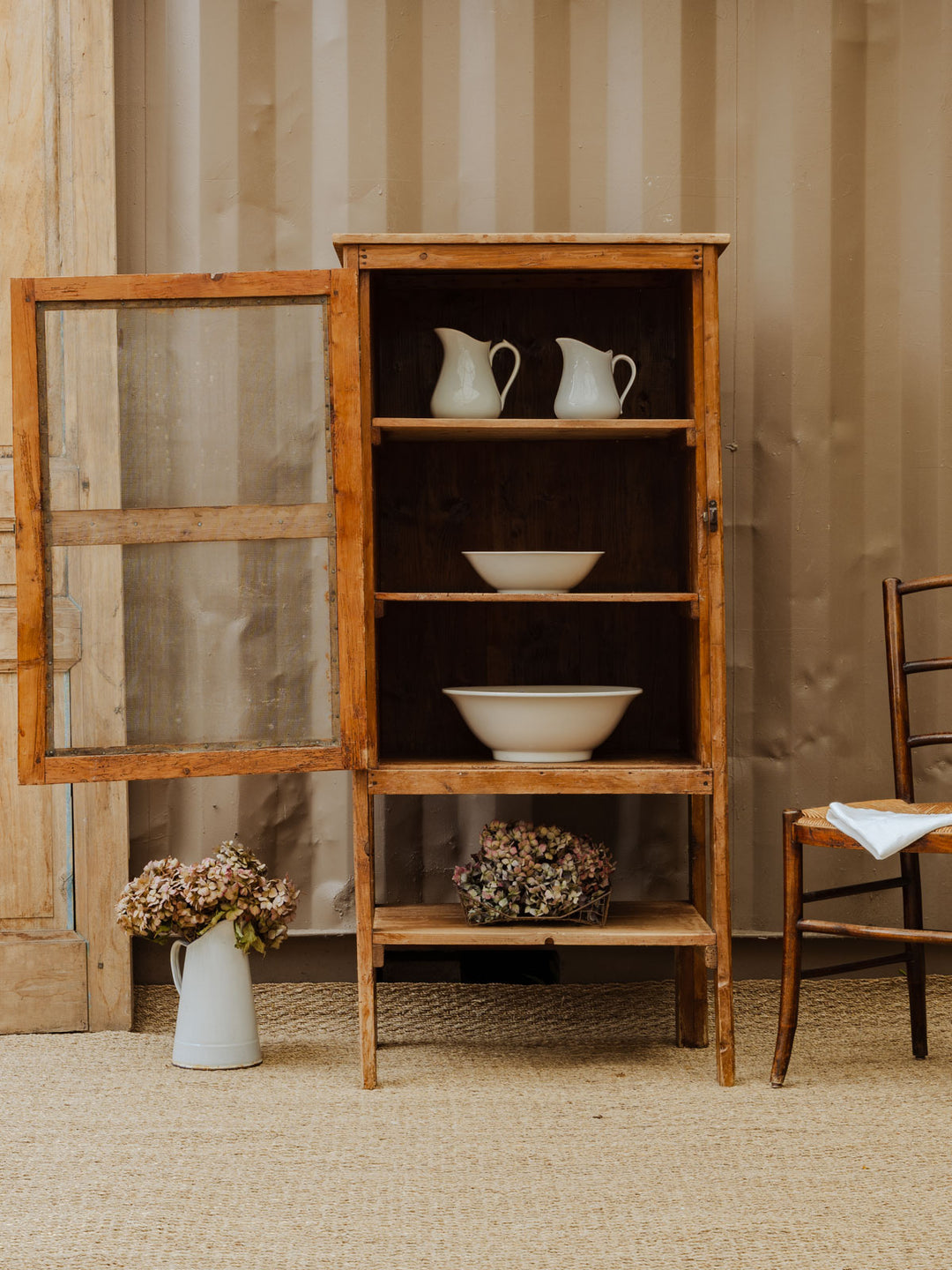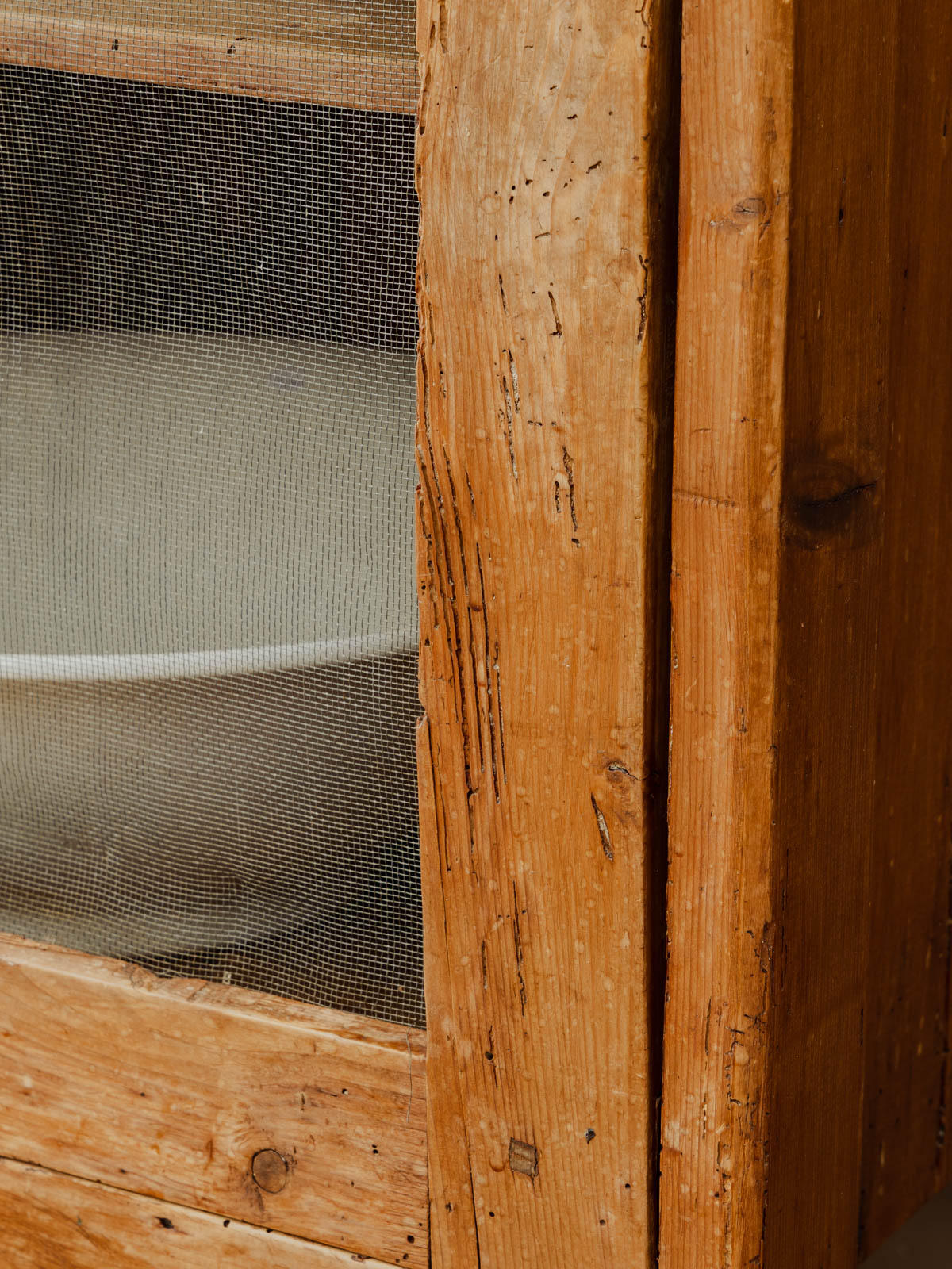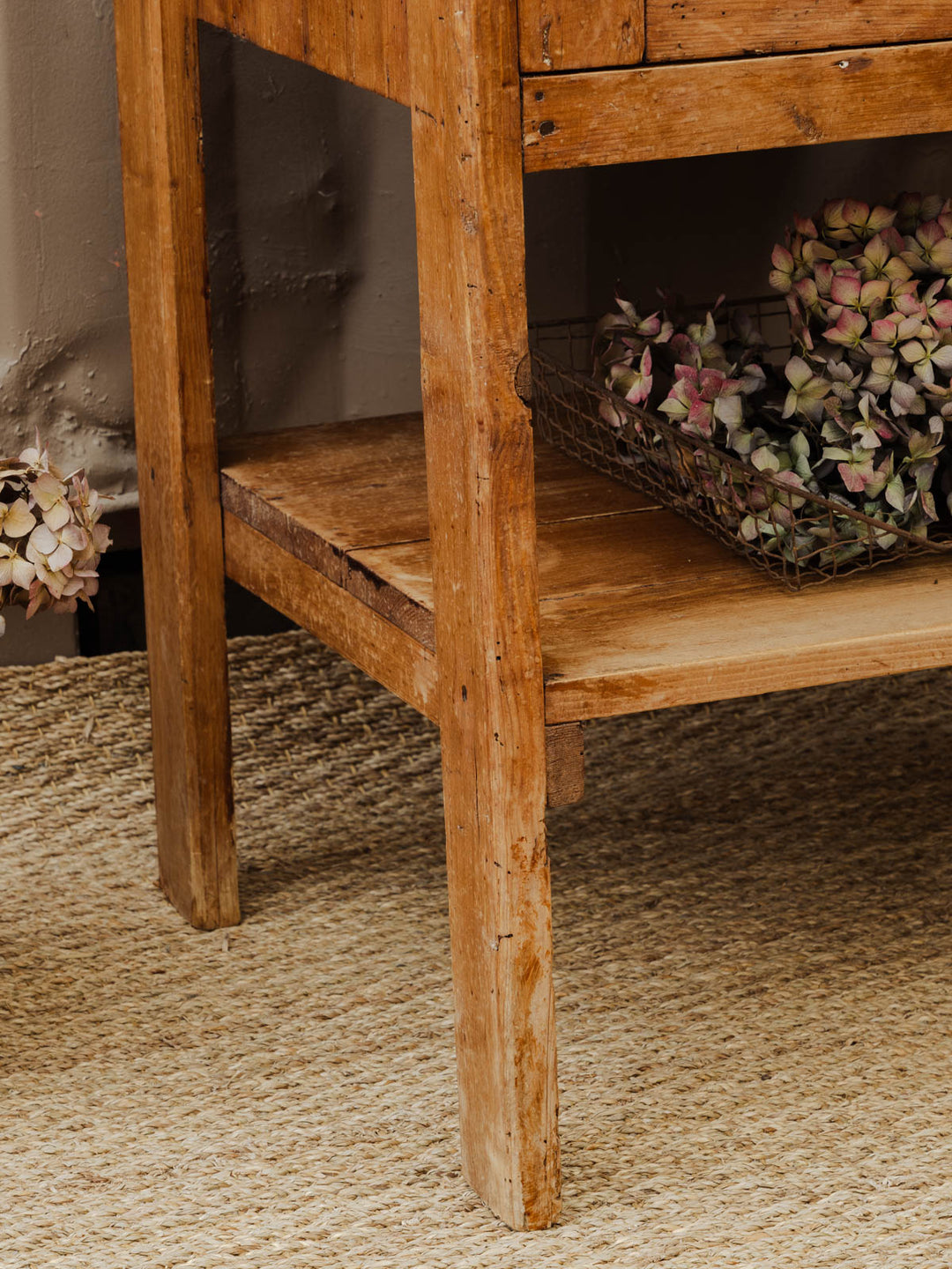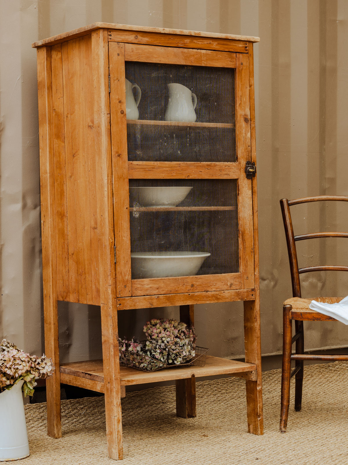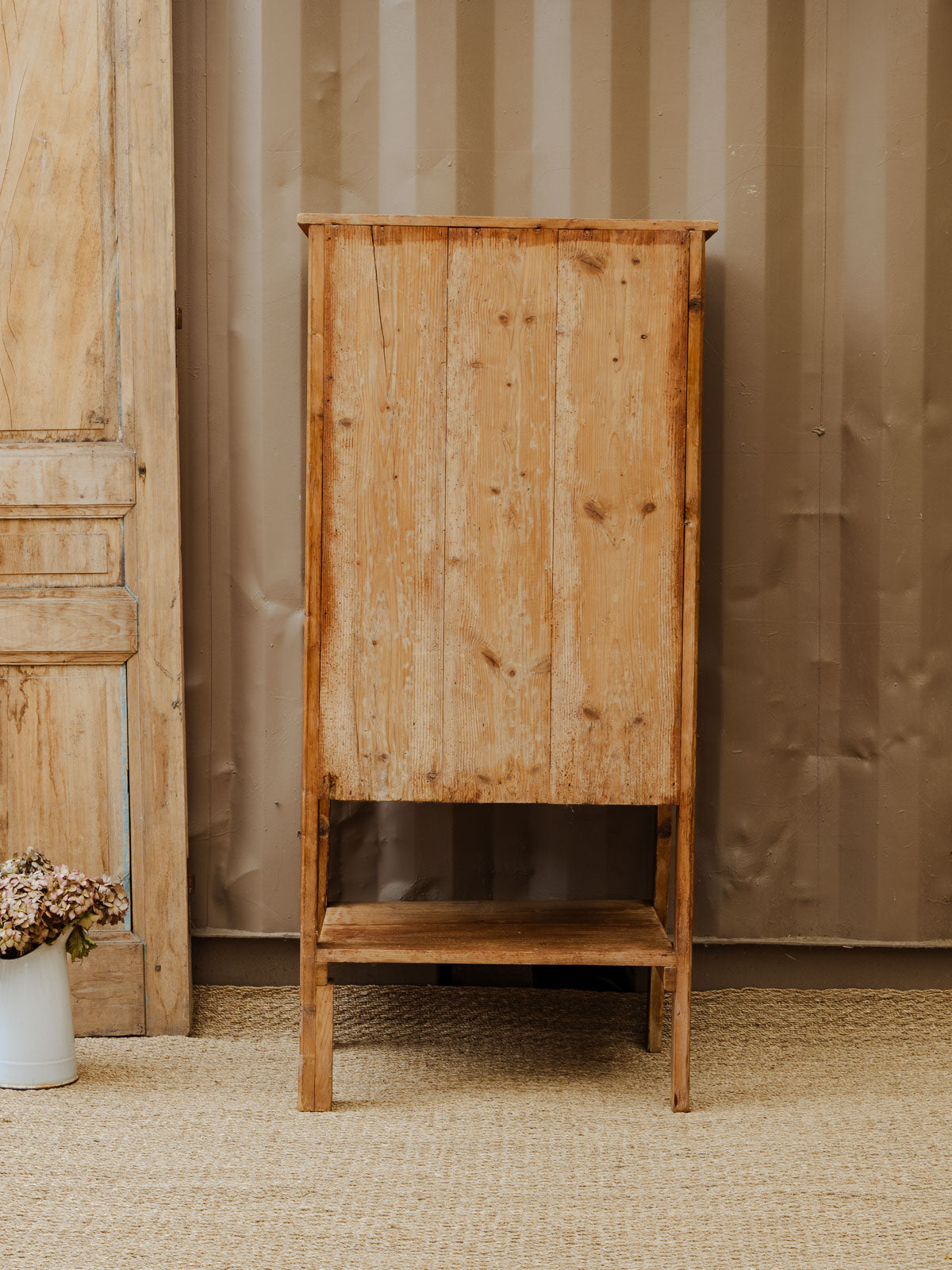 This solid pine pantry, inspired by Ardèche folk art, captivates with its warm patina and rustic authenticity. One leg has been reinforced to ensure flawless stability, while the carefully preserved split top remains fully functional. Three exterior storage levels provide generous space for your supplies, complemented by a discreet under-shelf. The original lock, faithful to tradition, ensures a secure closure and adds a touch of authenticity. Perfect for infusing your home with country charm.