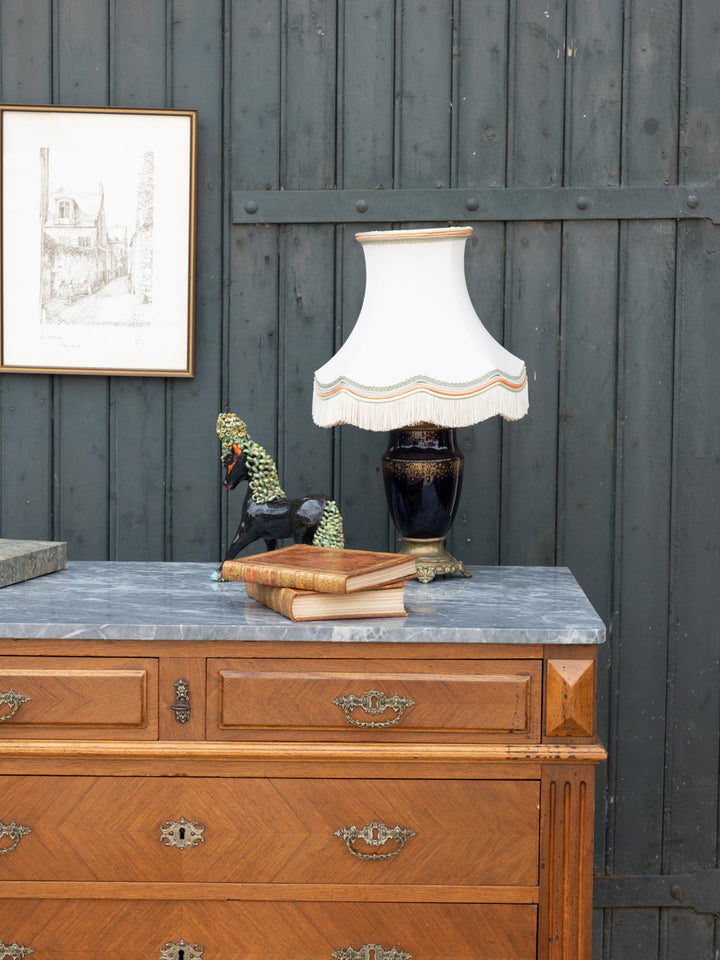 Discover this elegant table lamp with vintage charm, enhanced by a pagoda-shaped shade adorned with fringes. Its delicately crafted earthenware base and brass base add a refined touch to the ensemble. Ideal for creating a cozy ambiance on a console table or bedside table. Its delicately retro style draws the eye without being over the top. A decorative piece that's as functional as it is decorative.