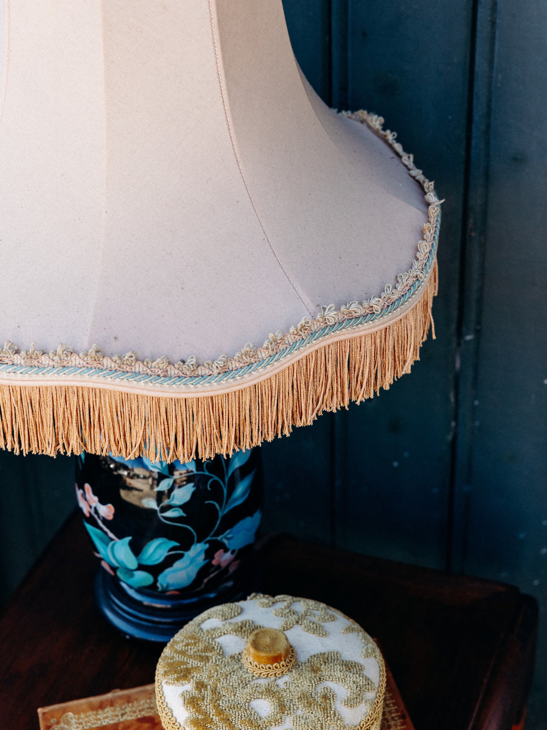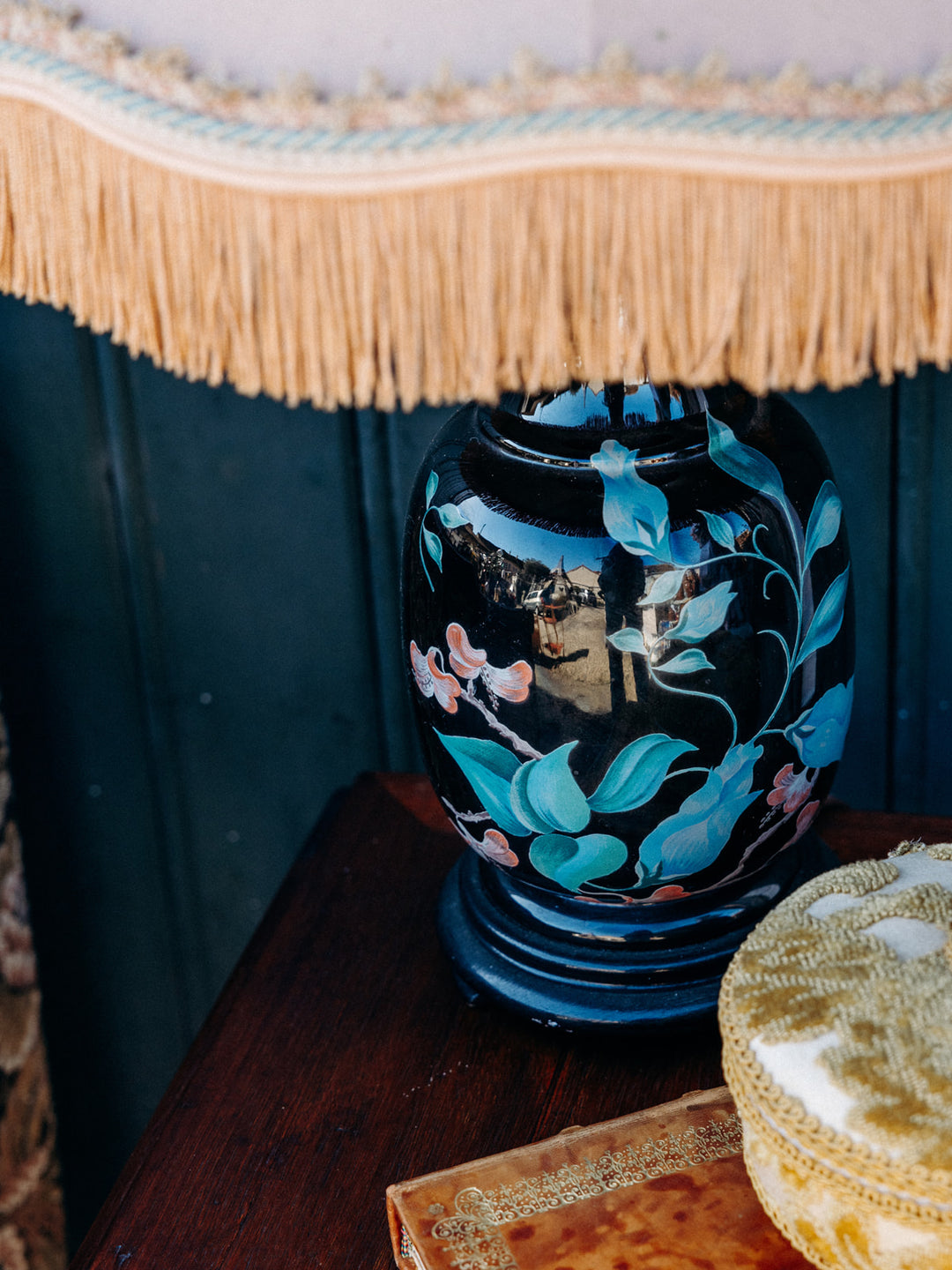 Bring a touch of elegance to your home with this refined table lamp. Its black earthenware and wood base, enhanced by an organic print, contrasts harmoniously with its beige canvas lampshade, enhanced with delicate fringes and subtle green details. A timeless accessory that diffuses a soft, warm light, perfect for creating a cozy and chic ambiance.
