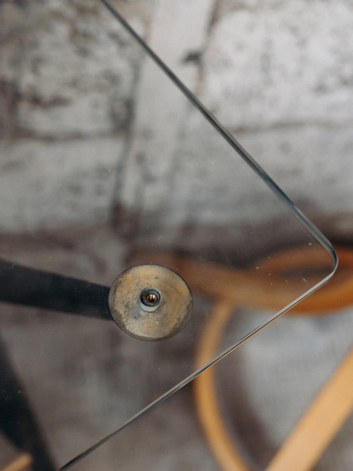 Discover this vintage-style serving trolley, combining an elegant glass top with a sleek black metal frame. It features a built-in gold magazine rack, both practical and decorative. Mounted on vintage casters, it moves easily from room to room. Please note: a small element is missing, but this doesn't affect its functionality or charm. An ideal piece for adding a retro and practical touch to your home.