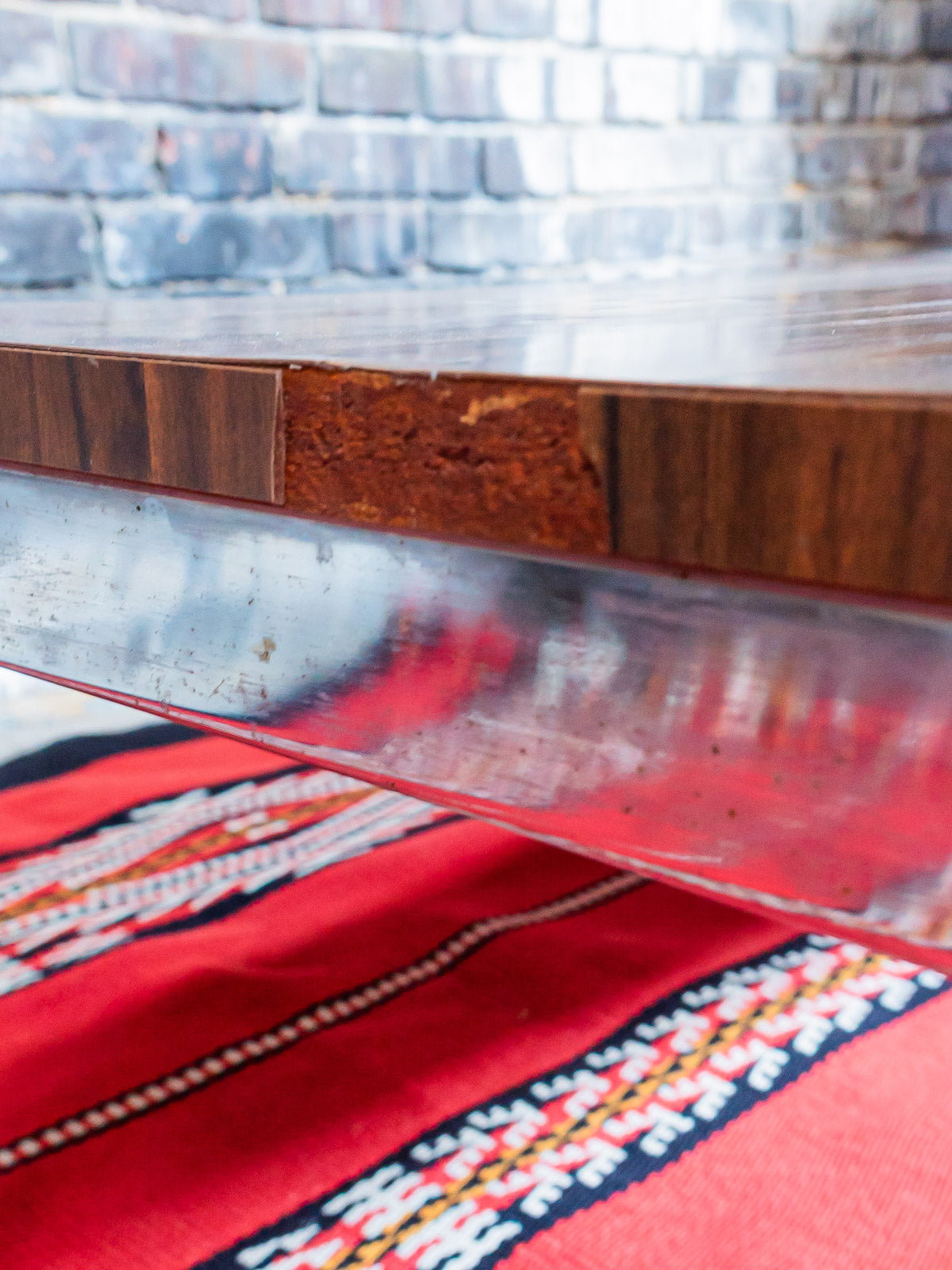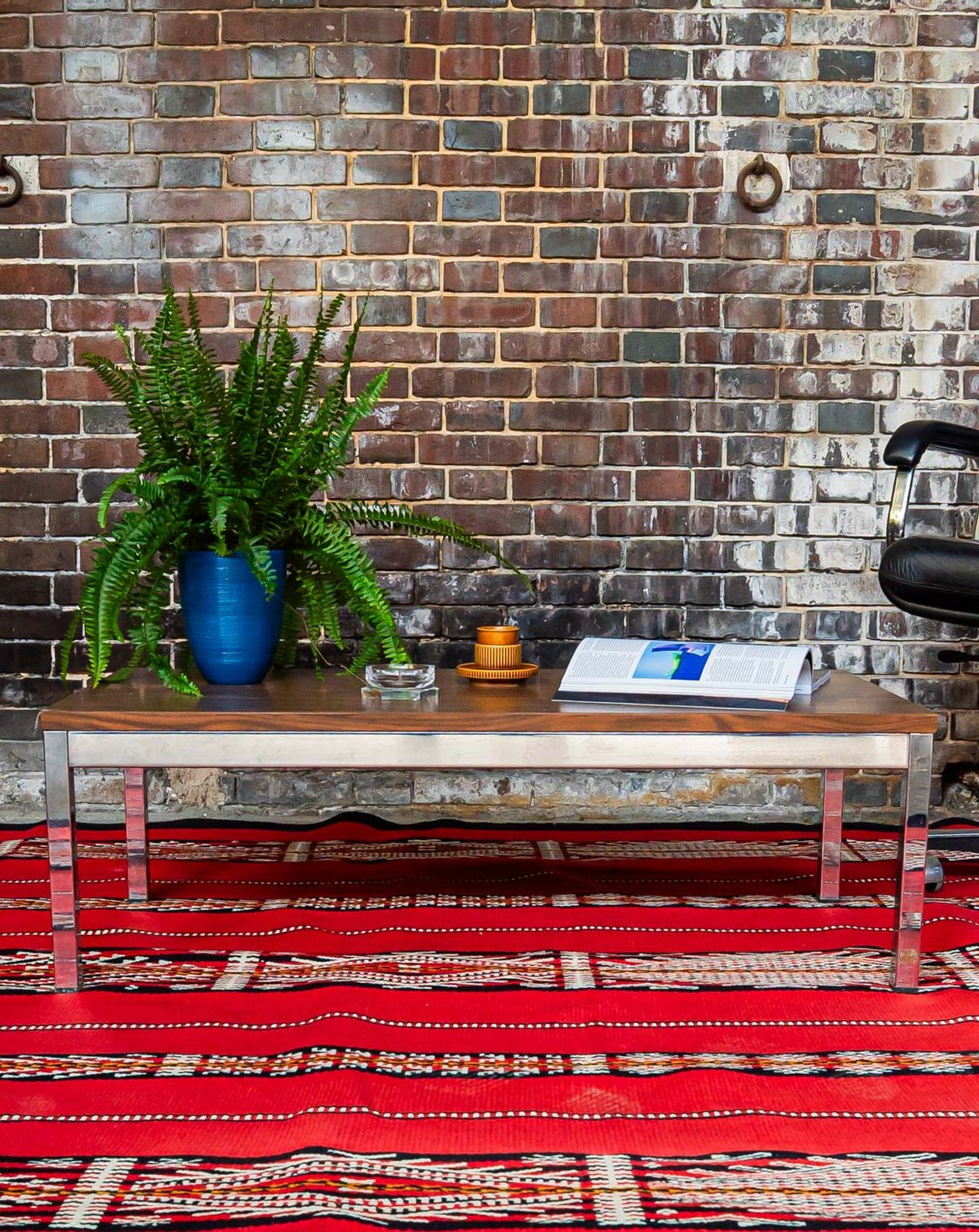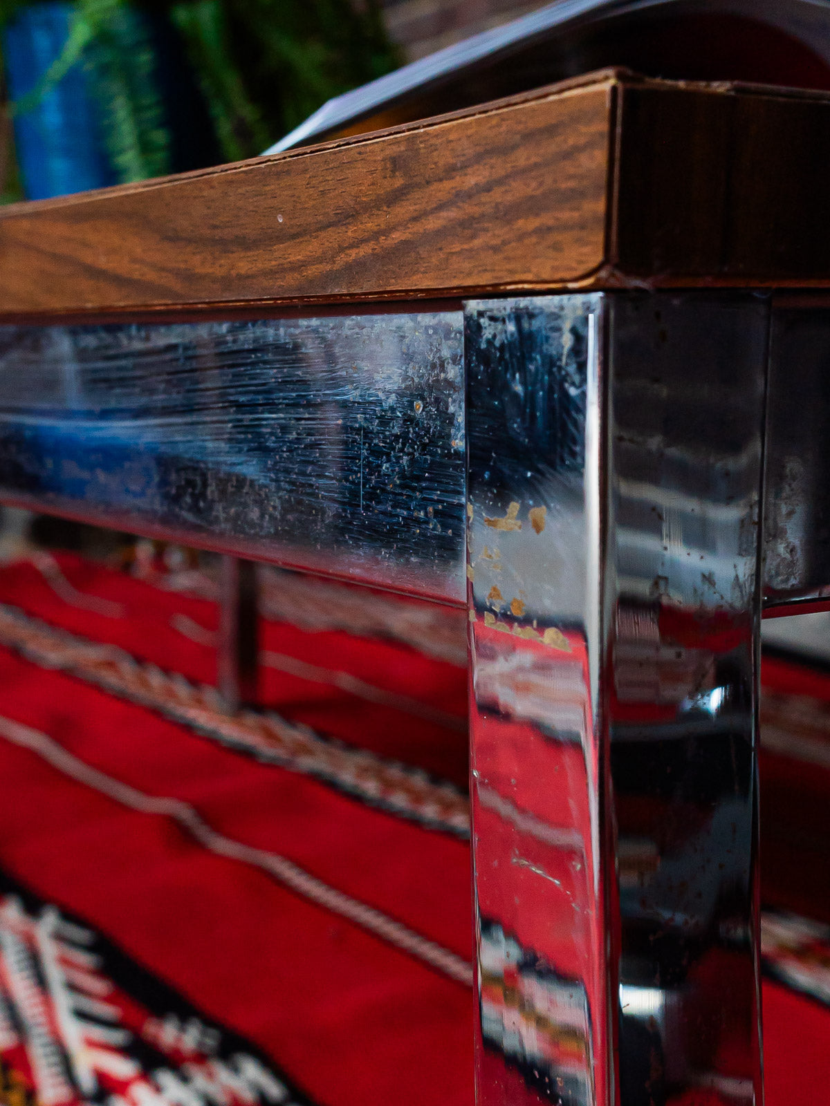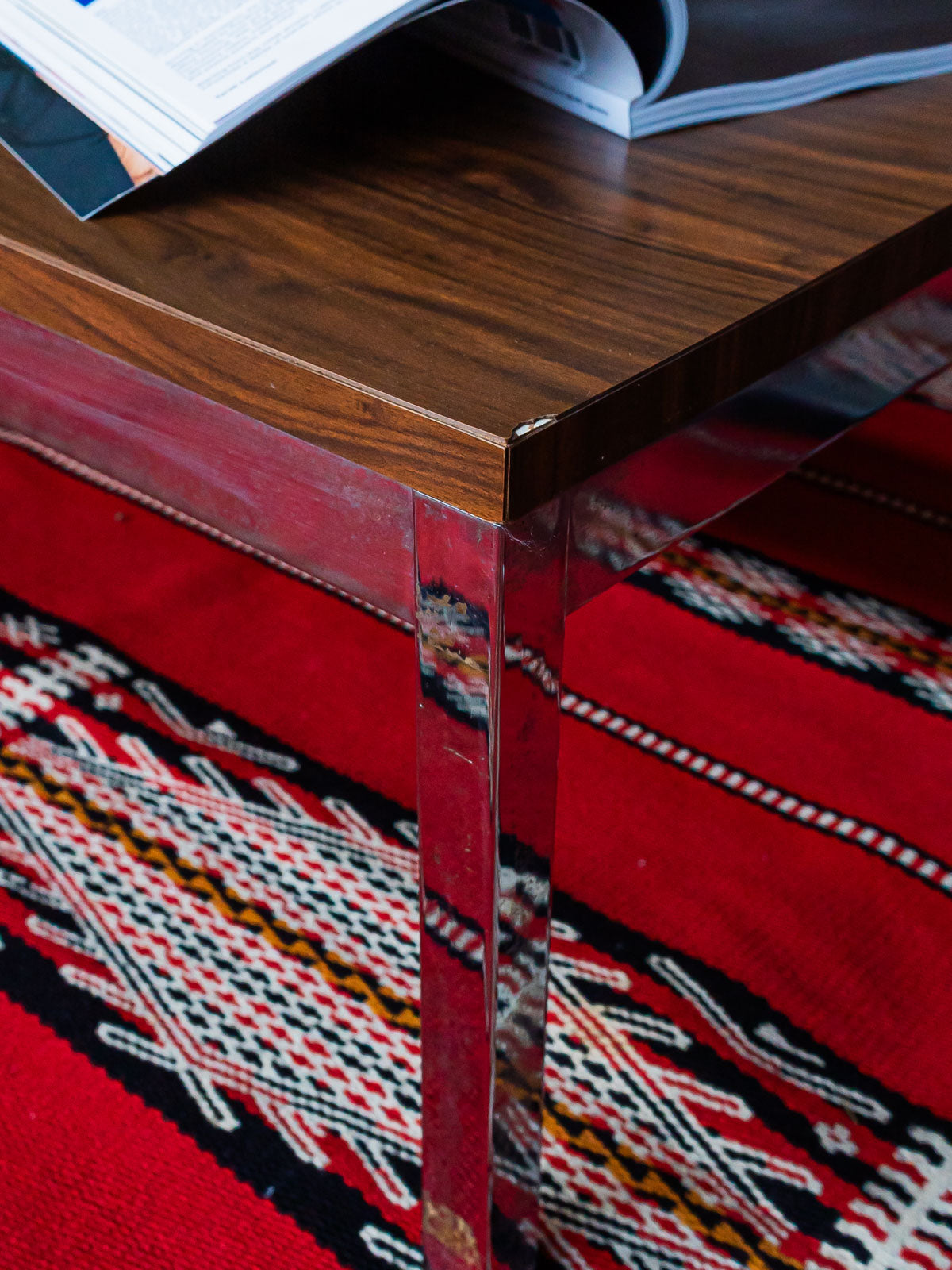 Immerse yourself in the retro atmosphere of the 70s with this coffee table with its square chrome base and wood-effect Formica top. Its iconic design evokes a time when style and functionality blended harmoniously. Although it has some chips on the top and a few marks on the legs, these imperfections add an authentic charm to this vintage object. Perfect for adding a touch of originality to your living room, this table will appeal to lovers of old-world design. See the photos to appreciate its unique character.
