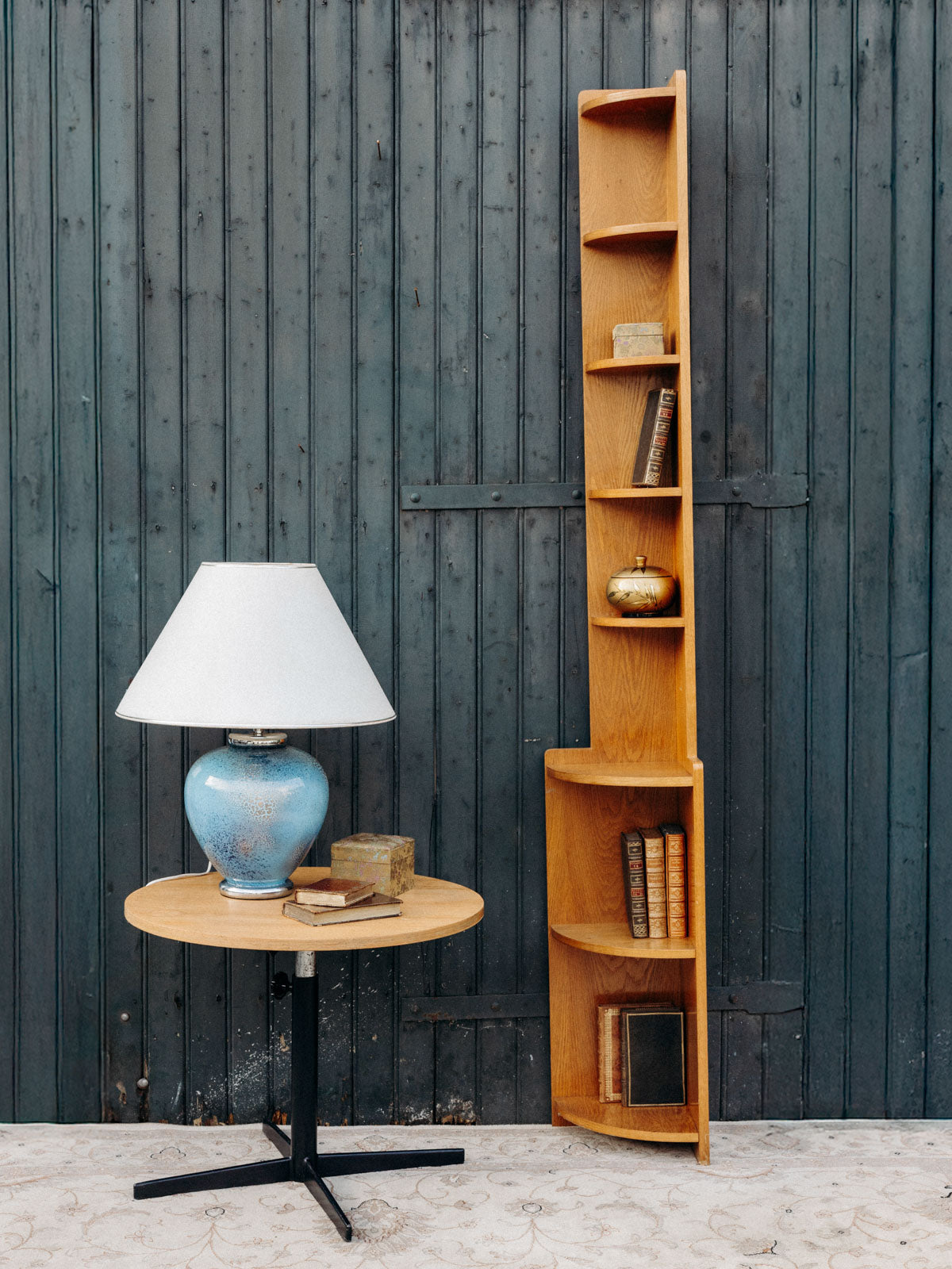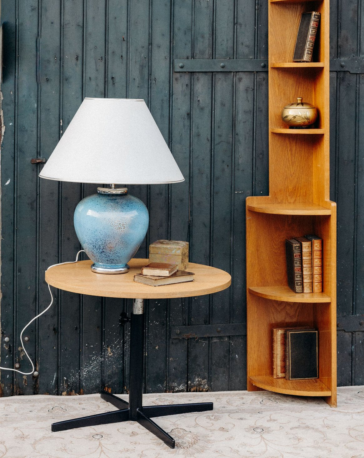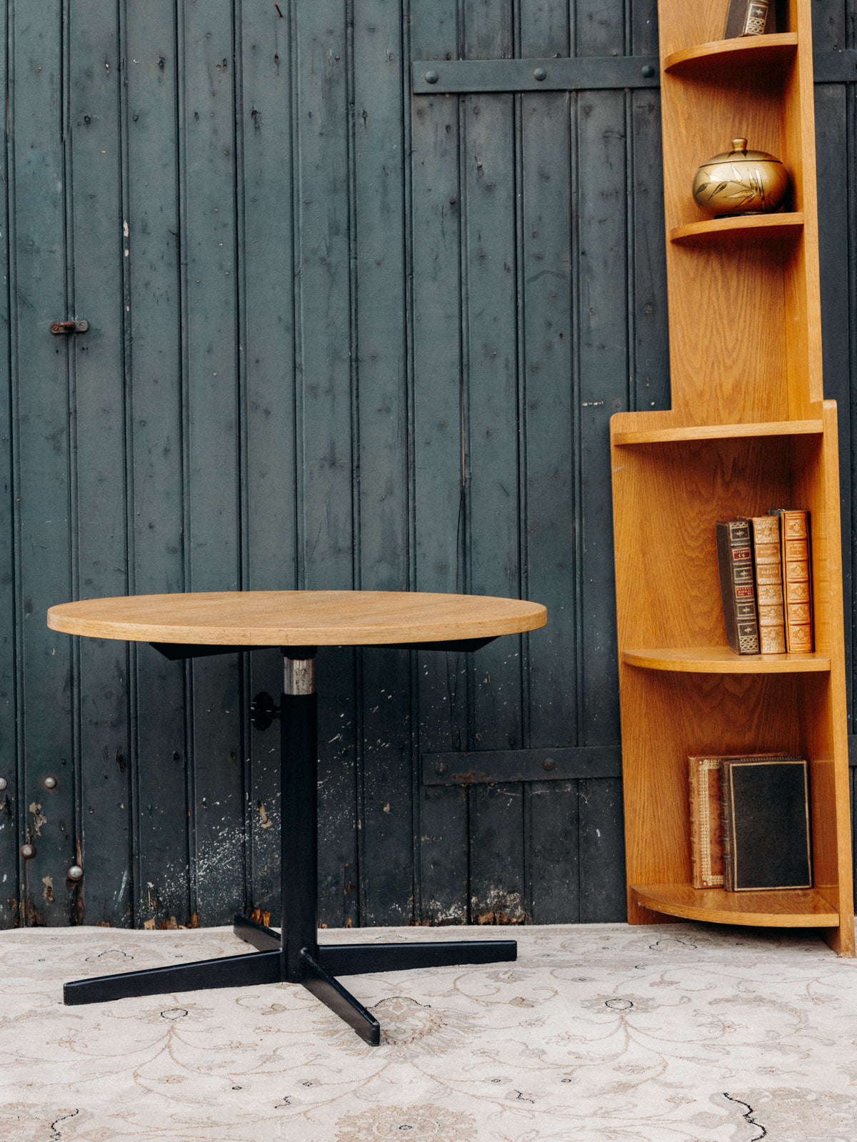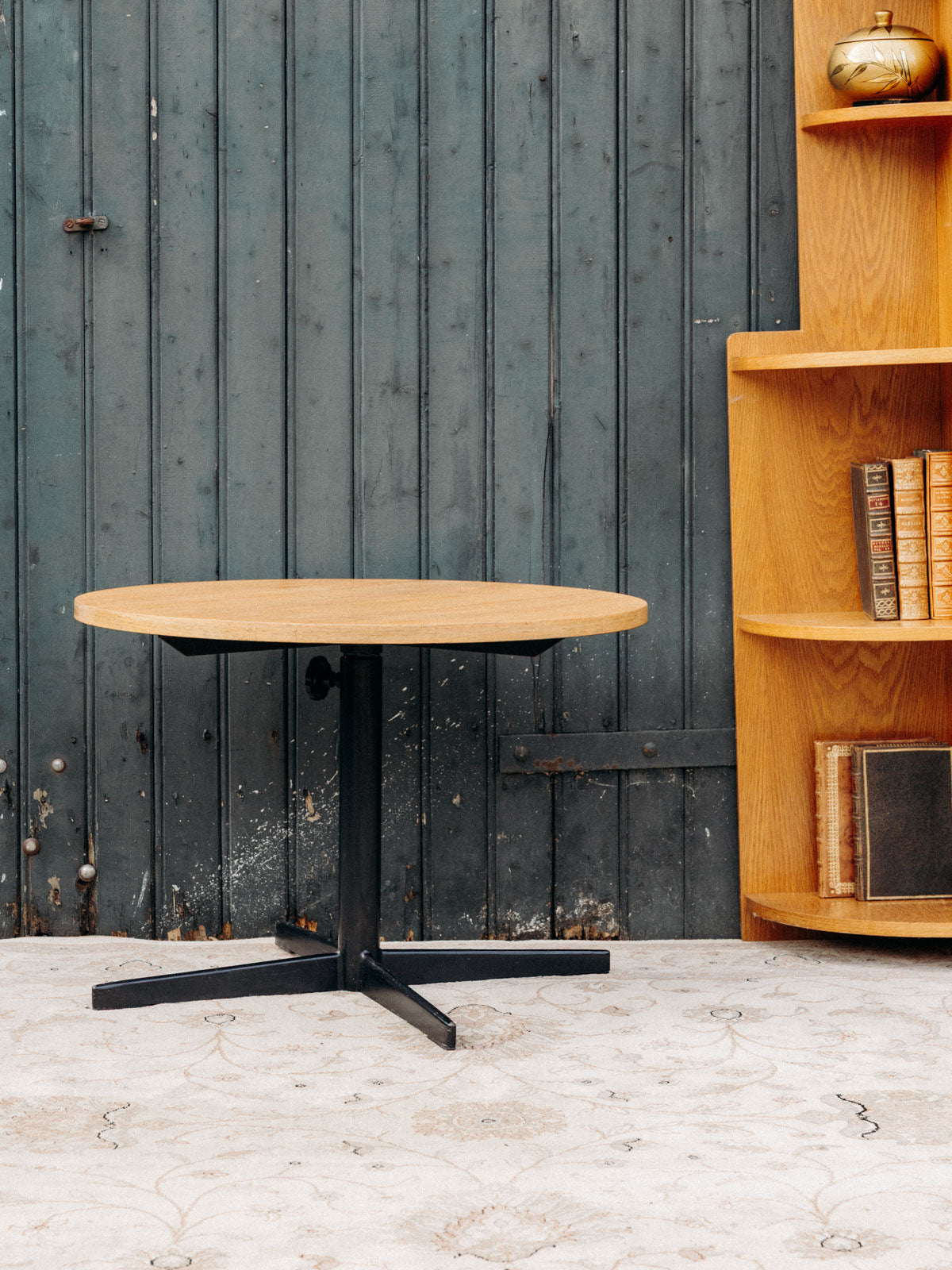 Discover our elegant round coffee table, combining a light wood top with a central black metal leg. This combination of materials adds a contemporary touch to your interior while ensuring excellent stability. The top shows some signs of age, which add to its charm and reflect its history. Ideal for a modern living room, it will complement your convivial moments with simplicity and character. Its sleek design allows it to easily integrate into any decor.