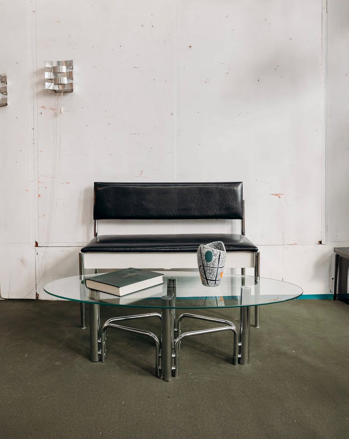 Discover our elegant glass and metal coffee table, a true symbol of modernity and refinement. Featuring a partially striped oval glass top, it brings a touch of light to your living room while accentuating the sophistication of your decor. The crafted legs add a unique, handcrafted dimension to this piece, offering a perfect harmony between contemporary design and functionality. This coffee table is the ideal choice to enhance your living space.