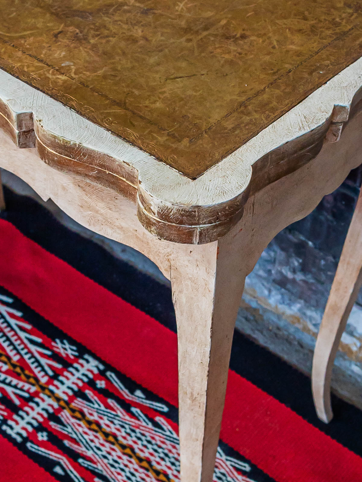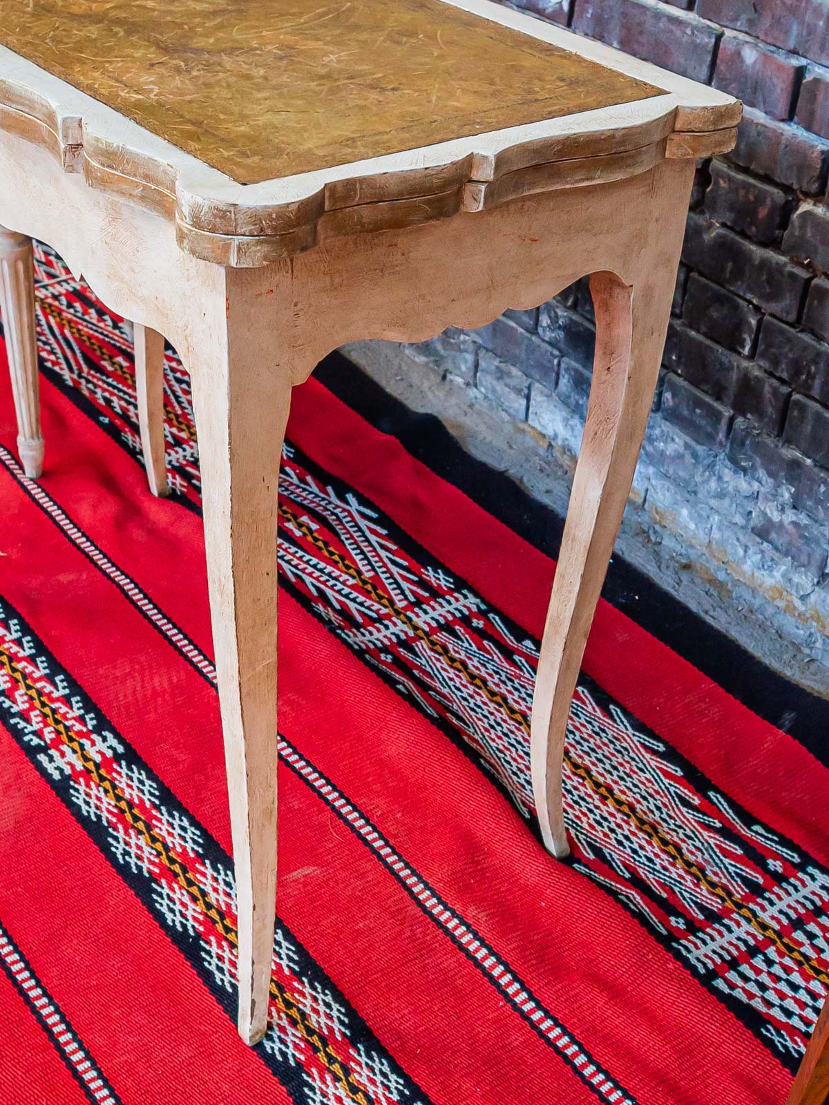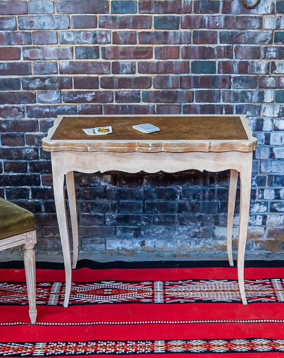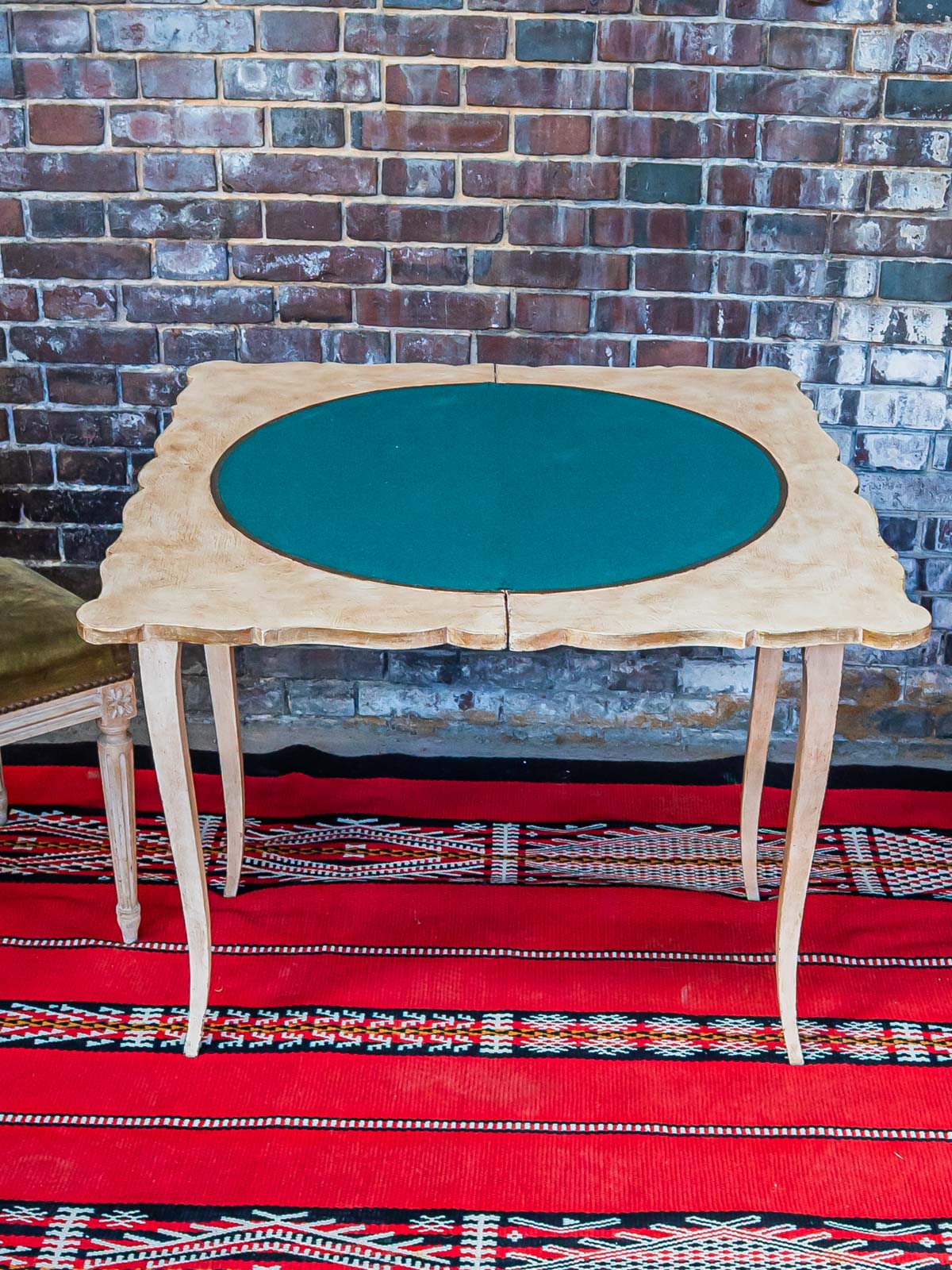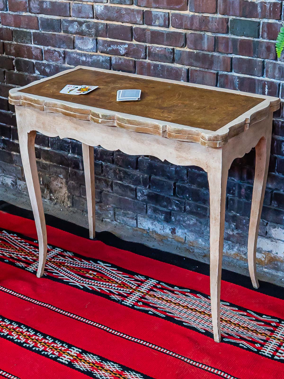 Discover this elegant console and game table in ecru painted wood, adorned with a delicate golden patina, emblematic of the 60s. Its closable top reveals a green felt interior, ideal for your card games, while the patinated leather exterior adds a touch of sophistication and vintage charm. Perfect for enhancing your interior, this piece brilliantly combines functionality and aesthetics.