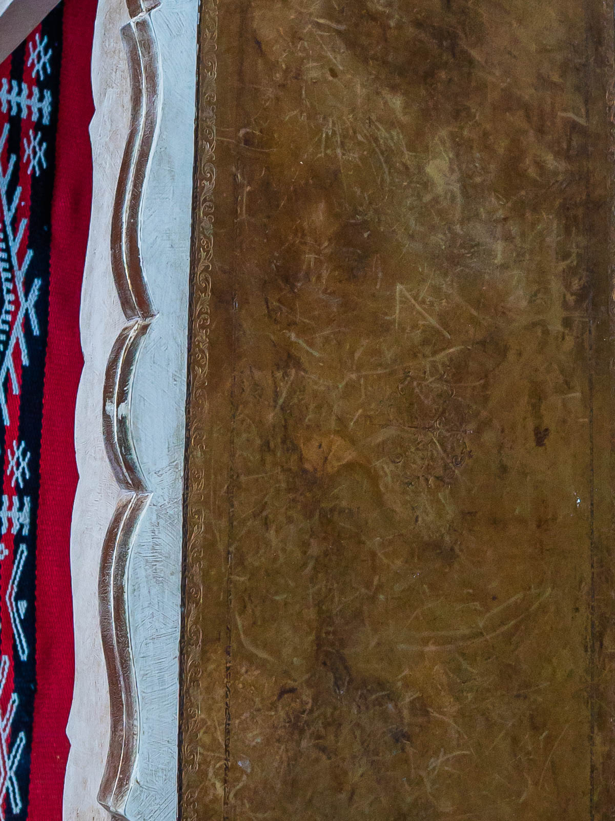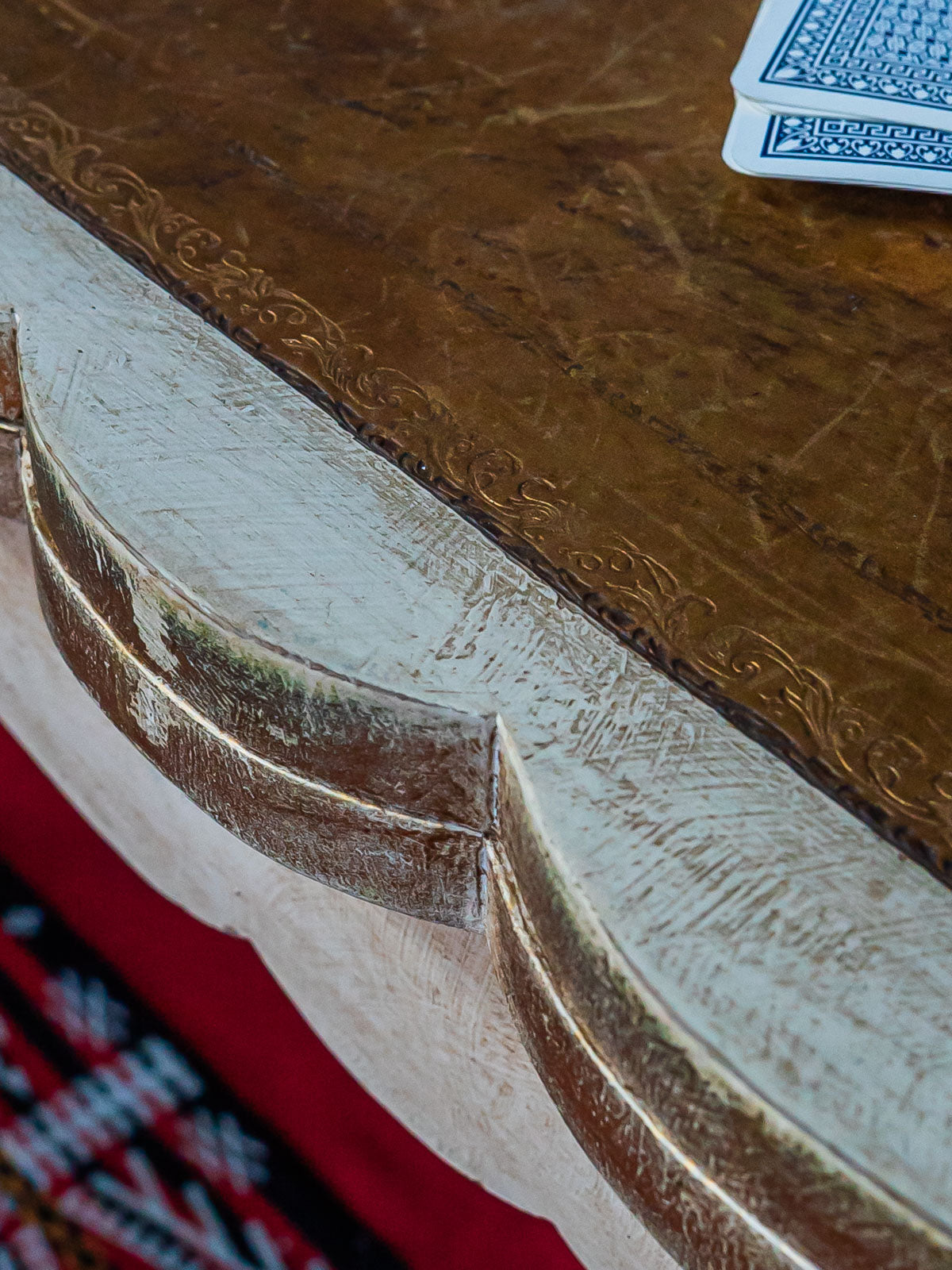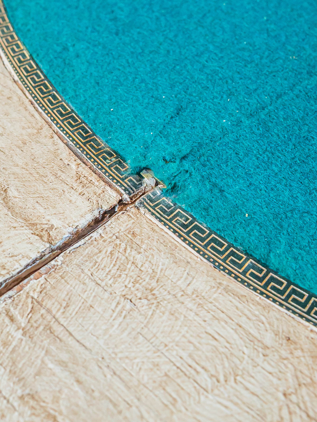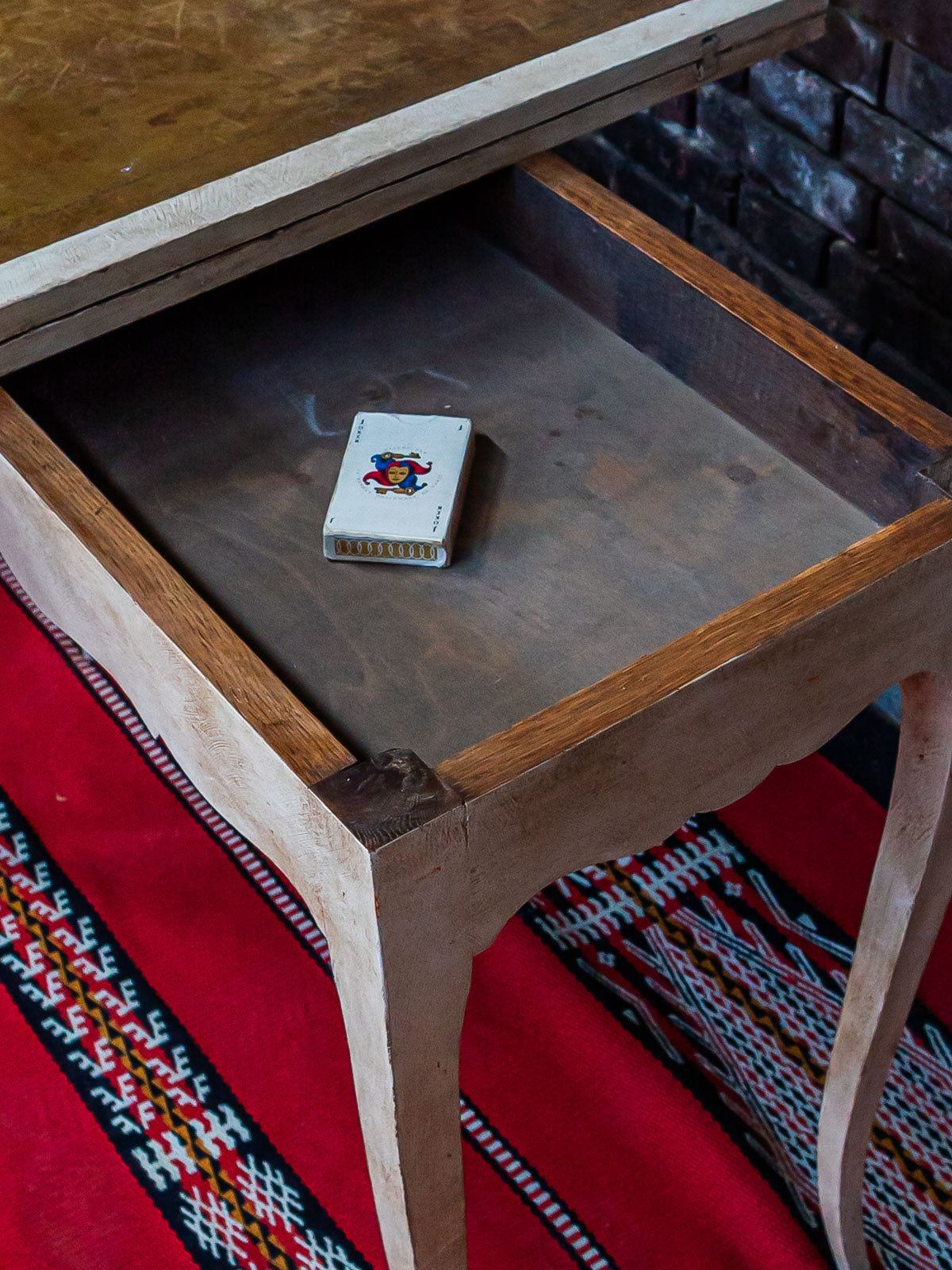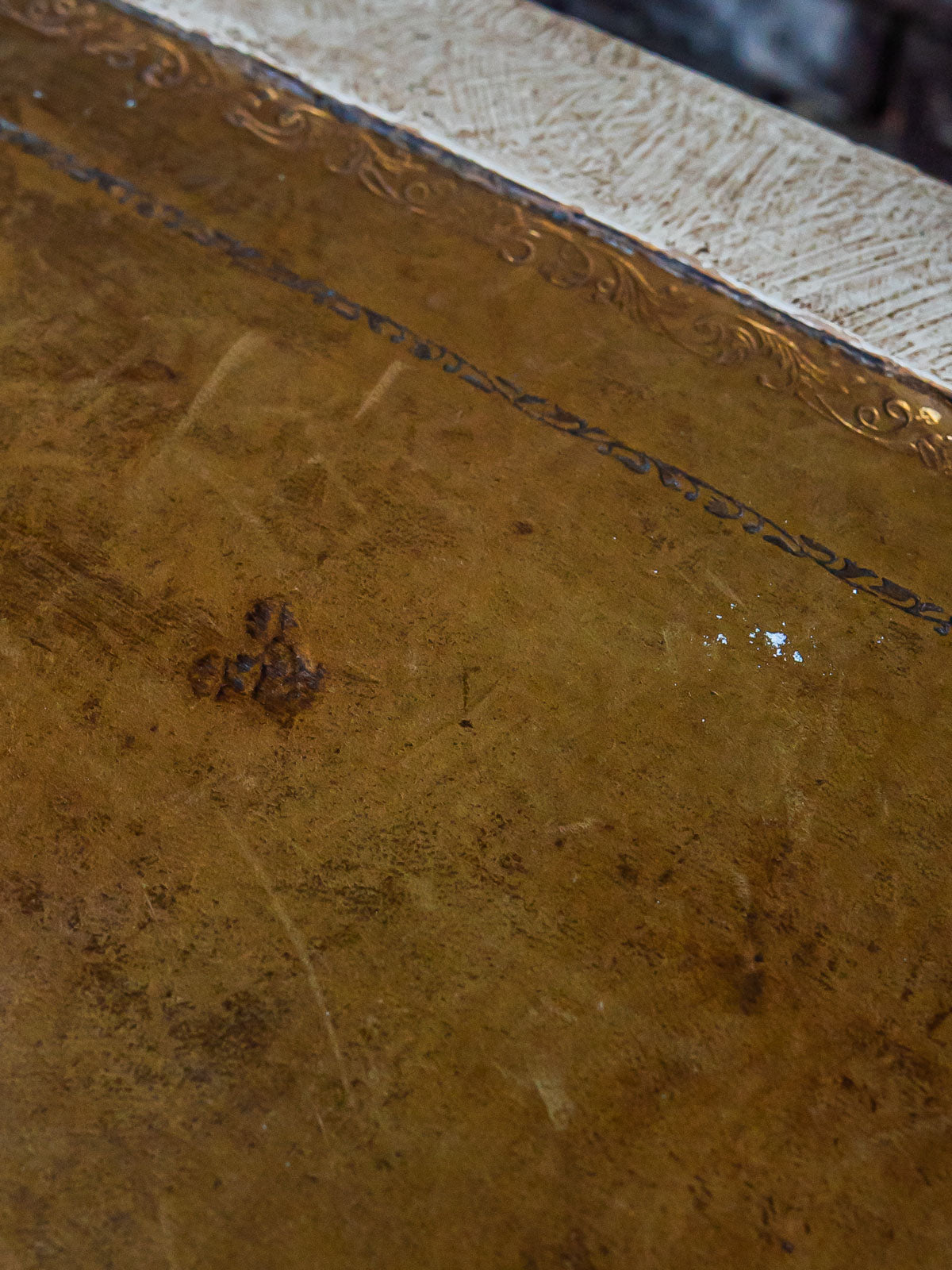 Discover this elegant console and game table in ecru painted wood, adorned with a delicate golden patina, emblematic of the 60s. Its closable top reveals a green felt interior, ideal for your card games, while the patinated leather exterior adds a touch of sophistication and vintage charm. Perfect for enhancing your interior, this piece brilliantly combines functionality and aesthetics.