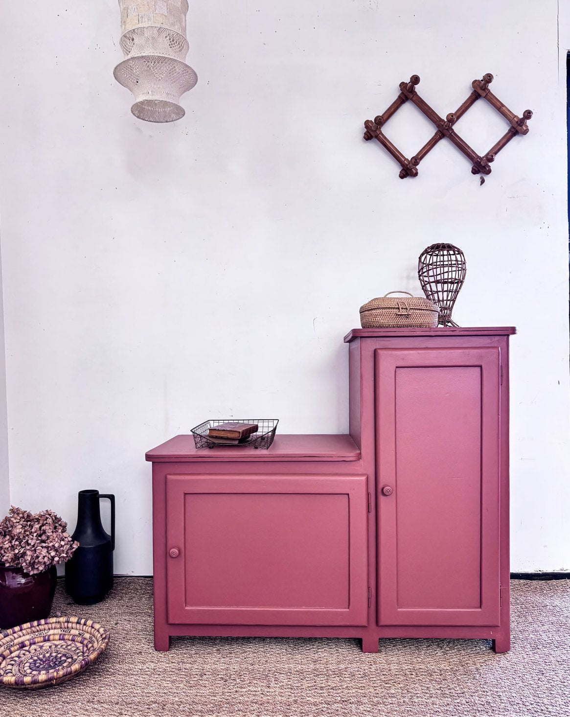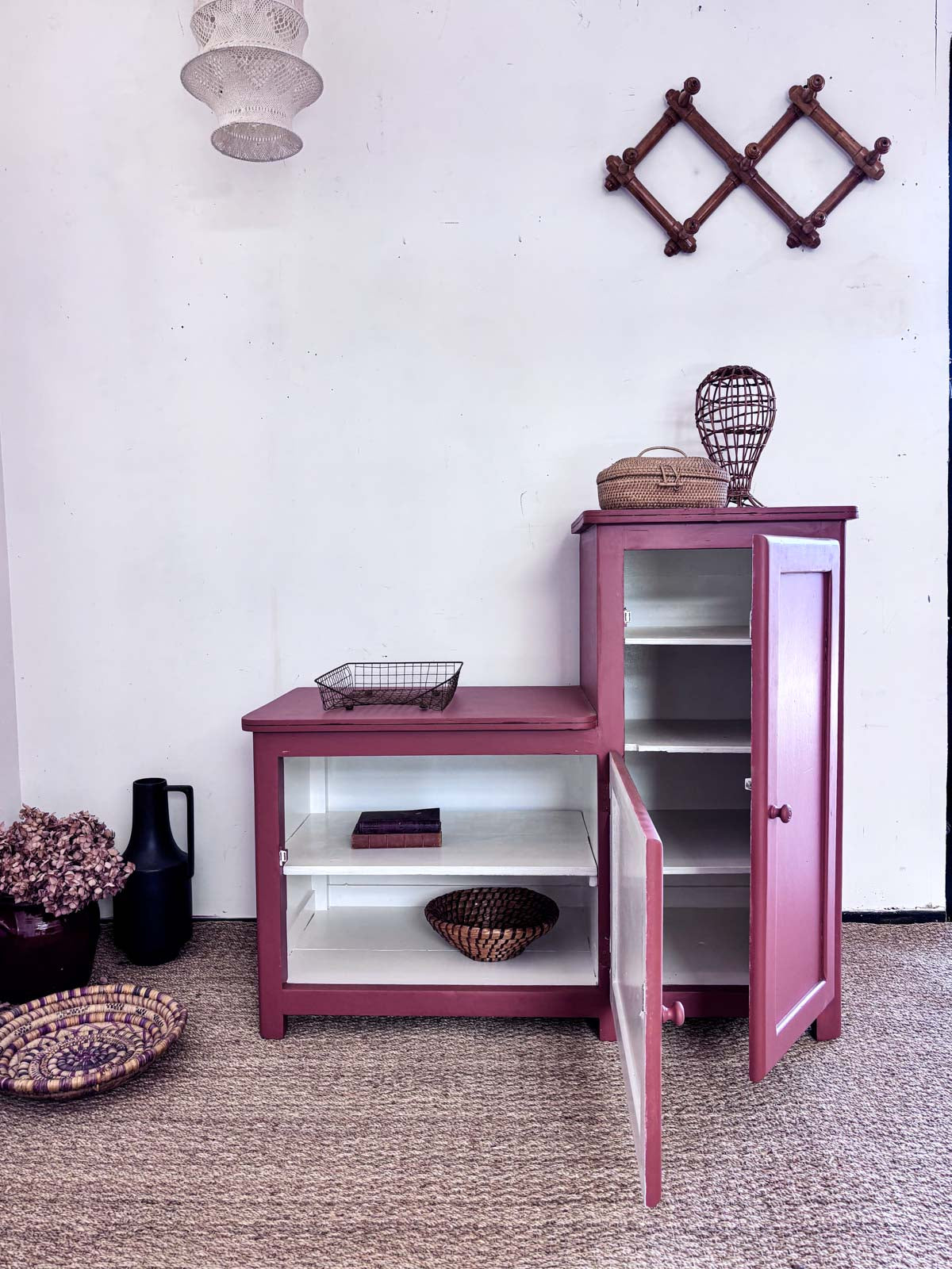 Discover this asymmetrical sideboard in Earth Clay, a true tribute to 1950s design. With its two doors at the top and a shelf at the bottom, it offers a perfect balance between functionality and aesthetics. Its three spacious shelves will allow you to display your decorative objects in style. Made of veneer, this piece combines robustness and elegance. Make this piece a centerpiece of your interior.