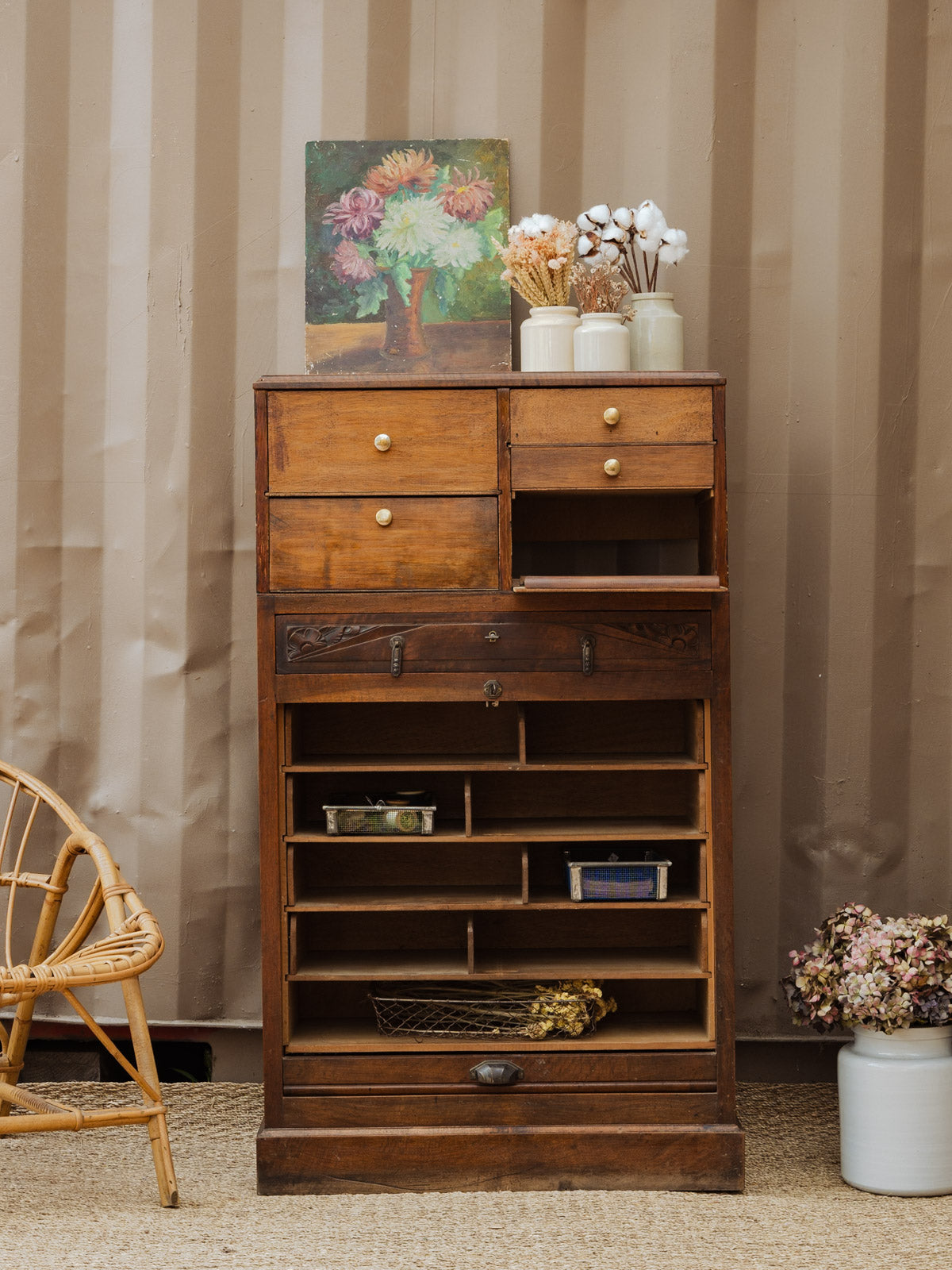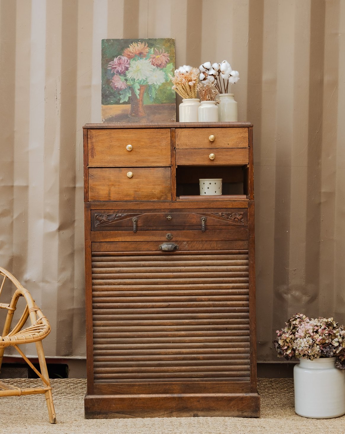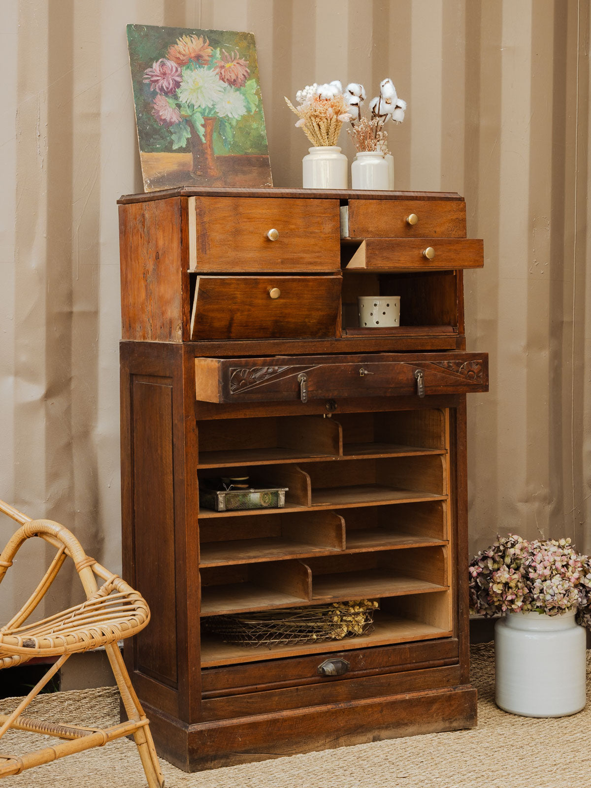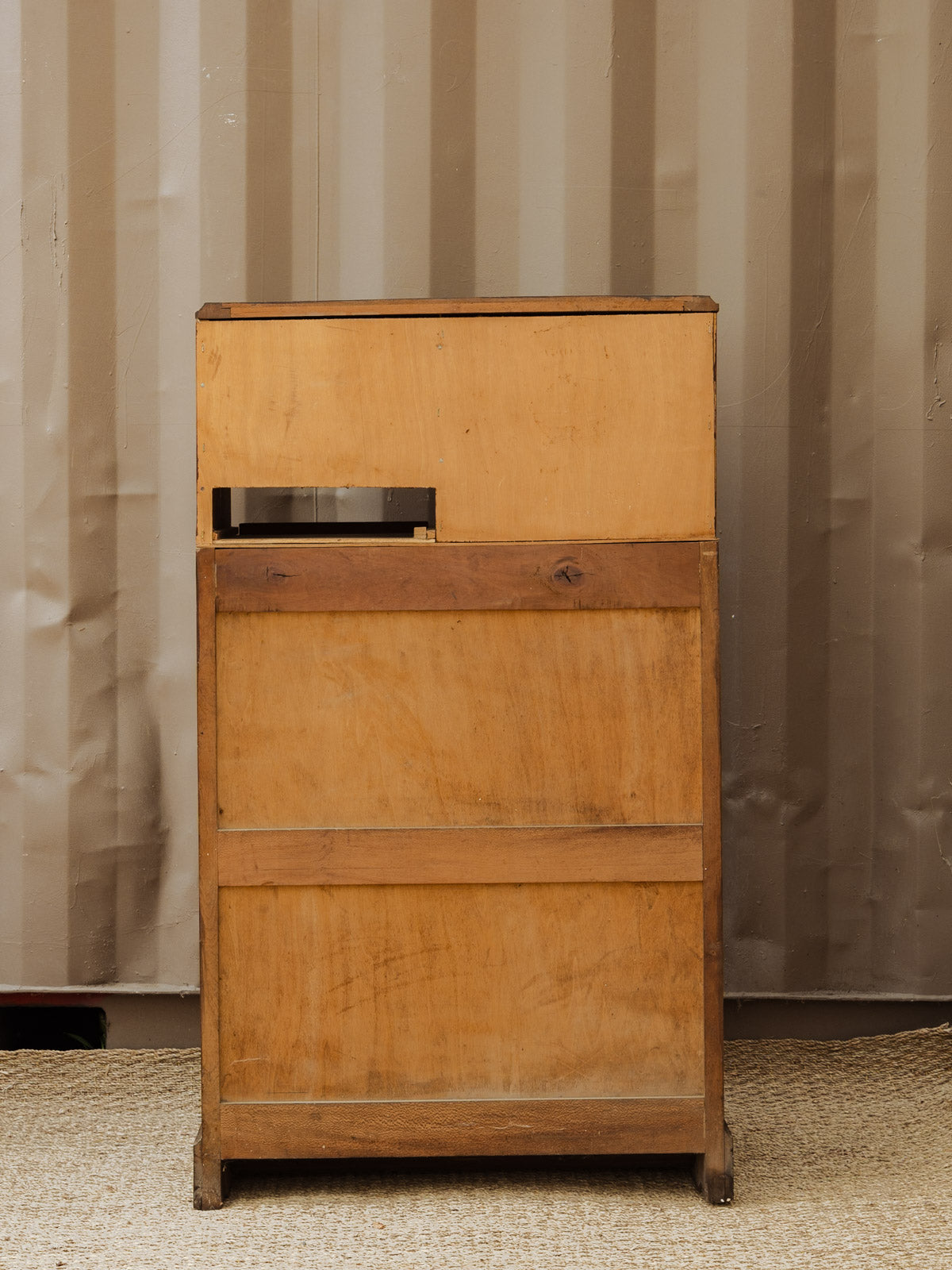 Discover this 1920s Art Deco office furniture, combining elegance and functionality. Its pine upper part has been carefully added, an elegant combination of pine and walnut in the lower part. Its four drawers equipped with metal and brass handles, its niche with sliding tray, and its four removable compartmentalized shelves offer optimal storage space. The keys for the curtain and the drawer add a touch of character to this exceptional piece of furniture. Ideal for an office or a work corner with a timeless style. At the back of the front is a hole that was used to pass electrical cables, it does not detract from the charm and utility of the piece.