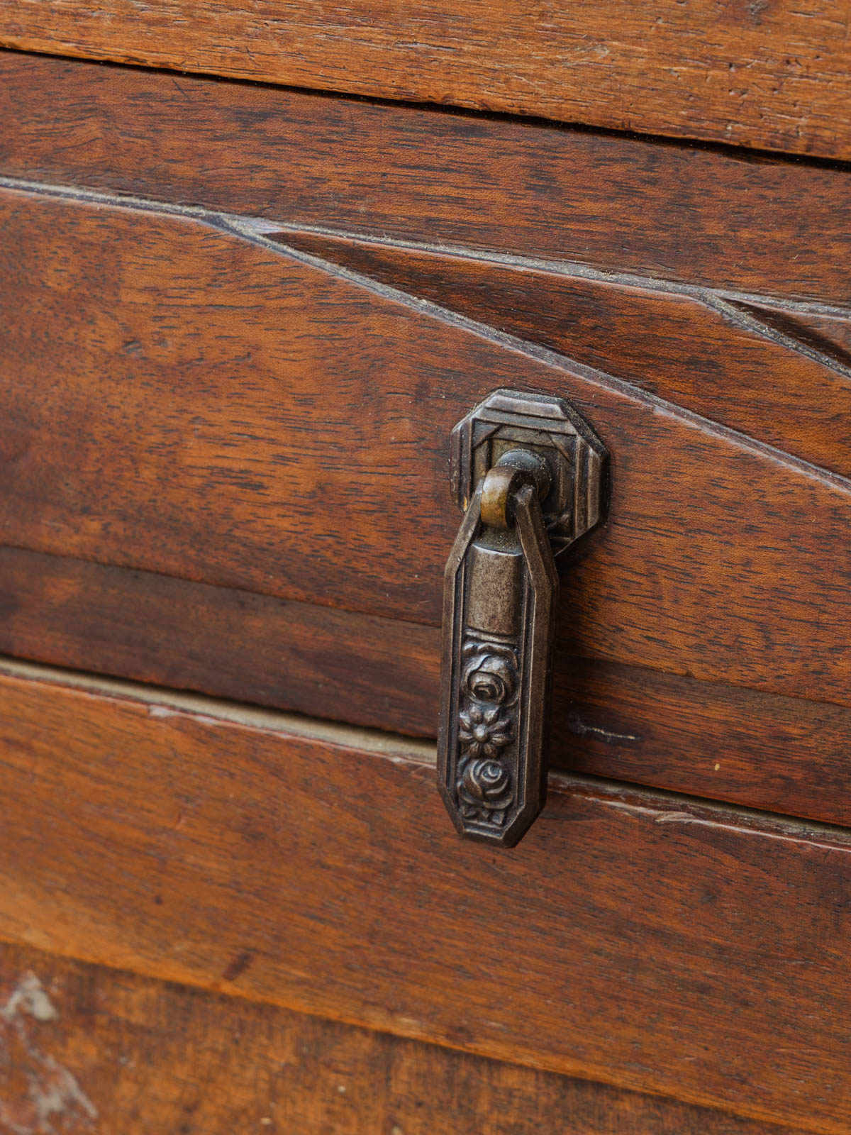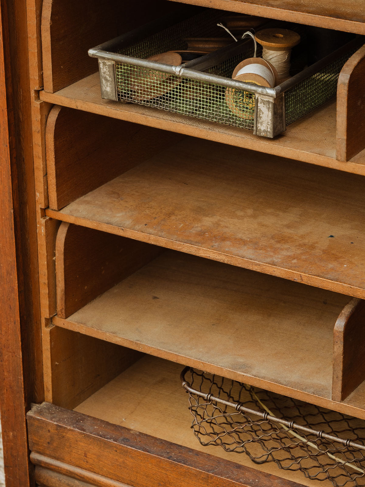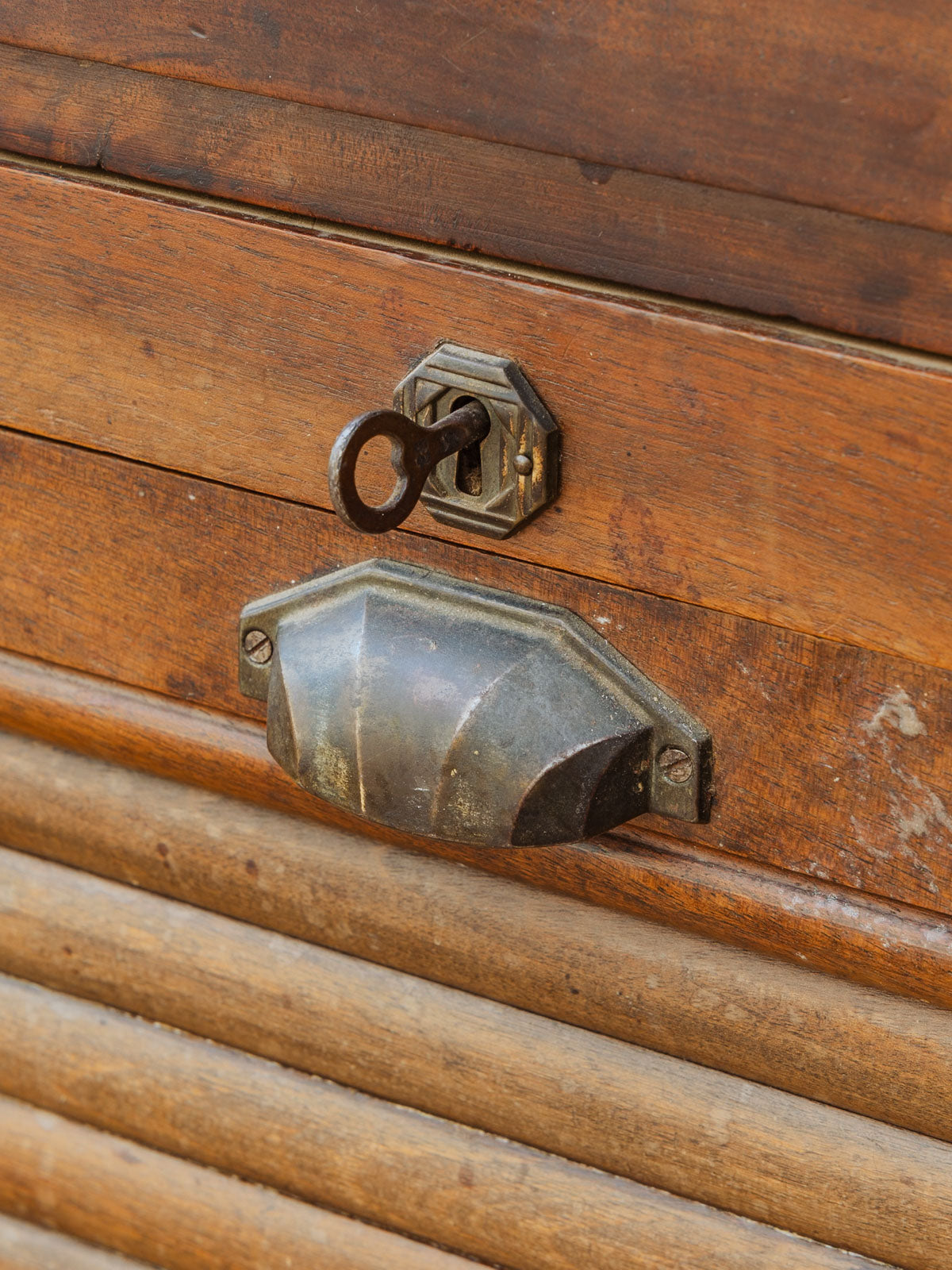 Discover this 1920s Art Deco office furniture, combining elegance and functionality. Its pine upper part has been carefully added, an elegant combination of pine and walnut in the lower part. Its four drawers equipped with metal and brass handles, its niche with sliding tray, and its four removable compartmentalized shelves offer optimal storage space. The keys for the curtain and the drawer add a touch of character to this exceptional piece of furniture. Ideal for an office or a work corner with a timeless style. At the back of the front is a hole that was used to pass electrical cables, it does not detract from the charm and utility of the piece.