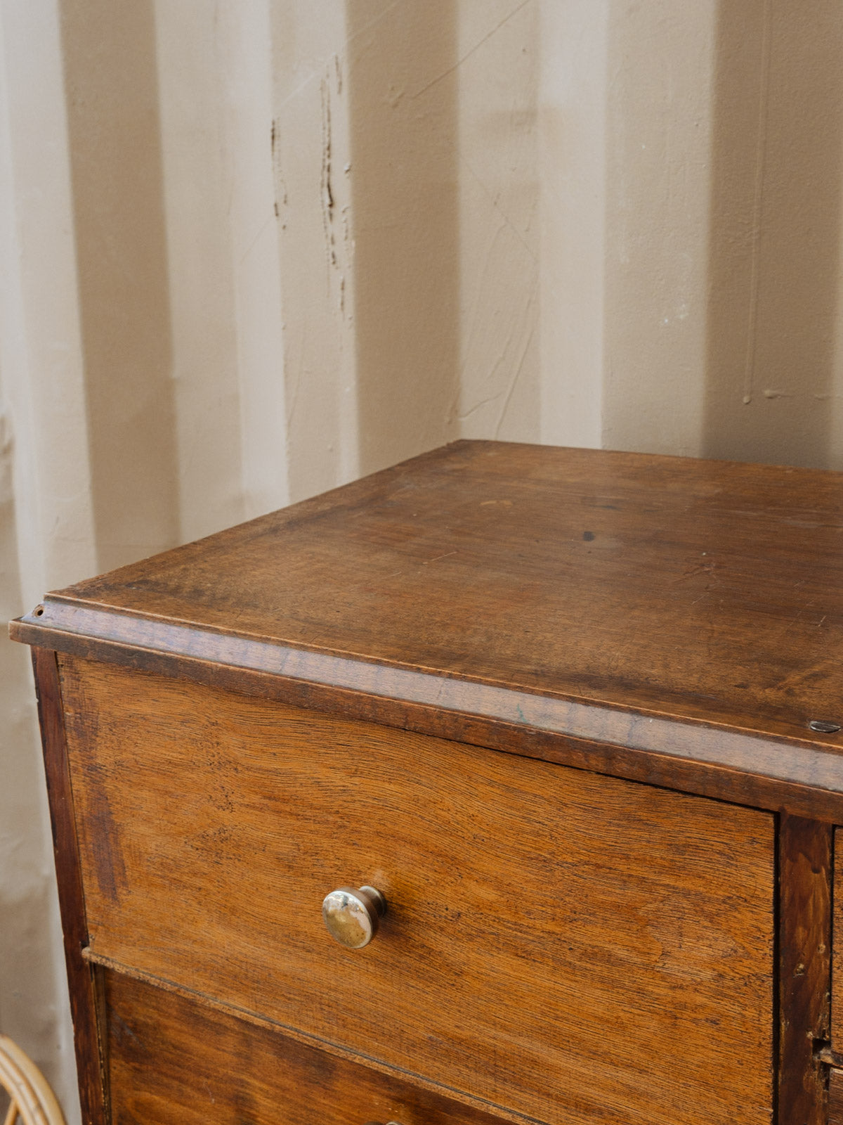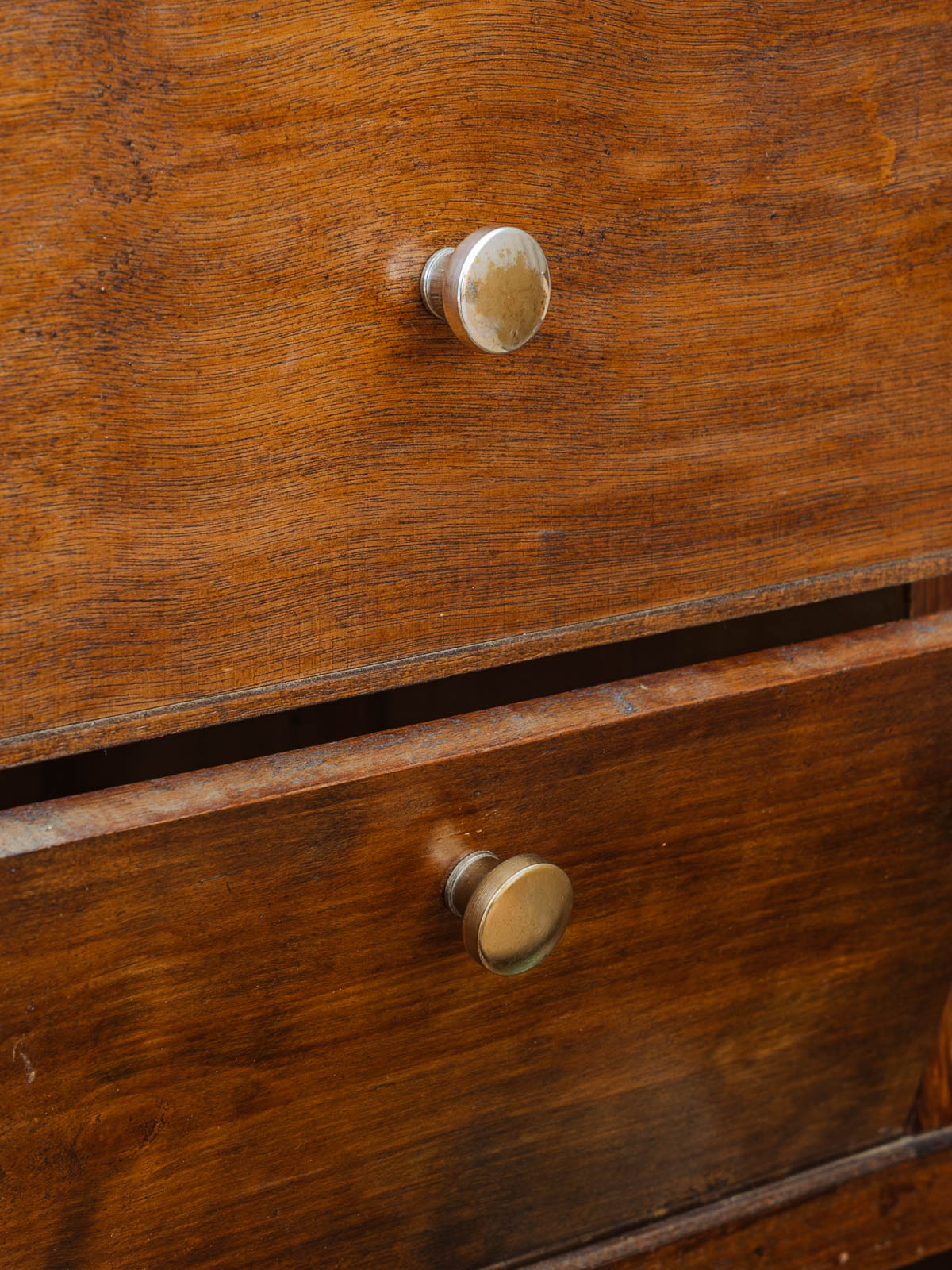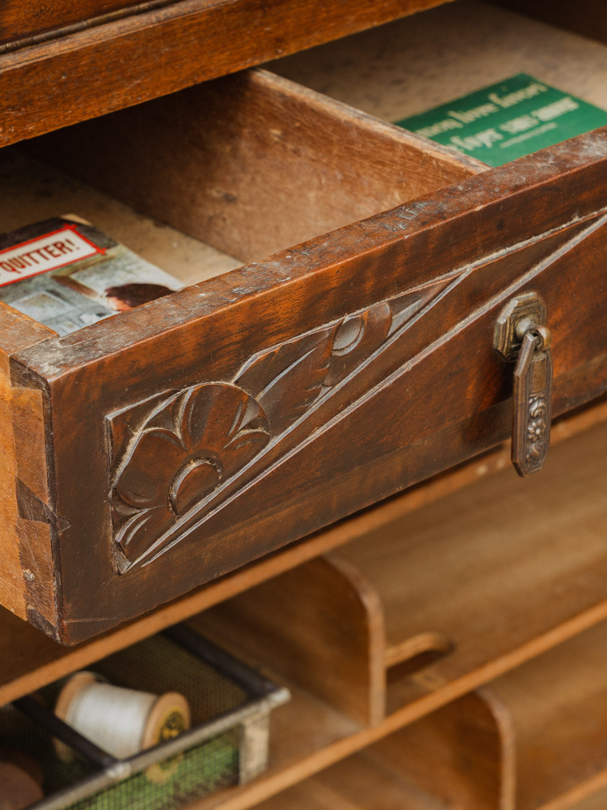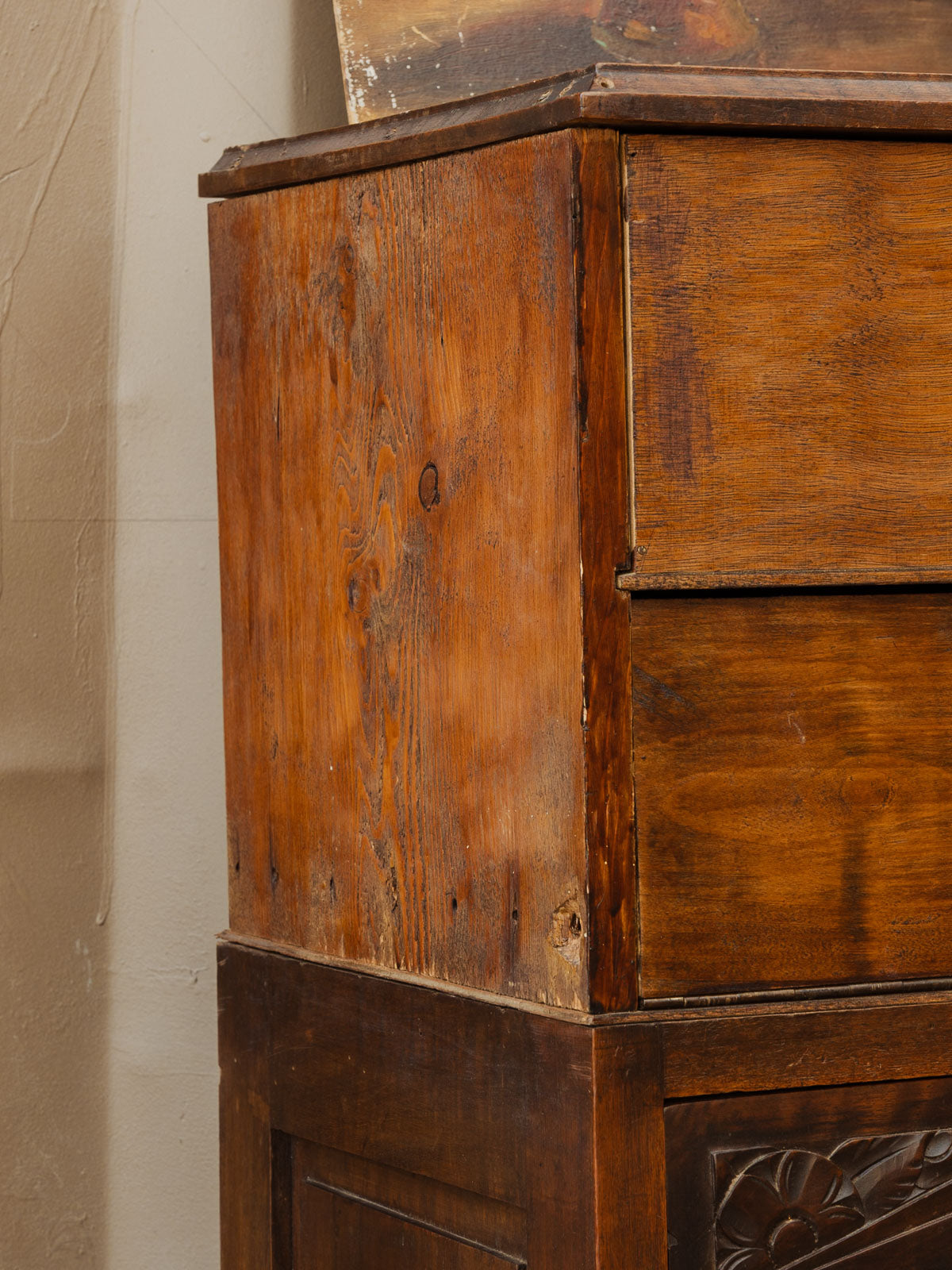 Discover this 1920s Art Deco office furniture, combining elegance and functionality. Its pine upper part has been carefully added, an elegant combination of pine and walnut in the lower part. Its four drawers equipped with metal and brass handles, its niche with sliding tray, and its four removable compartmentalized shelves offer optimal storage space. The keys for the curtain and the drawer add a touch of character to this exceptional piece of furniture. Ideal for an office or a work corner with a timeless style. At the back of the front is a hole that was used to pass electrical cables, it does not detract from the charm and utility of the piece.