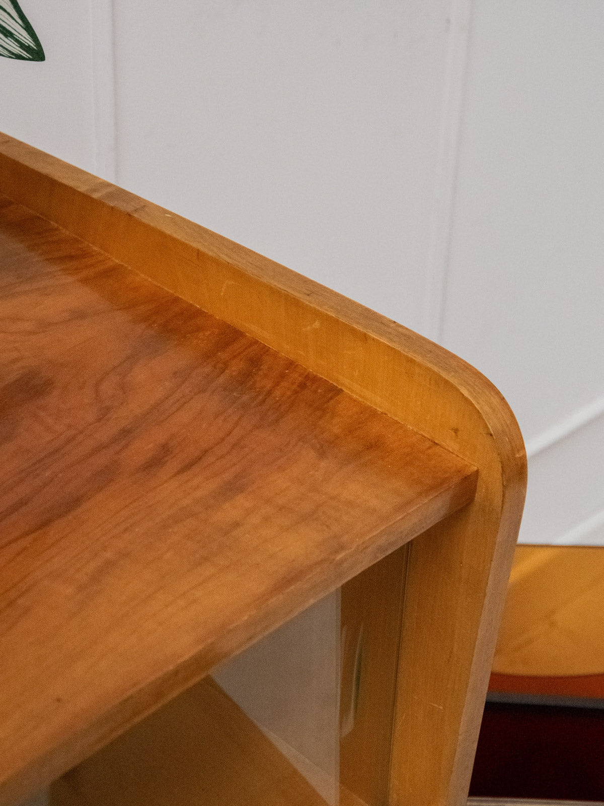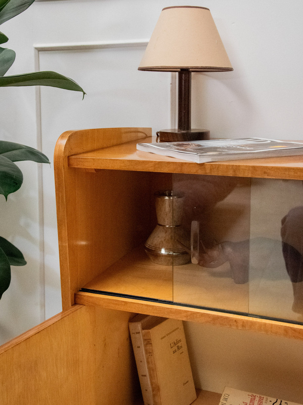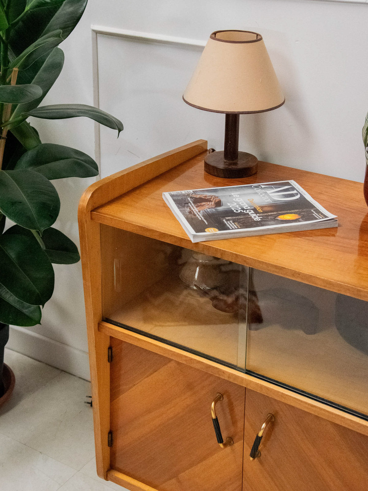 Discover this charming little wooden sideboard from the 50s and 60s, which will bring a vintage touch to your interior. Composed of two parts, it features an elegant glass section to showcase your decorative objects, as well as two wooden doors adorned with brass handles. Ideal as an occasional piece, its timeless design and functionality make it a unique piece that fits perfectly into all styles of decoration. A must-have for lovers of retro furniture!