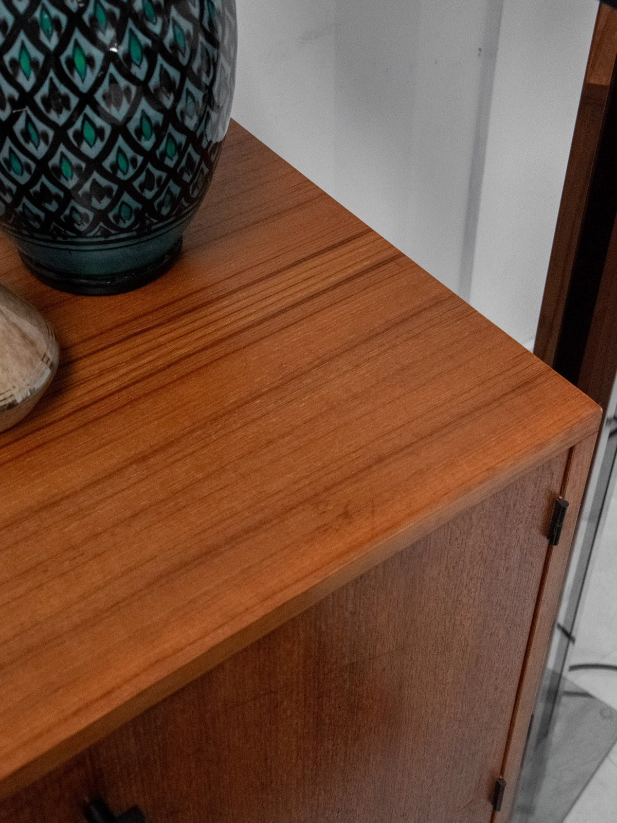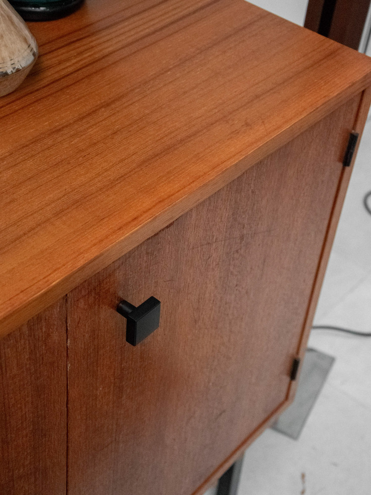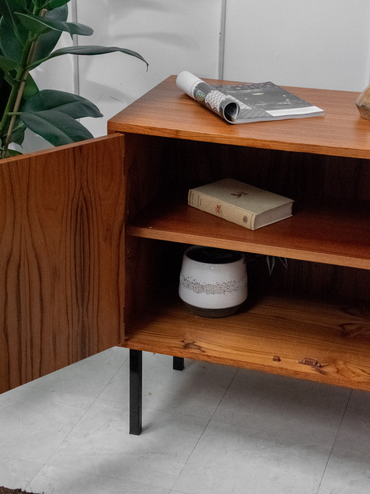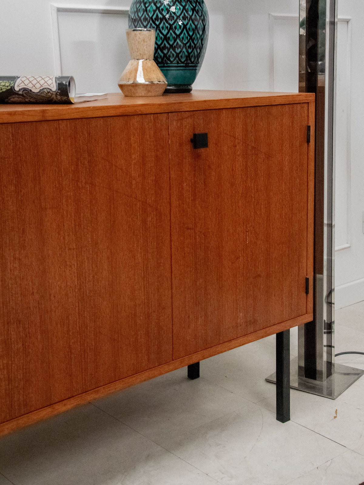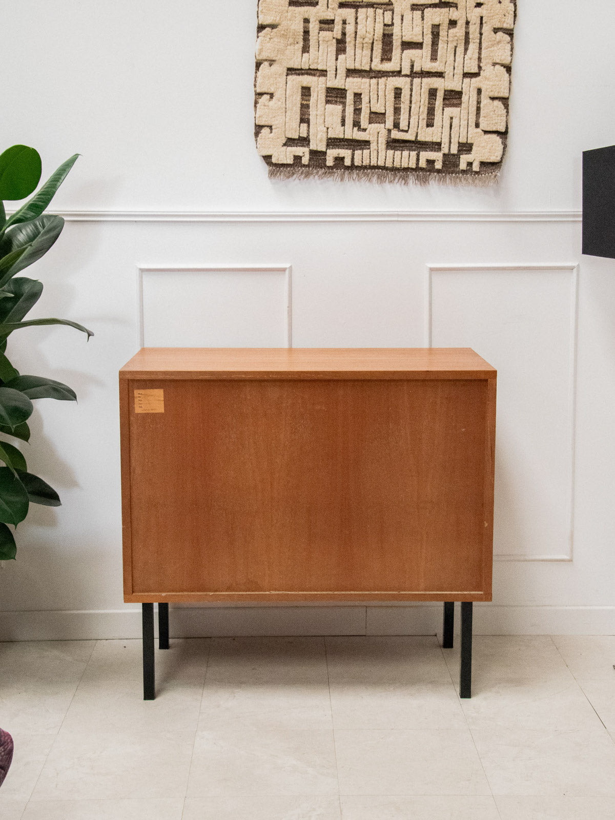 Discover our small, modernist wooden sideboard, clad in an elegant teak veneer. This chic piece features two doors, enhanced by black metal legs and a handle that add a contemporary touch. Inside, a removable shelf allows you to organize your items as you wish. Although this sideboard features a few subtle scratches on the doors, its charm and sleek design will enhance your interior. Add a touch of authenticity to your decor with this unique piece of furniture.