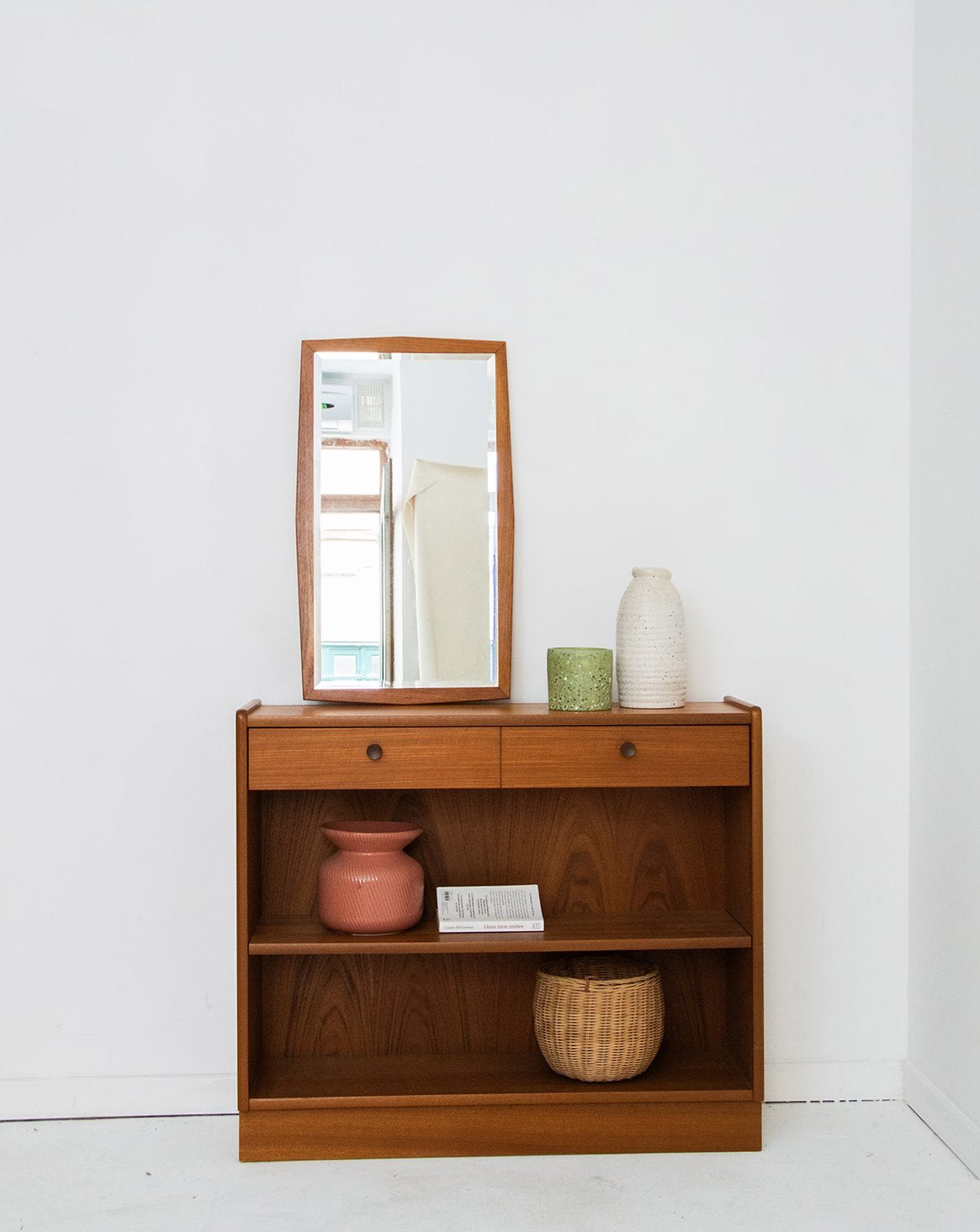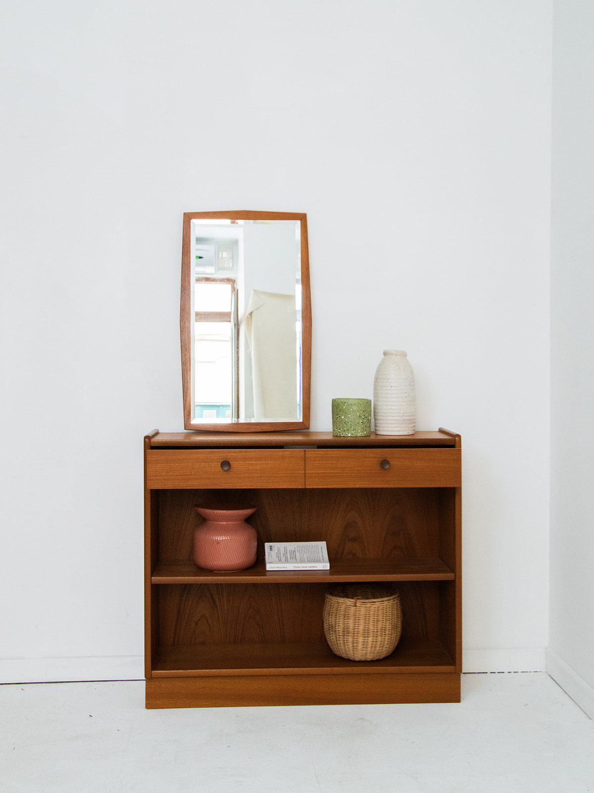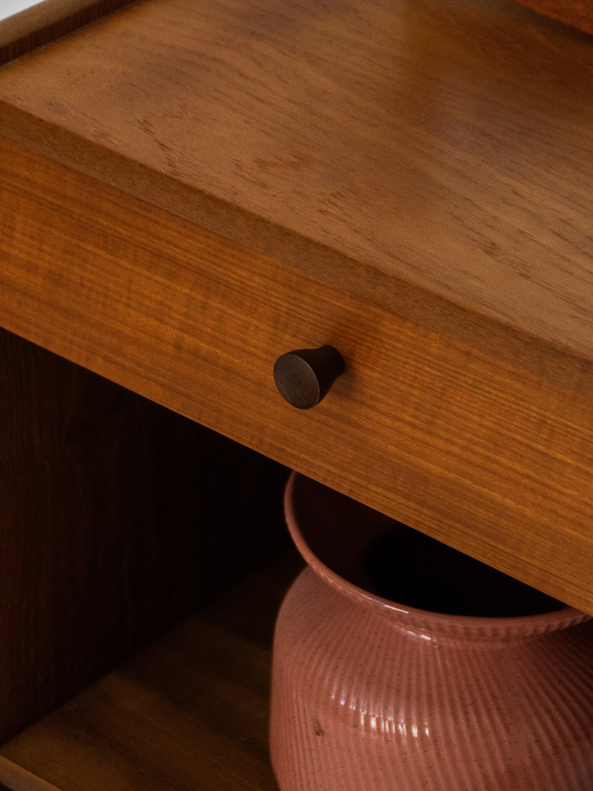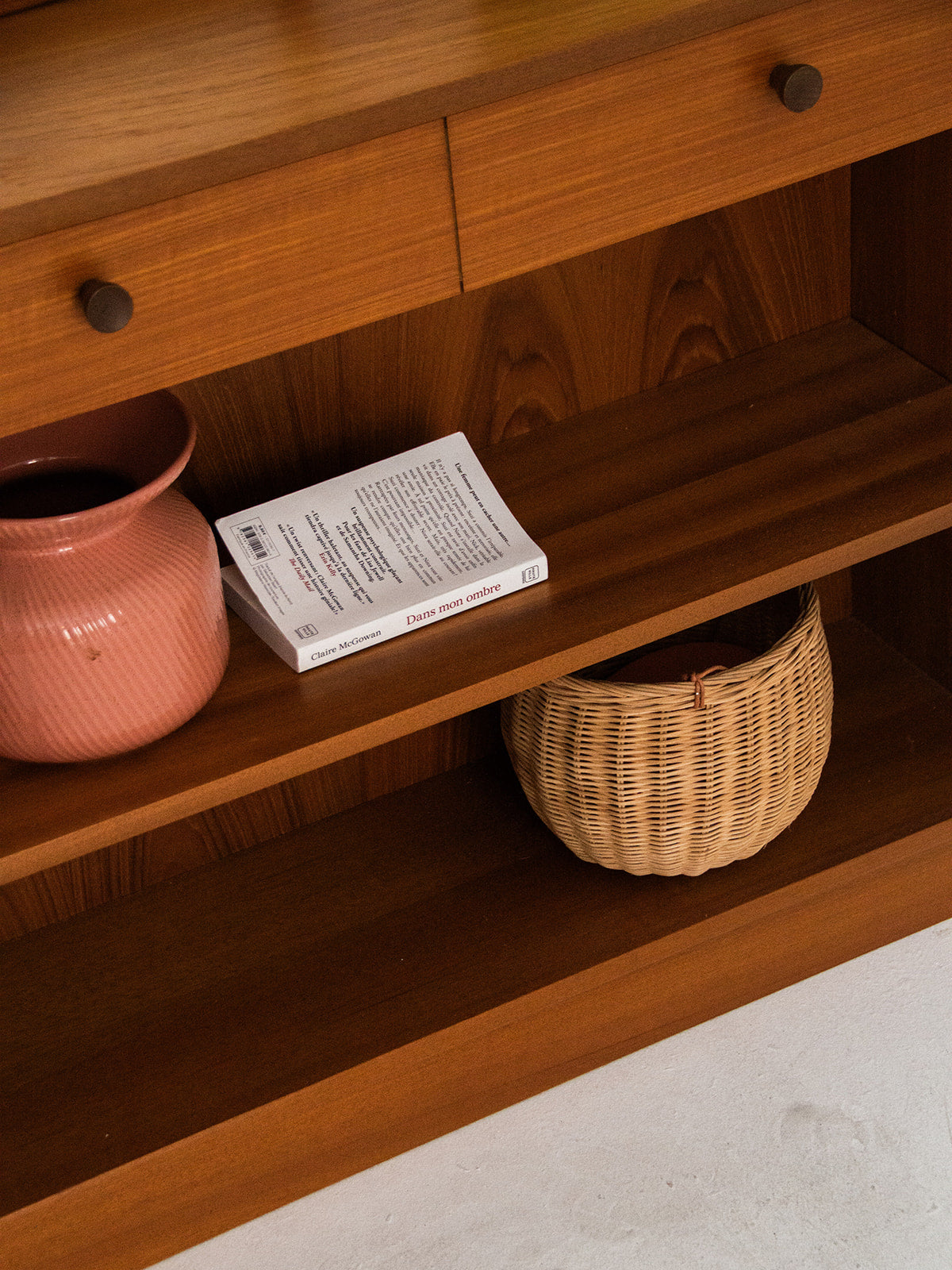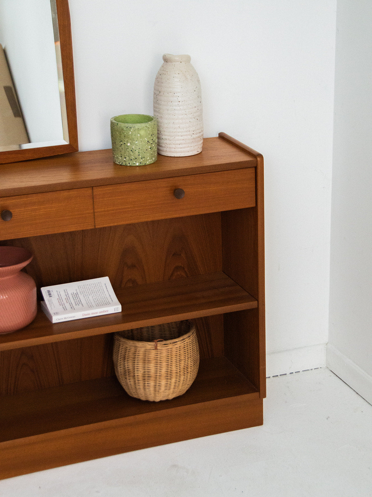 Discover this small vintage teak bookcase/sideboard, a storage unit with an elegant and timeless design, perfect for enhancing your entryway. With its narrow dimensions, it fits easily into any space. Its 1960s Scandinavian style is revealed through its two shelves and large trompe-l'oeil drawer, combining practicality and aesthetics. Bring a retro touch to your home with this unique piece that combines charm and functionality.