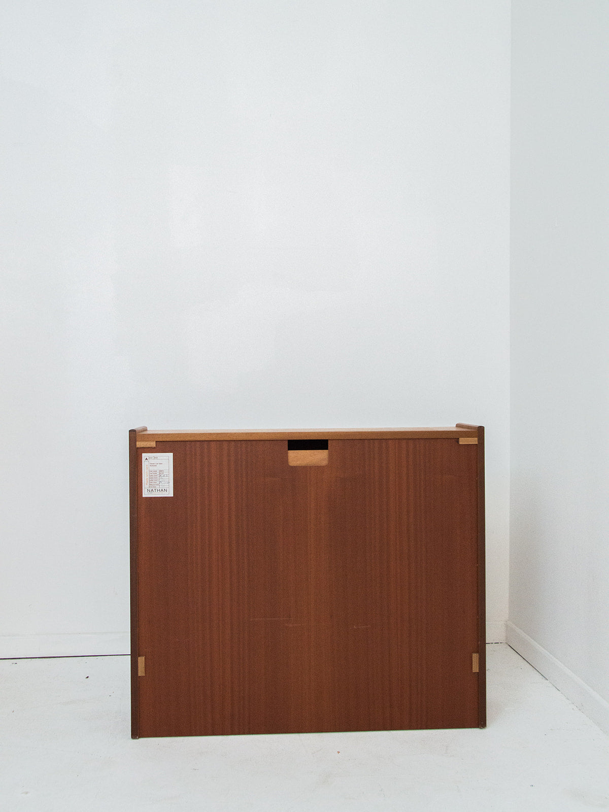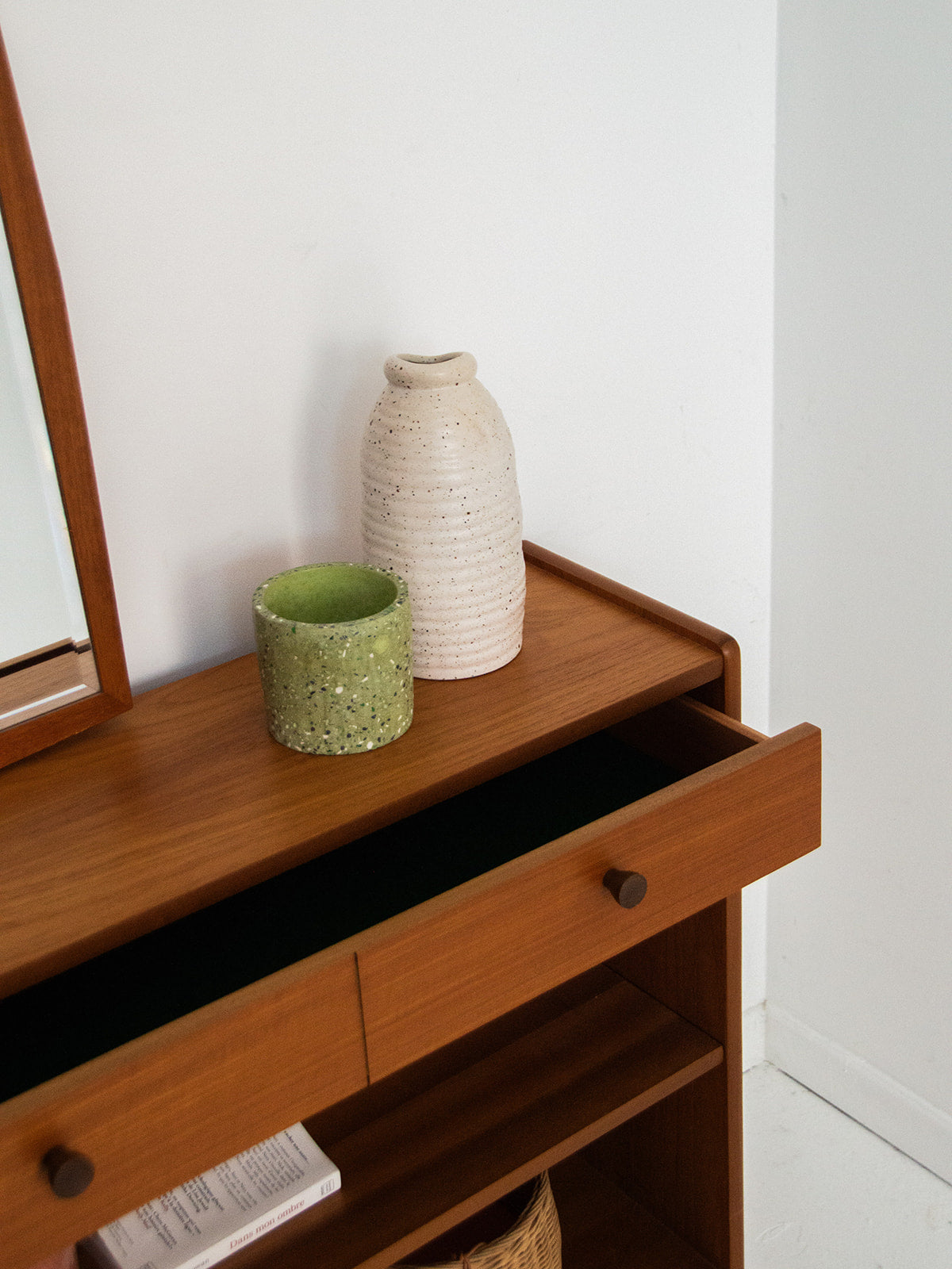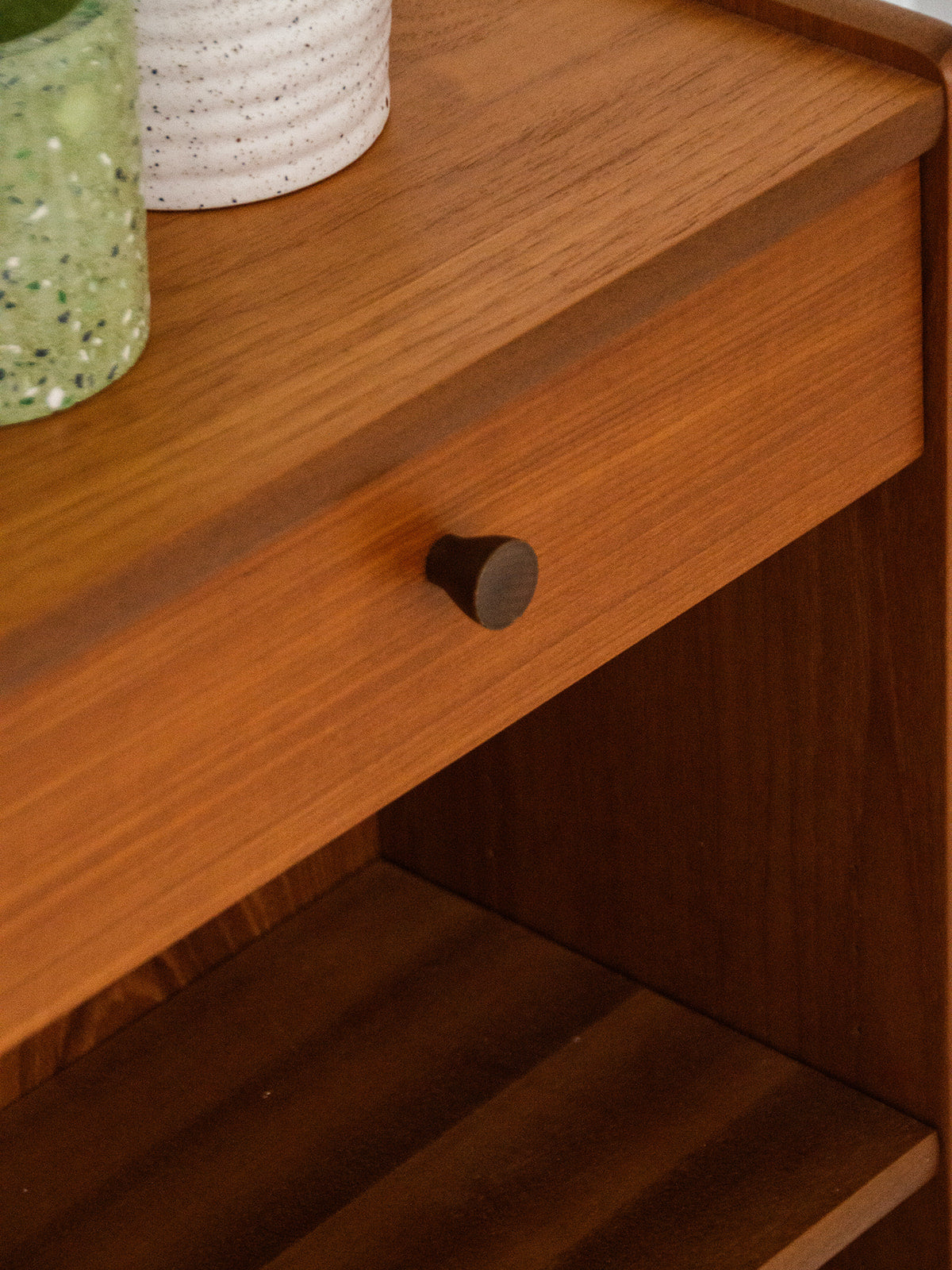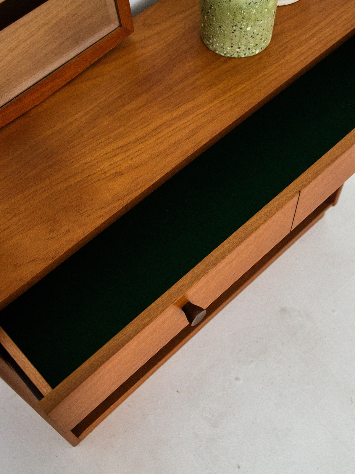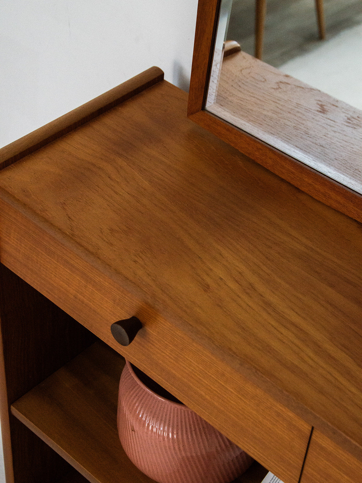 Discover this small vintage teak bookcase/sideboard, a storage unit with an elegant and timeless design, perfect for enhancing your entryway. With its narrow dimensions, it fits easily into any space. Its 1960s Scandinavian style is revealed through its two shelves and large trompe-l'oeil drawer, combining practicality and aesthetics. Bring a retro touch to your home with this unique piece that combines charm and functionality.