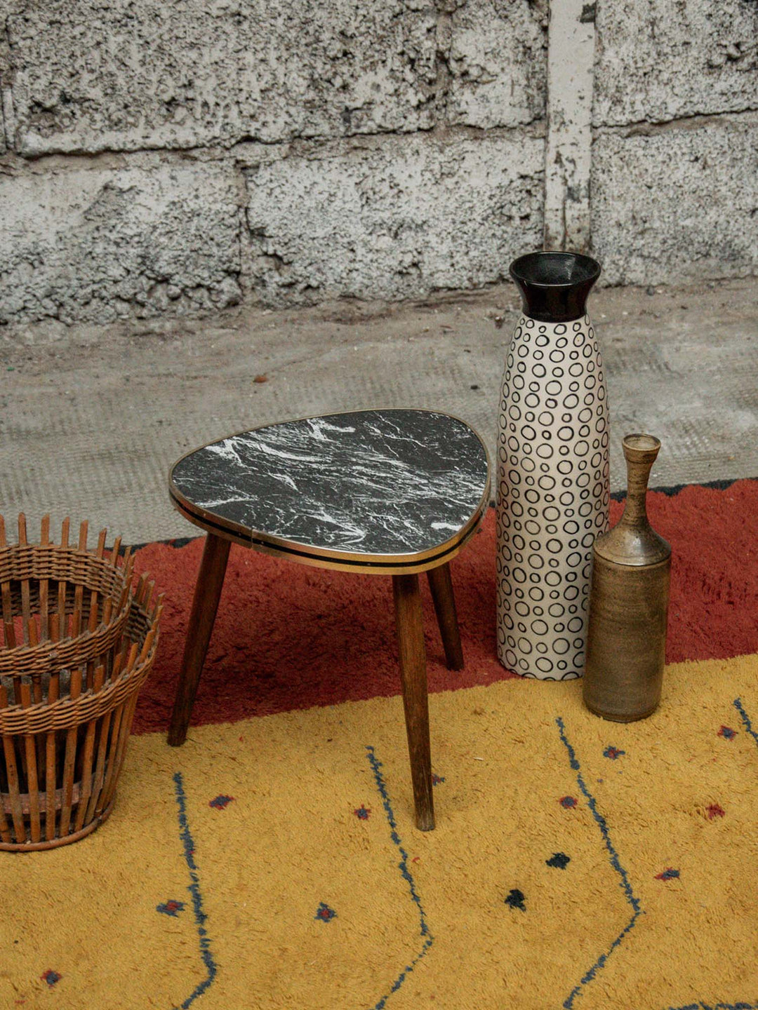 Bring a touch of elegance to your home with this boldly designed tripod plant stand/side table. Its triangular marble-effect Formica top enhances the modern lines, while the compass legs ensure optimal stability while adding a retro touch. Ideal for showcasing your favorite plants or simply as a stylish side table, this piece combines aesthetics and functionality for a stylish interior.