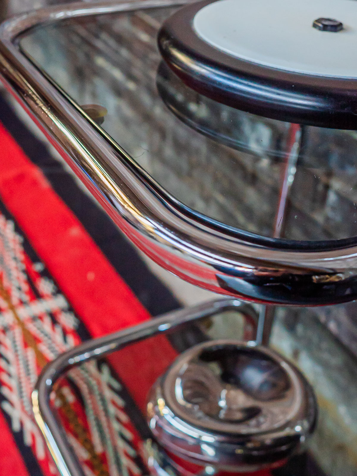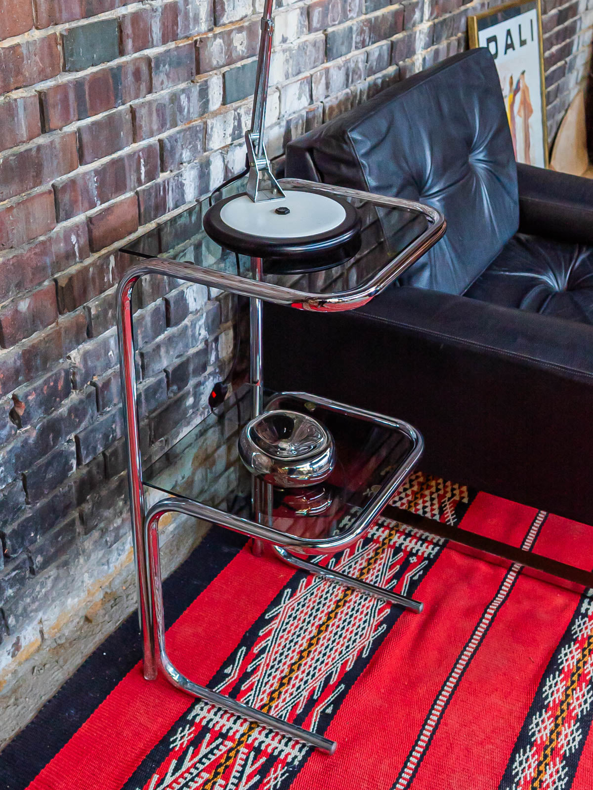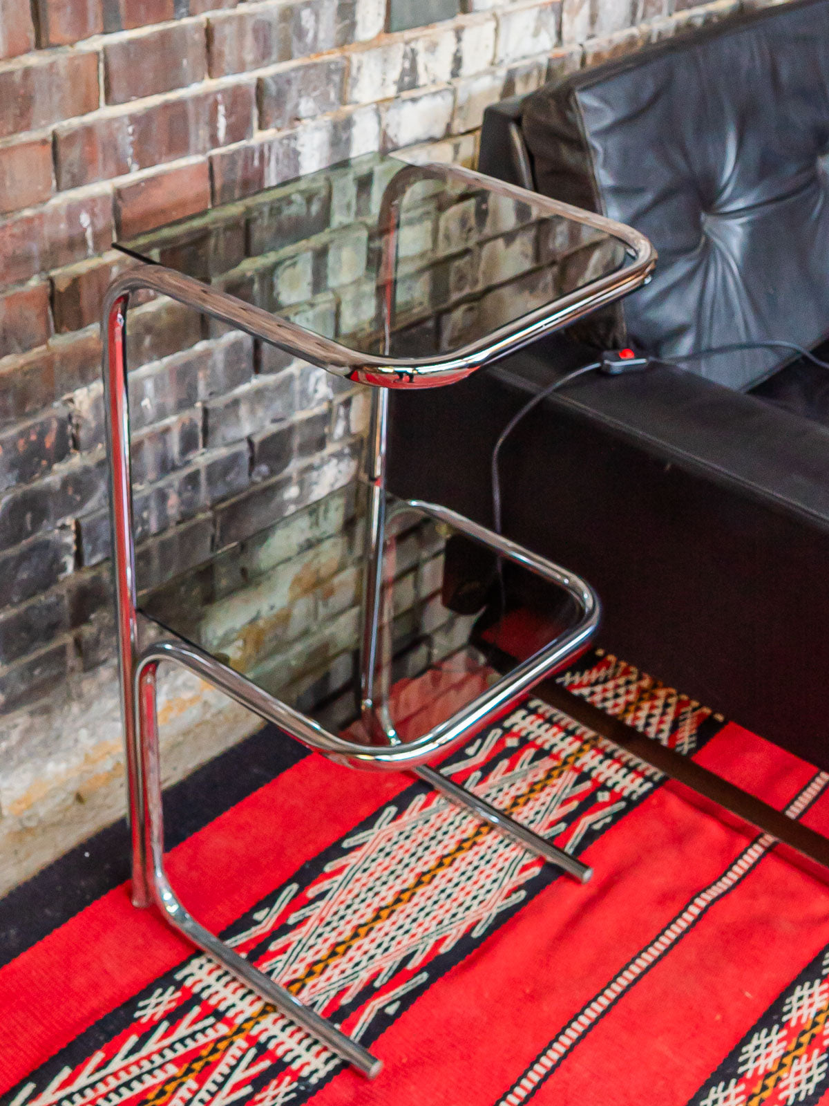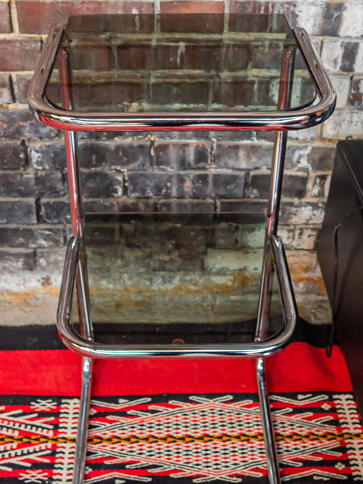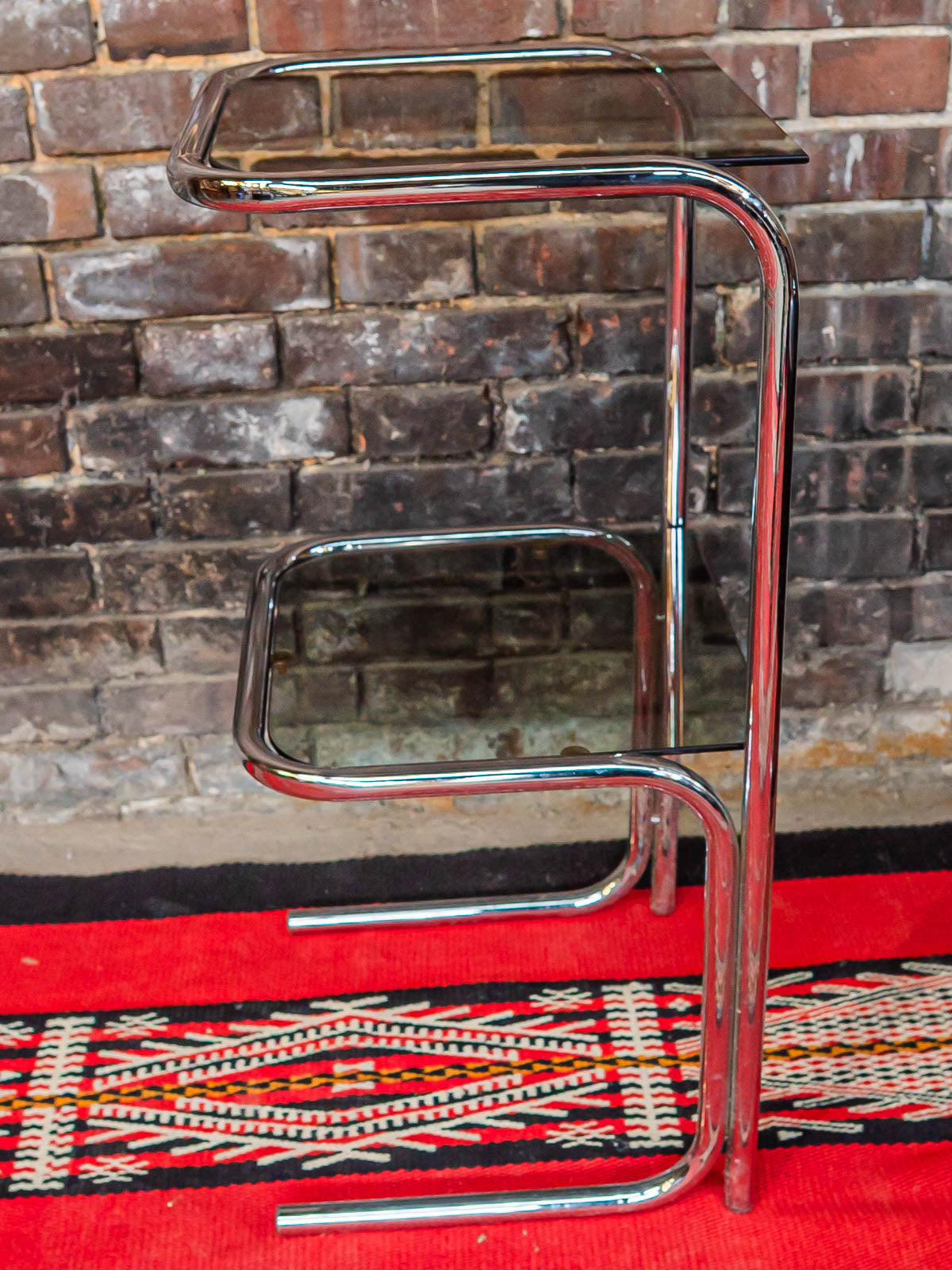 Discover this elegant 80s side table, combining retro style with modern functionality. With its two levels of smoked glass tops, it offers an ideal space to showcase your decorative objects or favorite books. Its chrome-plated metal legs add a touch of shine while ensuring perfect stability. A must-have asset to add a touch of sophistication to your interior.