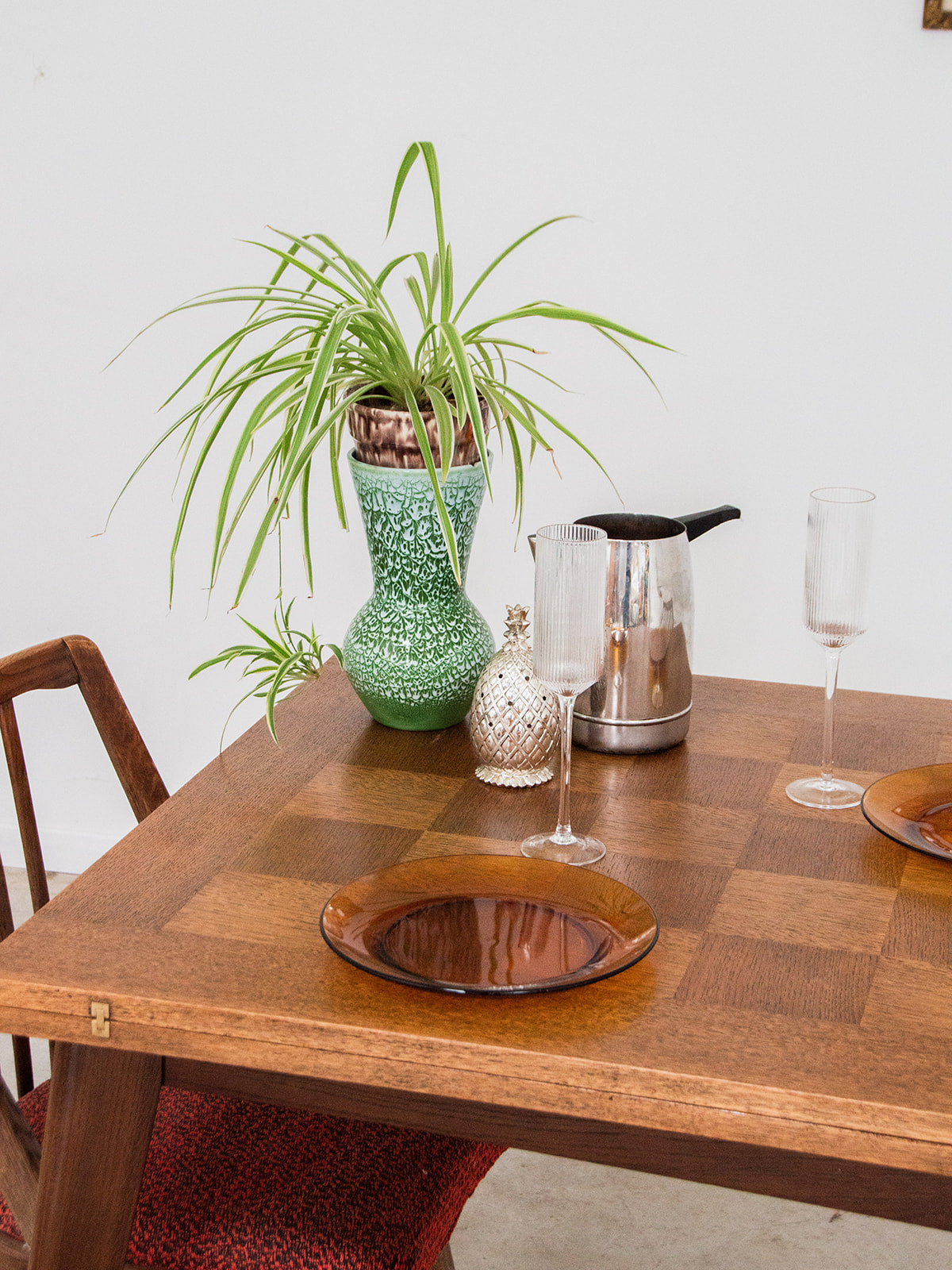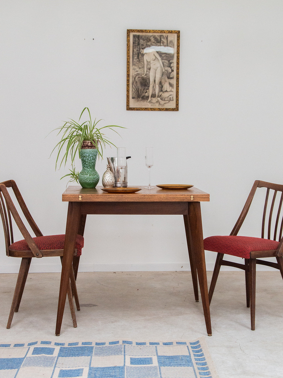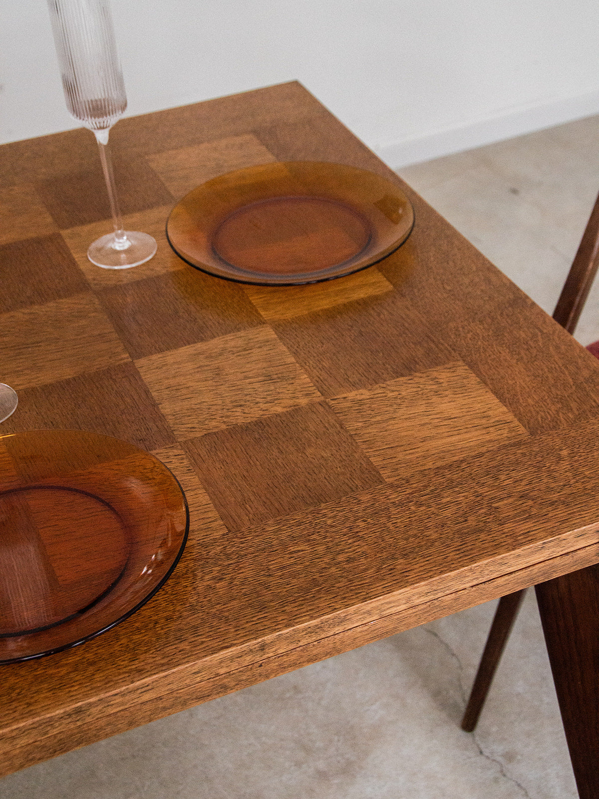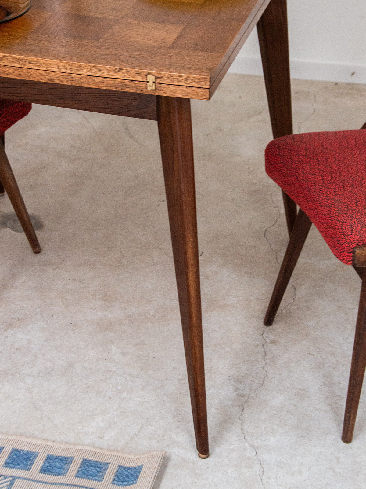 Practical and original, this dining or games table captivates with its swiveling, fold-out top decorated with graphic tiles. Its spaced-apart dark wood compass legs provide stability and retro charm. Inside, a compartment with worn red fabric provides discreet storage space. Ideal for seating up to 6 guests, it combines style and functionality in your living room or dining room.